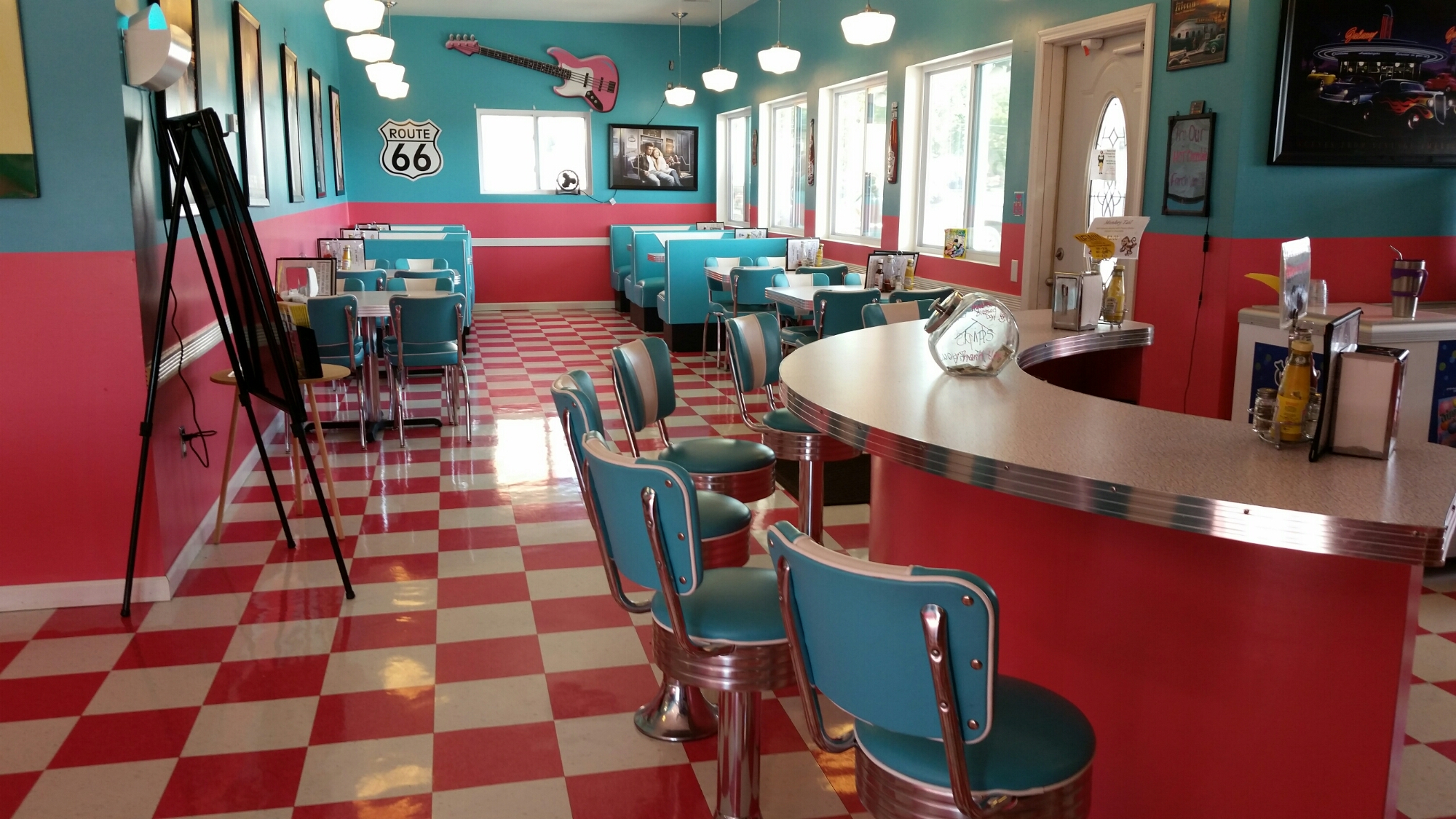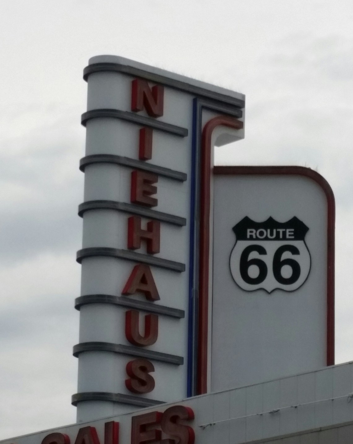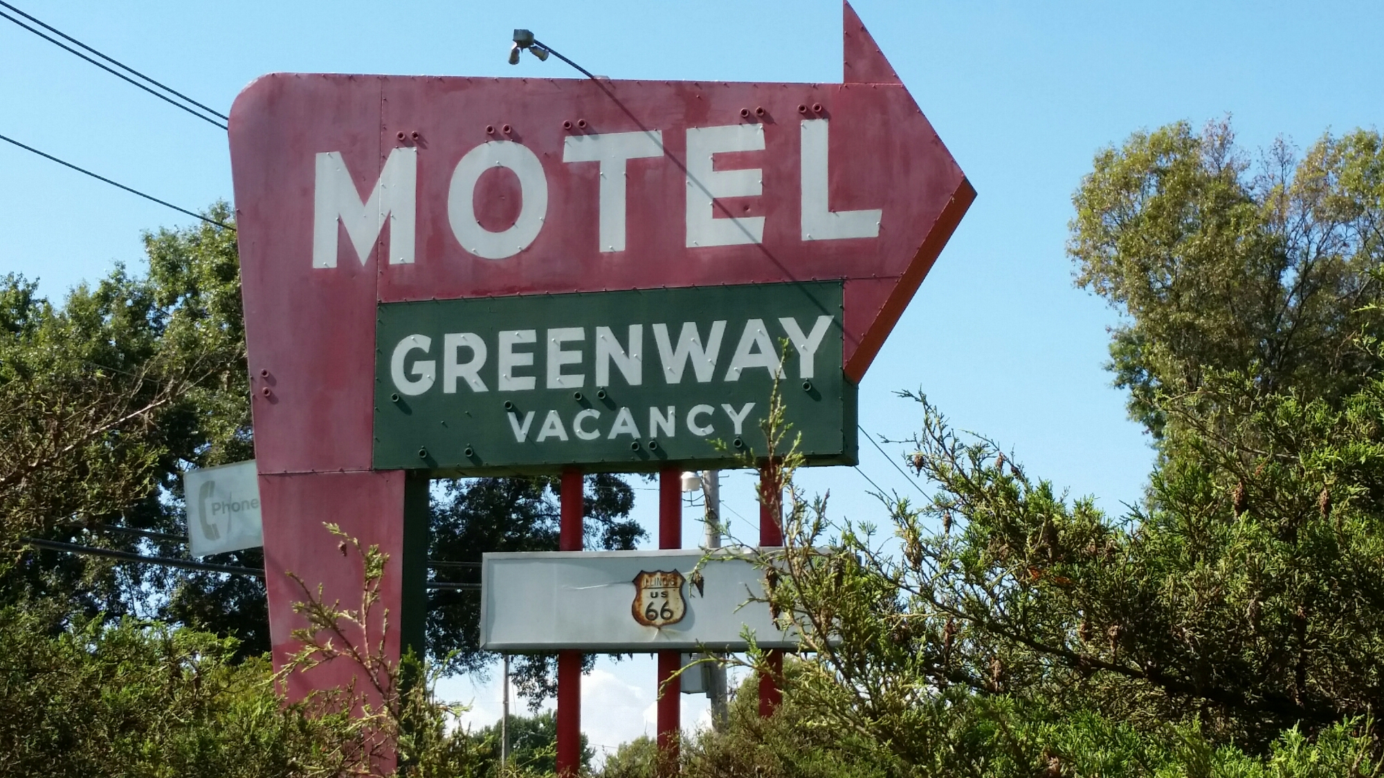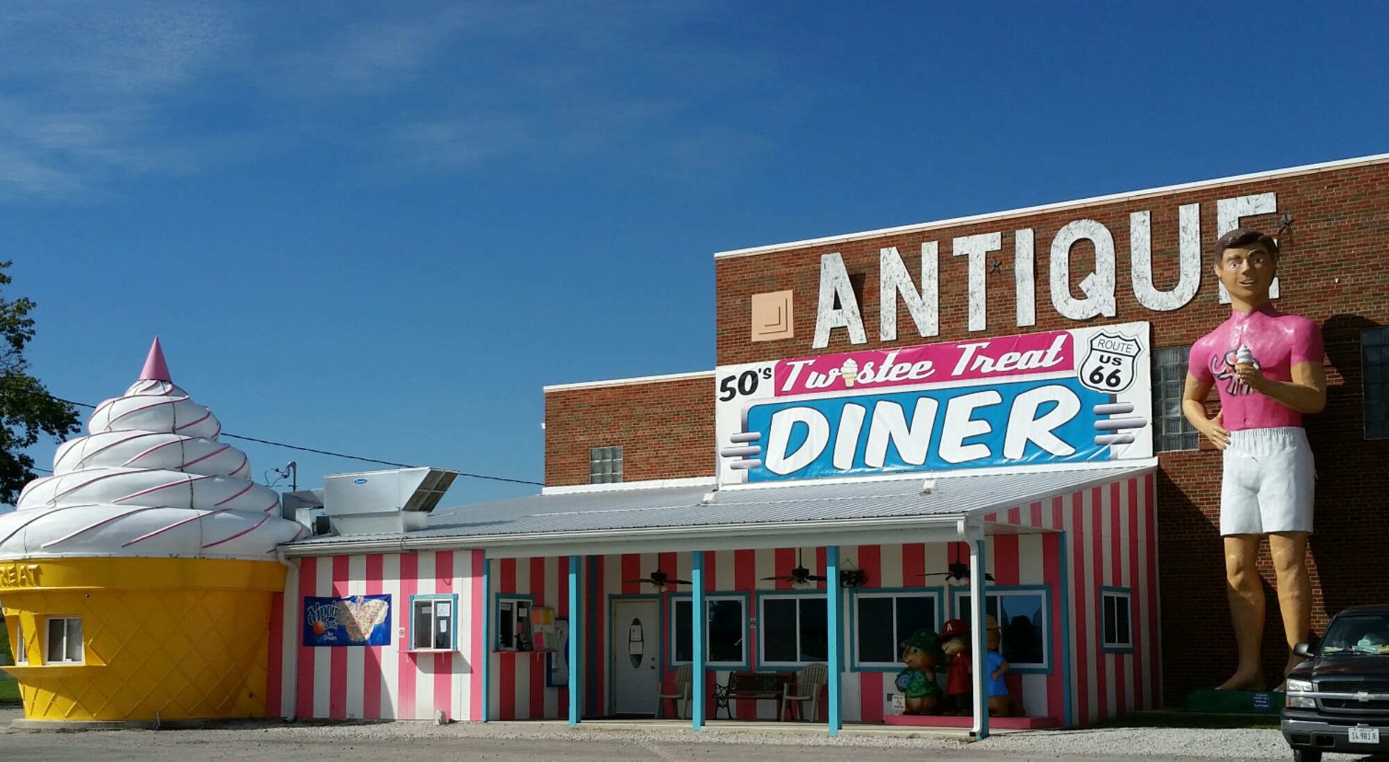 Now, on my way to Hamel, I detoured to go to the the Pink Elephant Antiques. Oh my goodness the goodies that were there. A giant surfer, a giant Harely Davidson muffler man without his muffler, of course a Pink elephant, a 50’s ice cream joint and the huge array of collectibles. I spent a little time here but I came out empty handed. Time to get back on the road! I passed St Pauls Lutheran Church which has a neon cross at the top. The original 1937 Tourists Haven in Hamel is now the home of Weezy’s Route 66 Grill.