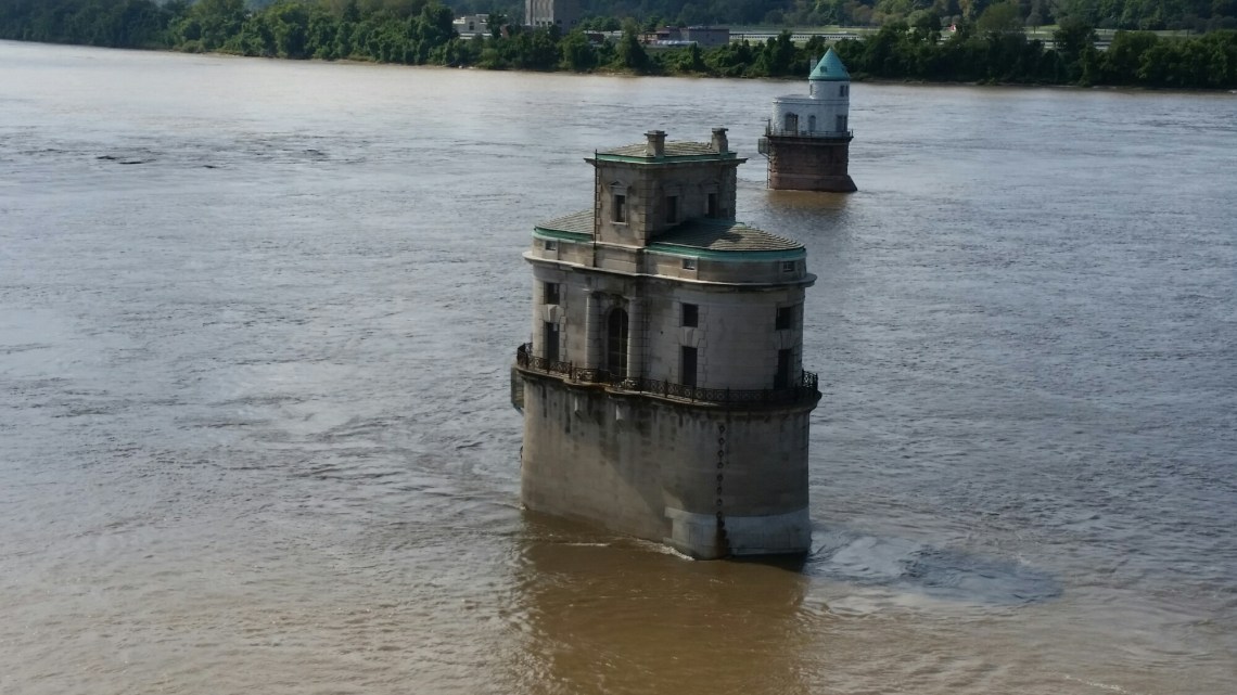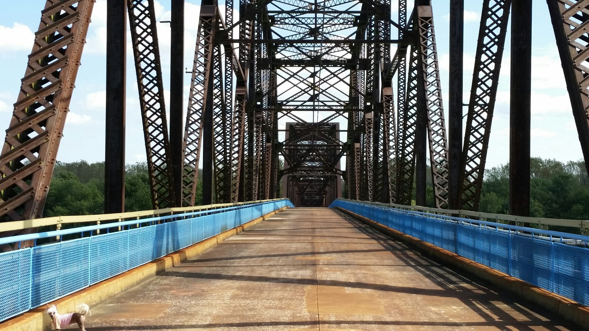 Before driving into St Louis I decided to check out the Chain of Rocks Bridge. This bridge, part of the original Route 66, crosses the Mississippi River and is one mile across from Illinois to Missouri. There were these stone buildings in the Mississippi but I have no idea what they are. So after our walk out to the middle of the bridge and back, Frannie and I needed a big cold water!