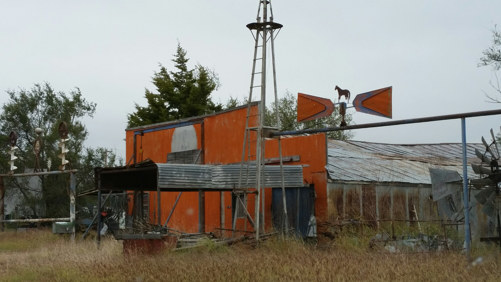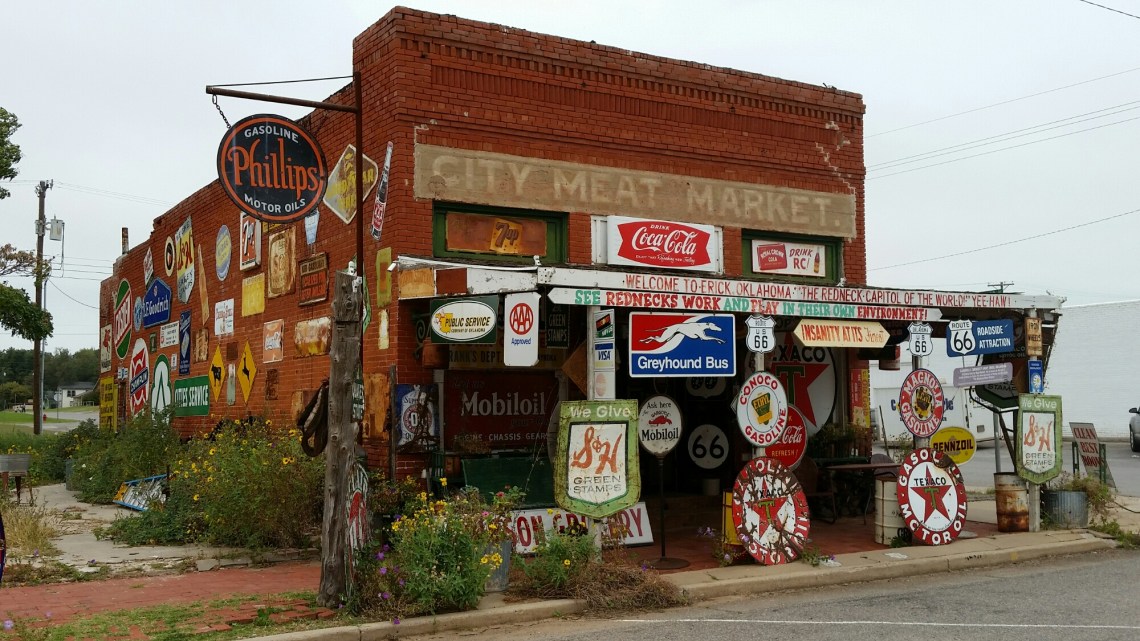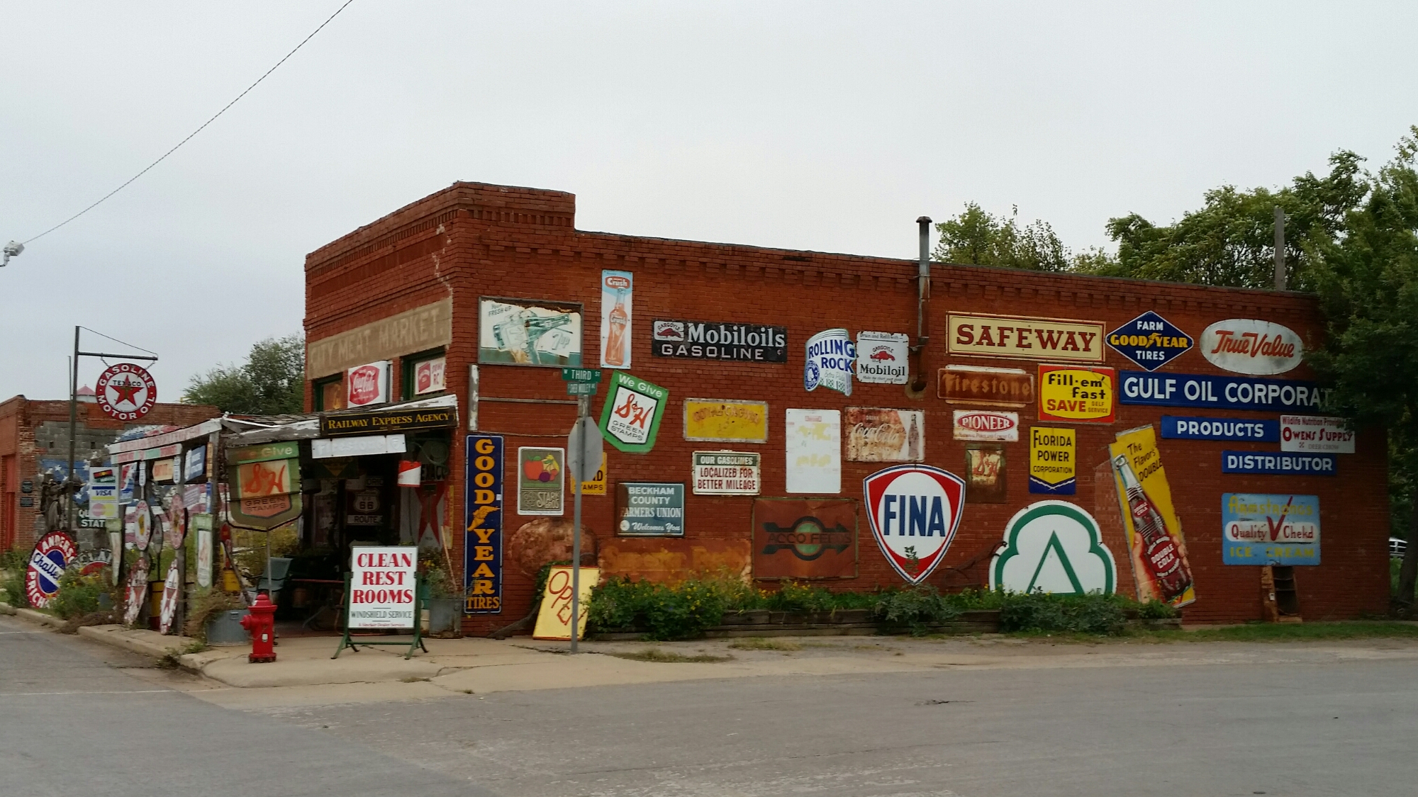 Erick OK is the home of Roger Miller (King of the Road fame) and Sheb Wooley (Purple People Eater).  Seriously, I stood in the middle of downtown and there was not a soul around.  I took pictures of both Museums from the center of the intersection.  I found this building with all theses signs, on the front it says “Welcome to Erick Oklahoma Redeck Capital of the World Yee Haw”!