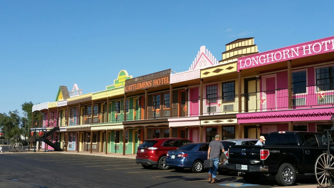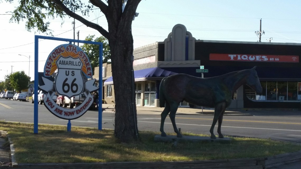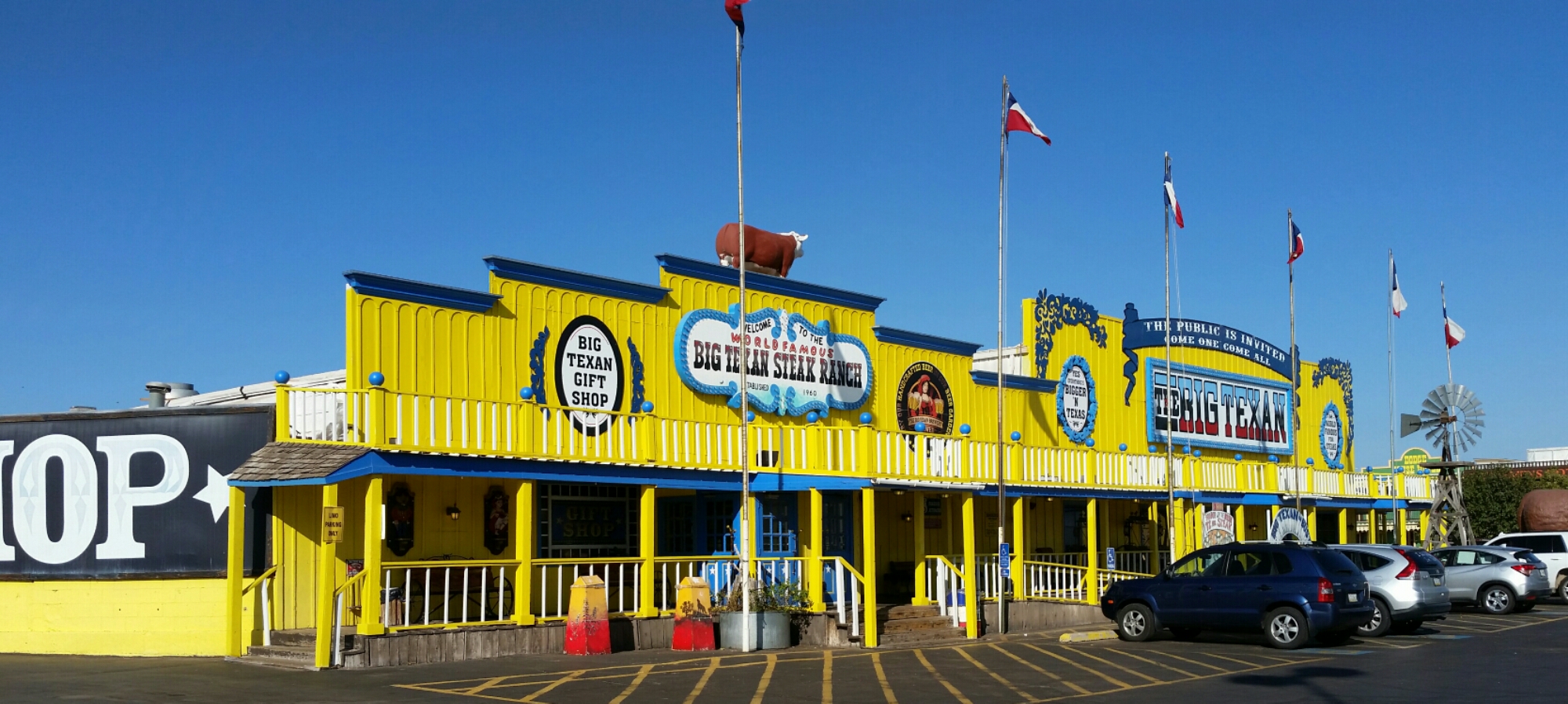 Amarillo by evening not morning!  First stop, the Big Texan, where you can have a 72 ounce steak free if you can eat it in one hour!  No way for me, I’ve already had my red meat this week!  It was though a very neat place to see.  There was a big open type bar out back, the restaurant, slot machines, a motel and you guessed it, a gift shop.  The rest of the pictures I took driving through Amarillo on the historic 66, 6th Ave were alot of the building had been refurbished for other purposes.  I did find one business that had a date on the building back to 1910.