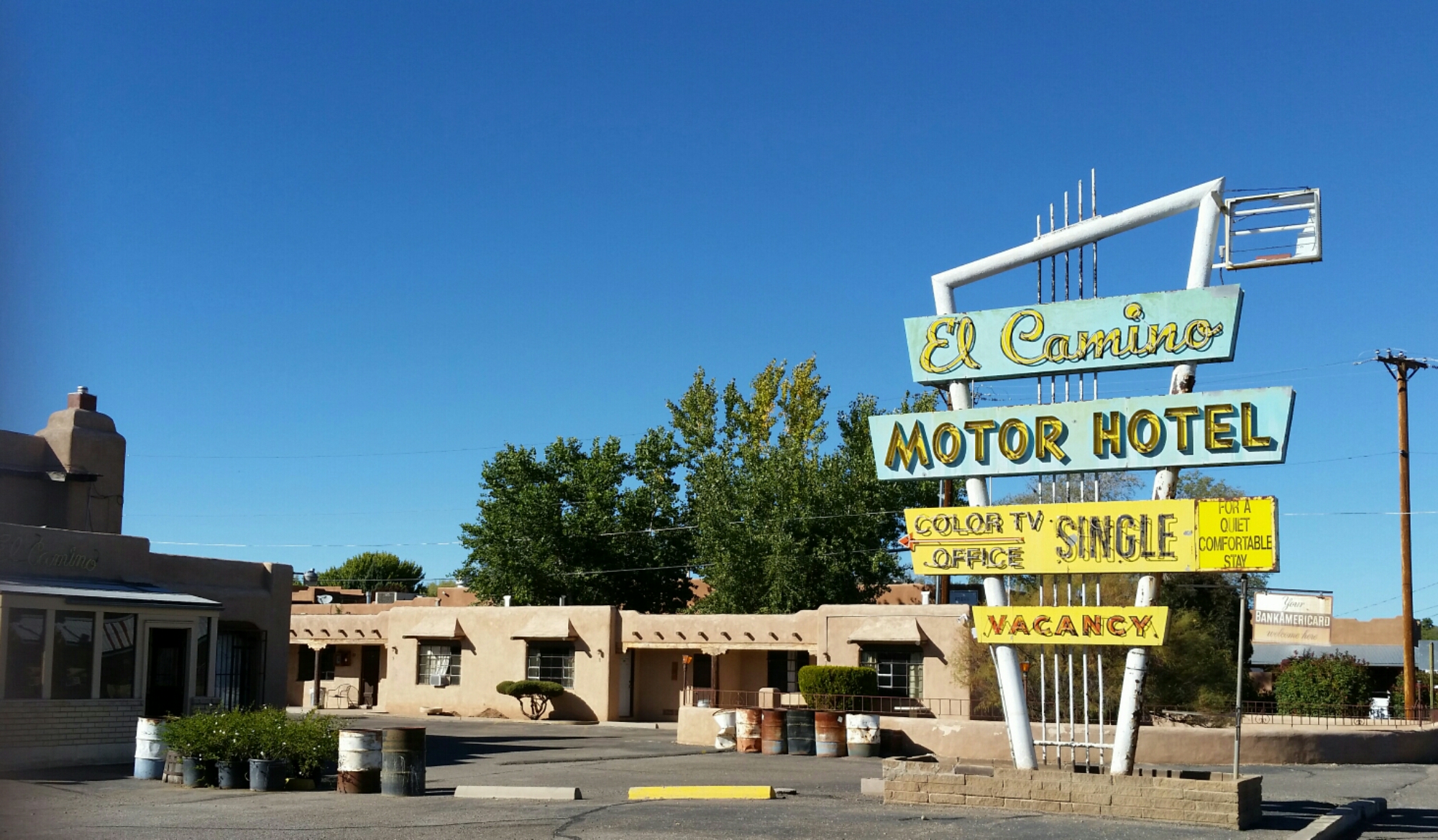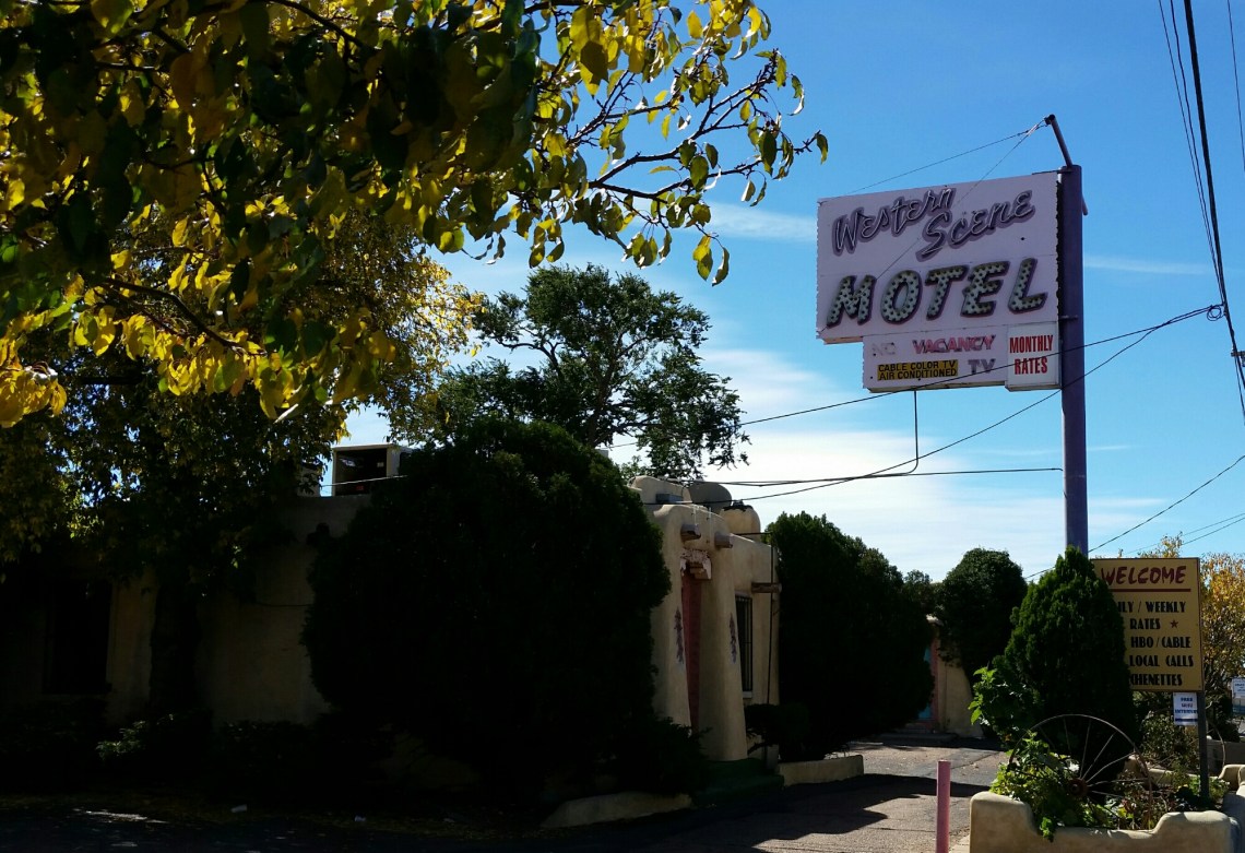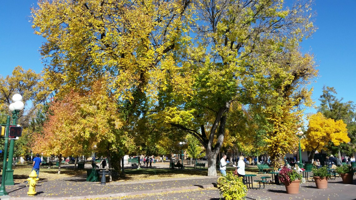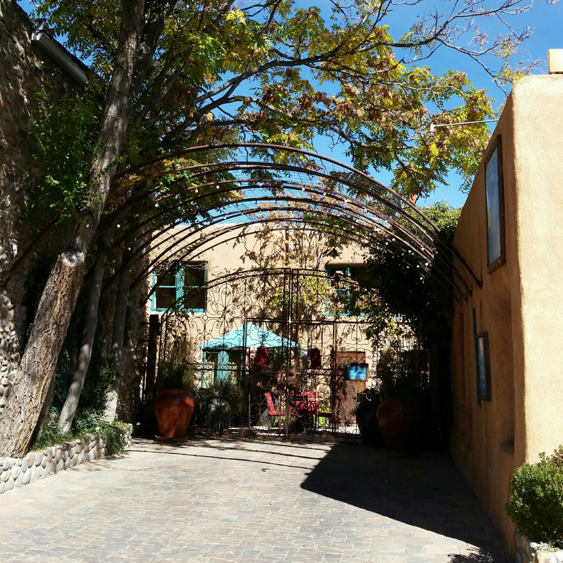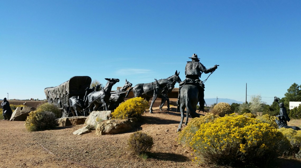 Good Morning Santa Fe! Time to explore! I started my morning with a great view of the mountains. Headed into town, I saw a sign for Museum Hill…ok I am game but just too early again. They had several different museums to include a 14 acre botanical gardens. I then headed to the downtown area and found a place to park. I visited the San Miguel Church which is the oldest church in the US with the oldest Bell which was covered with pendants of all sorts, the church was small but beautiful (1610). Adjacent to the church was the oldest house (1610). I also found tons of shopping at the plaza and it was a beautiful fall day here. I visted the state capital building and found some interesting sculptures. While I was walking around I found the Loretto Chapel and another church and the Palace of the Governors. On my way to the car I visted an open market and bought me a queen size mink blanket. Making my way back to Route 66 I passed the EL Rey Inn, the Kings Rest Court and the Western Scene.