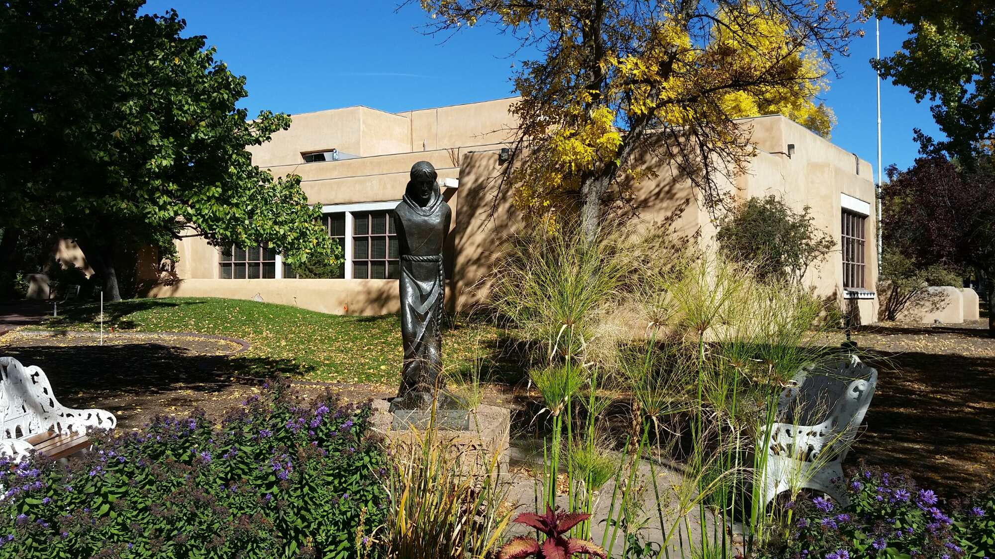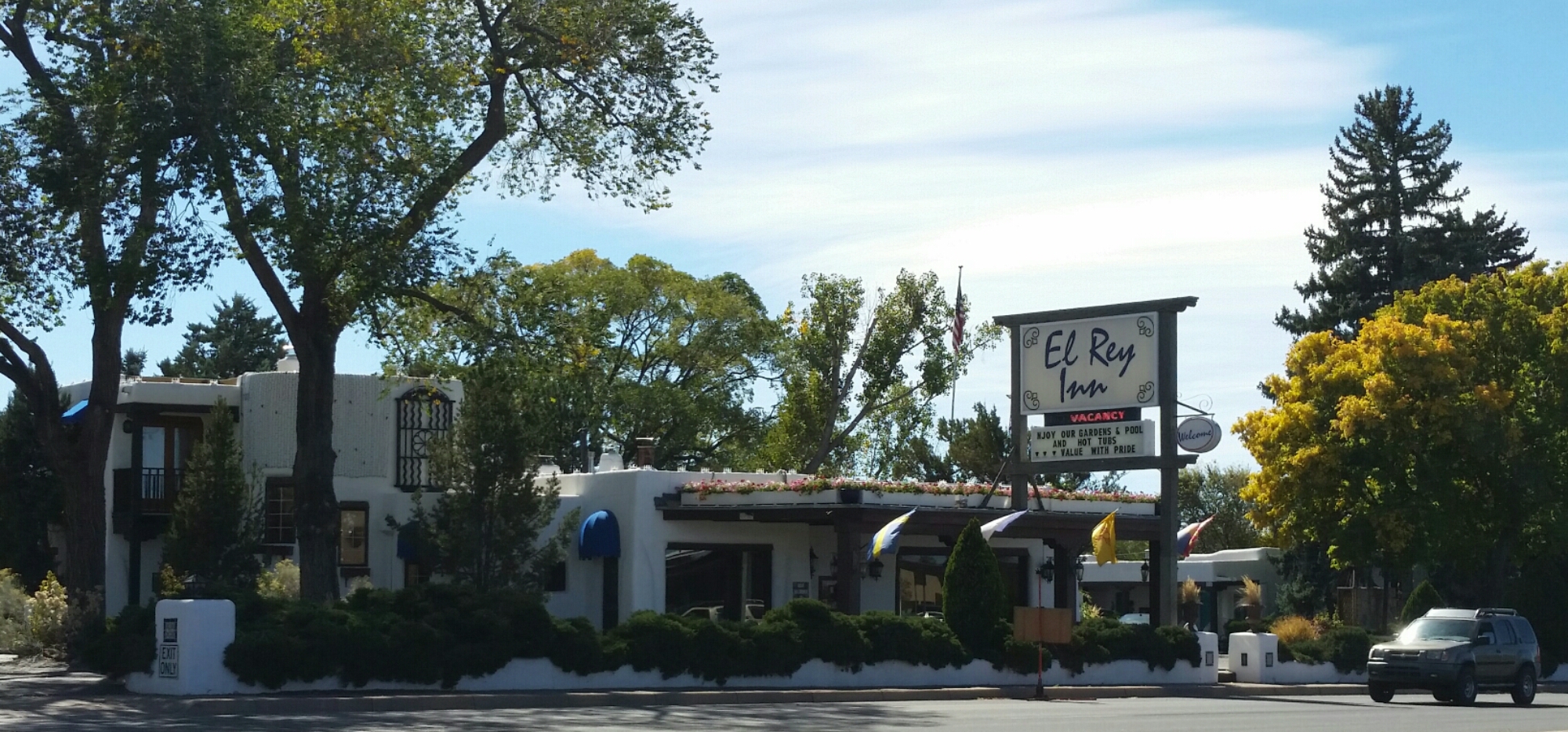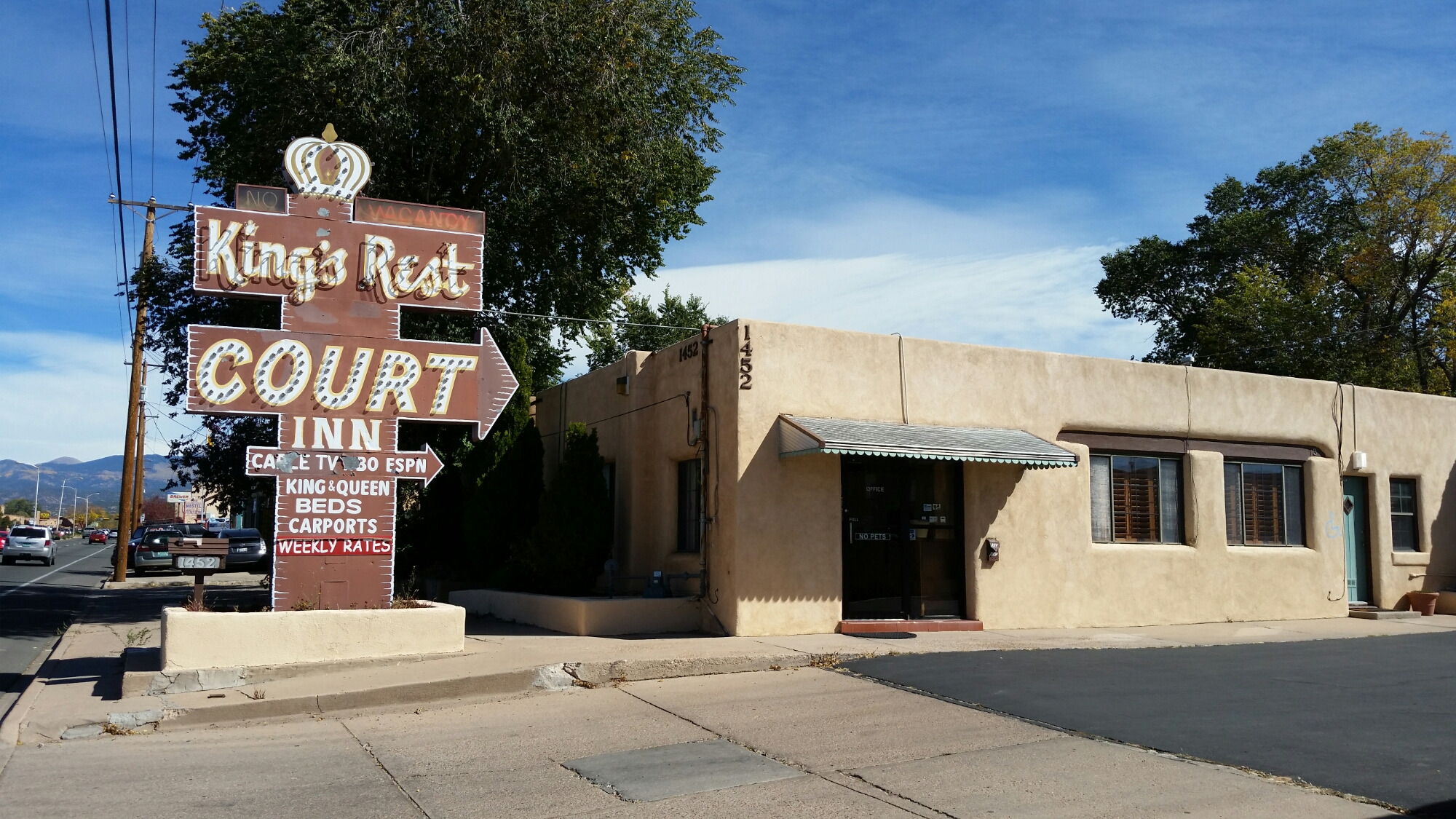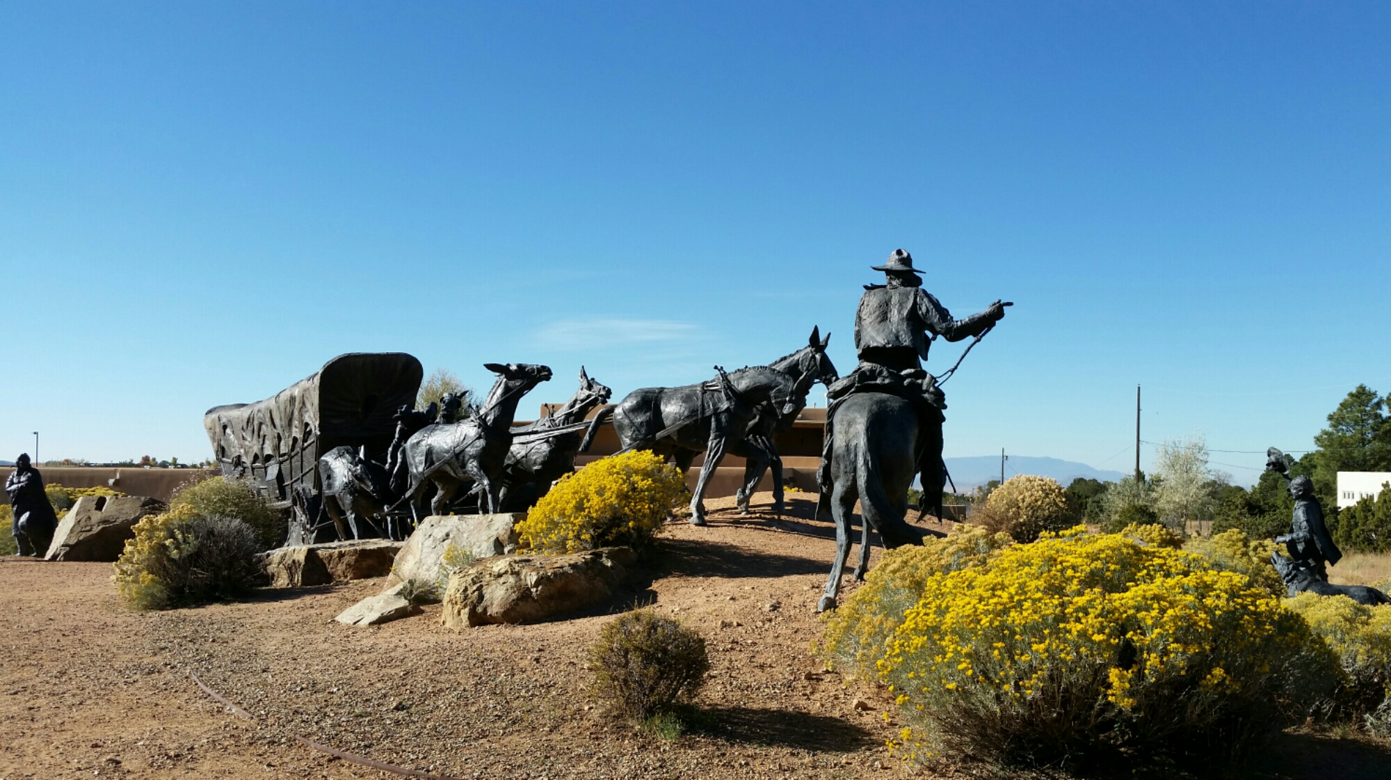 Good Morning Santa Fe! Time to explore! I started my morning with a great view of the mountains. Headed into town, I saw a sign for Museum Hill…ok I am game but just too early again. They had several different museums to include a 14 acre botanical gardens. I then headed to the downtown area and found a place to park. I visited the San Miguel Church which is the oldest church in the US with the oldest Bell which was covered with pendants of all sorts, the church was small but beautiful (1610). Adjacent to the church was the oldest house (1610). I also found tons of shopping at the plaza and it was a beautiful fall day here. I visted the state capital building and found some interesting sculptures. While I was walking around I found the Loretto Chapel and another church and the Palace of the Governors. On my way to the car I visted an open market and bought me a queen size mink blanket. Making my way back to Route 66 I passed the EL Rey Inn, the Kings Rest Court and the Western Scene.
