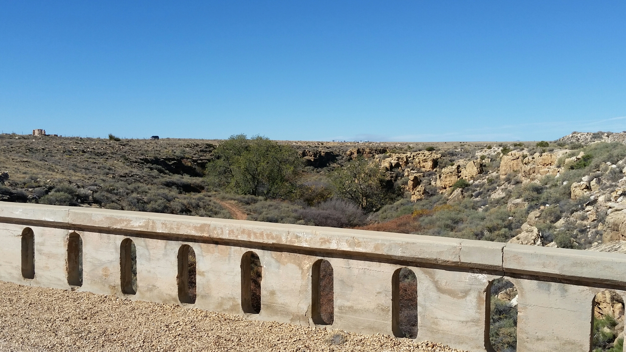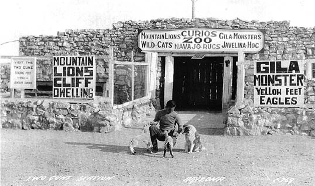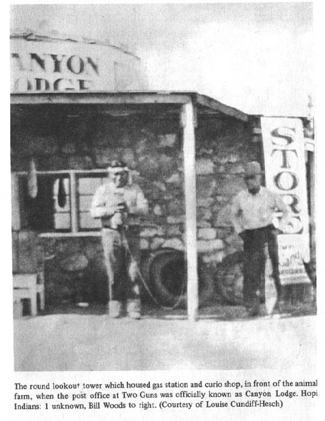Henry E Miller, who called himself “Two Gun Miller” was an eccentric hermit who lived in a cave near the Canyon Diablo. He was hostile to visitors and known to be wild and violent. Miller was said to have owned the town and that was the reason they gave it the name Two Guns AZ. Two Guns was a popular tourist stop along Route 66 with a gas station, over night lodging, a cafe and a souvenir shop. Later a zoo was added to include mountain lions, panthers and bobcats. Remnants of this was visible today as the wire cages they once occupied were still there. Camera in hand and Frannie on her leash we set off on foot to explore. All the while I was trying to picture what this must have looked like back then and what buildings were what. I found a couple of old photos of this ghost town to compare to mine.