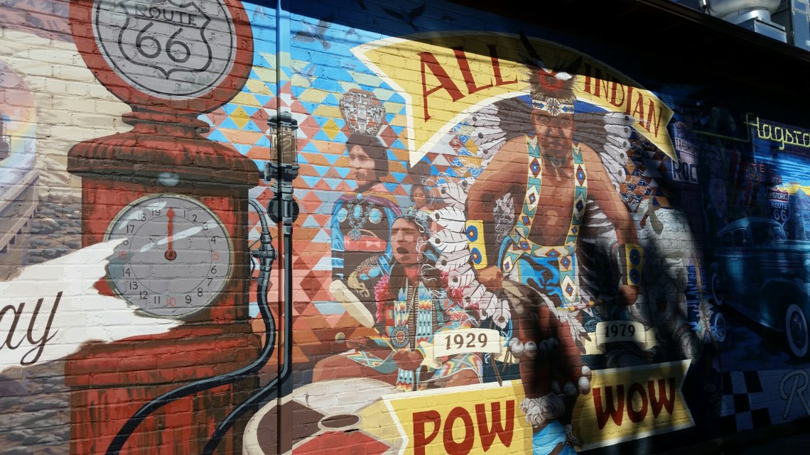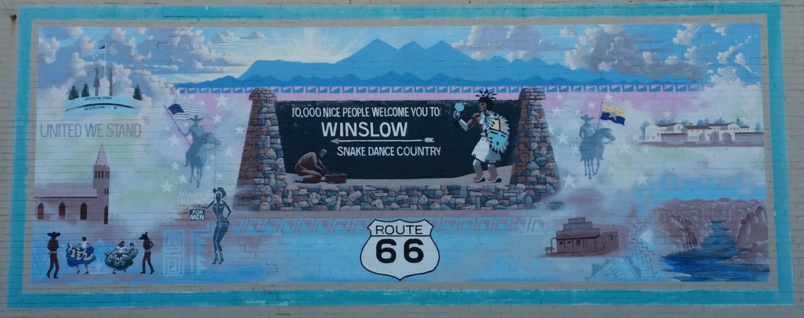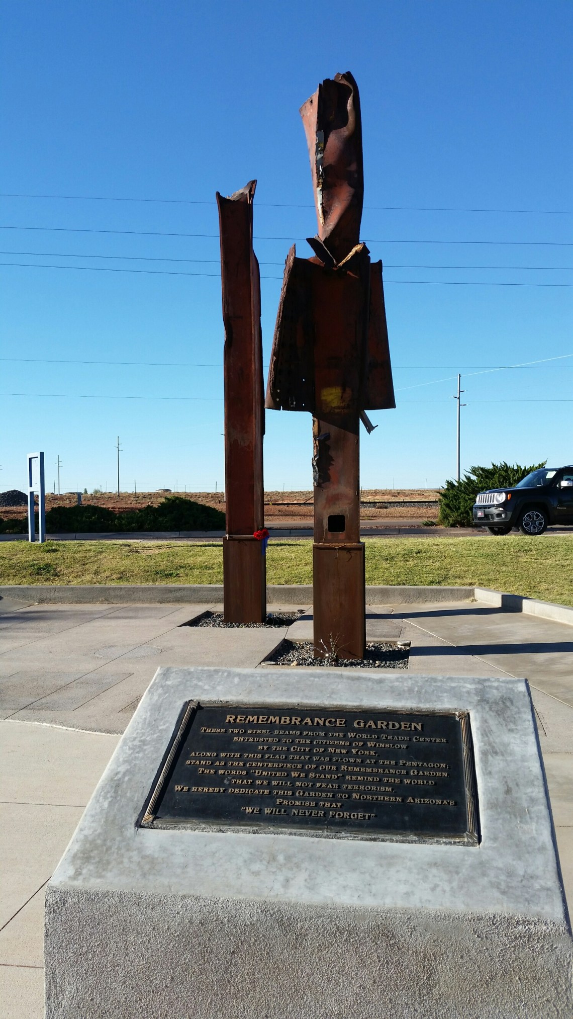 I spent the night in Winslow and boy was it cold this morning. But we girls are tough! I sipped on my coffee and visited the rest of Winslow. The La Posada Hotel was a beautiful former Harvey House built in 1928. The entrance stonework looked like rays of sun. I also visited the Falcon Restaurant, the Brown Mug Coffee shop, Earls 66 Motel, some murals and an old gas station. At the park leading out of town were two steel beams from the World Trade Center along with a memorial to the victims of 9/11.