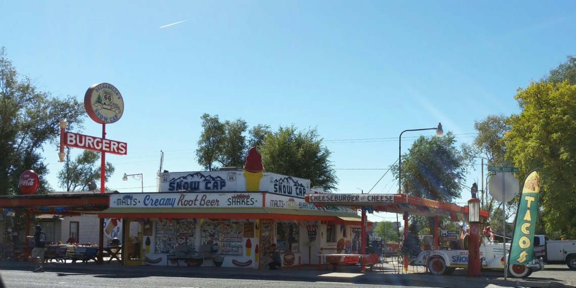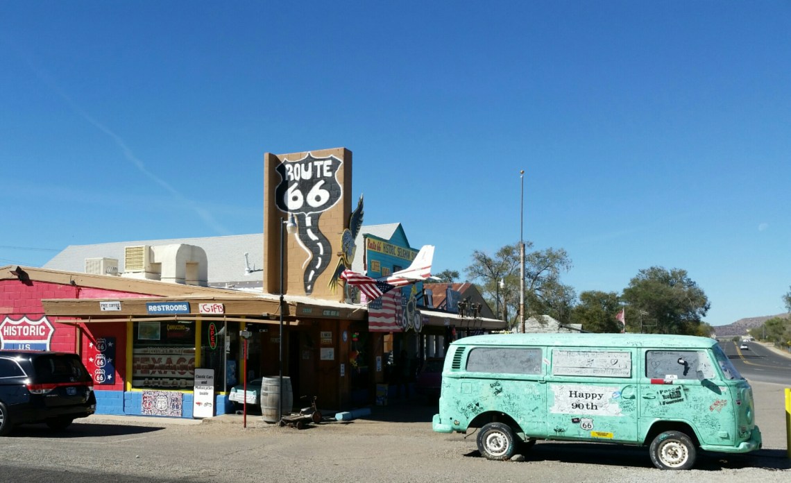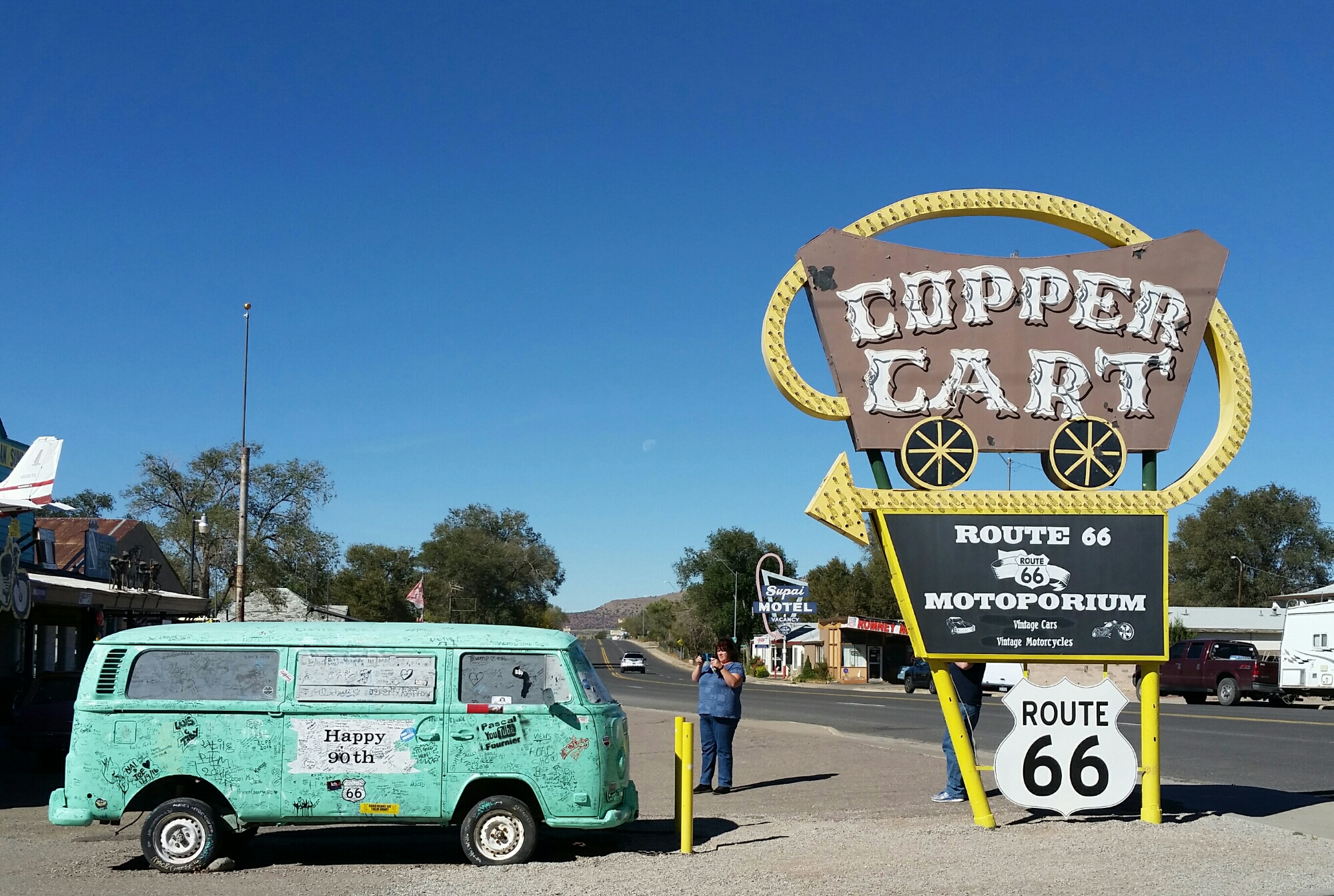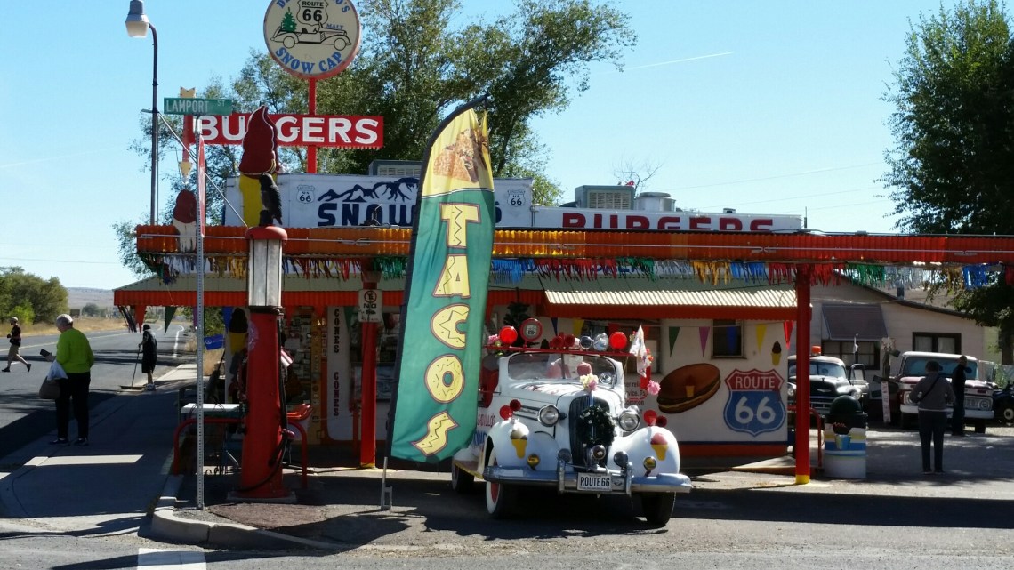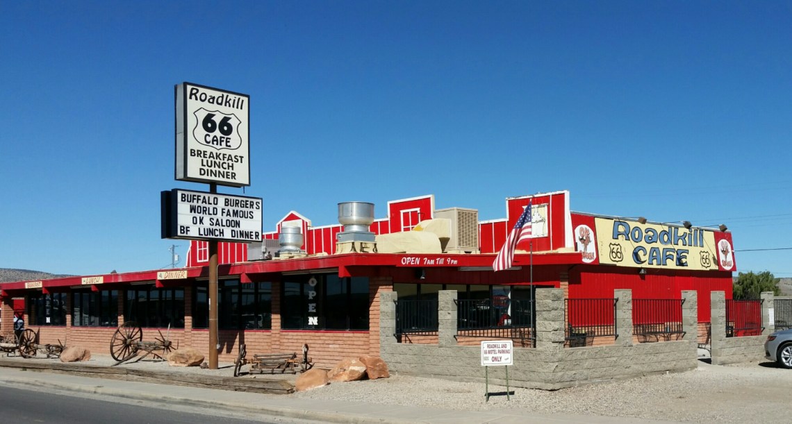 I finally get to drive a long stretch of original Route 66! 86 miles to be exact. The scenery has changed again and I love that it does that! I drove over Crookston Crossing, a pair of old railroad overpasses, then into Seligman AZ. What a hopping place! There was a nostalgic old dairy bar called the Snow Cap and in walking distance a variety of souvenir shops, relics and old cars. There were two vintage motels also, the Route 66 Motel and the Supai Motel. Favorite place by far was the Roadkill Cafe where I had lunch! Thought I would try something different so I ordered the Buffalo Burger, fries and a Pepsi….oh my delish!