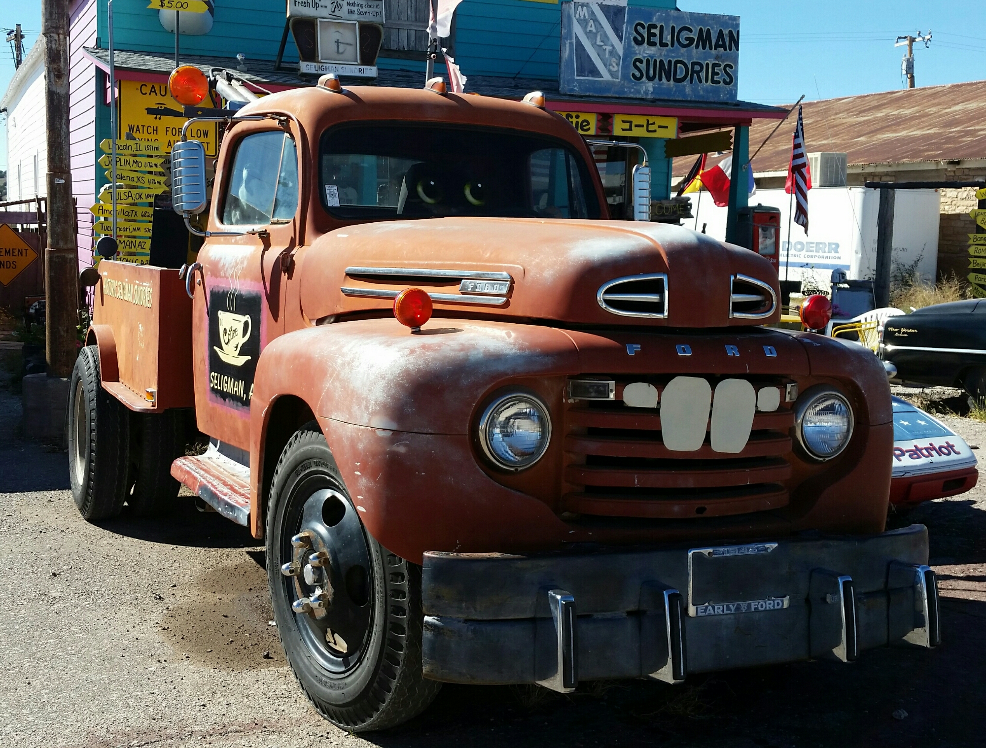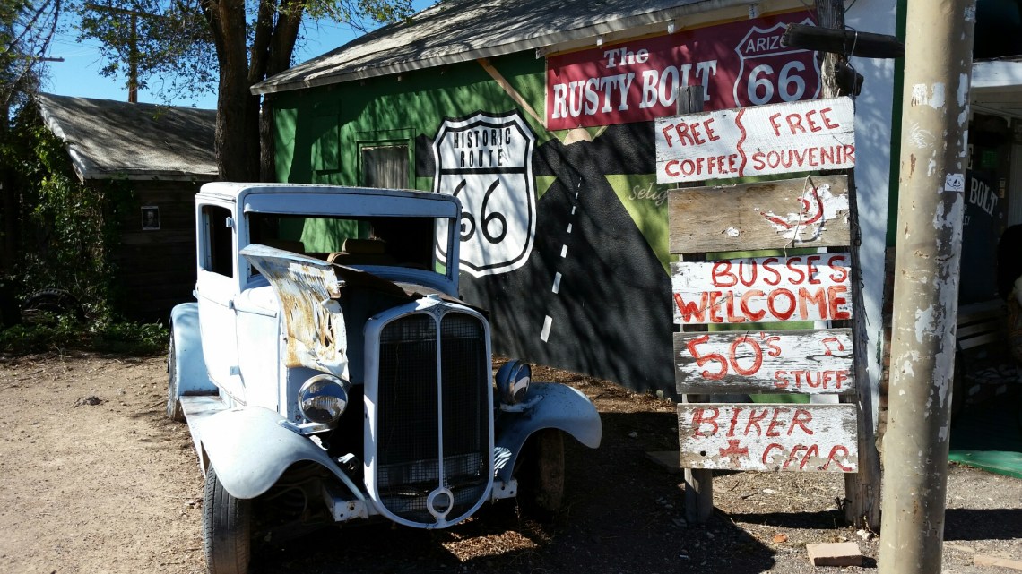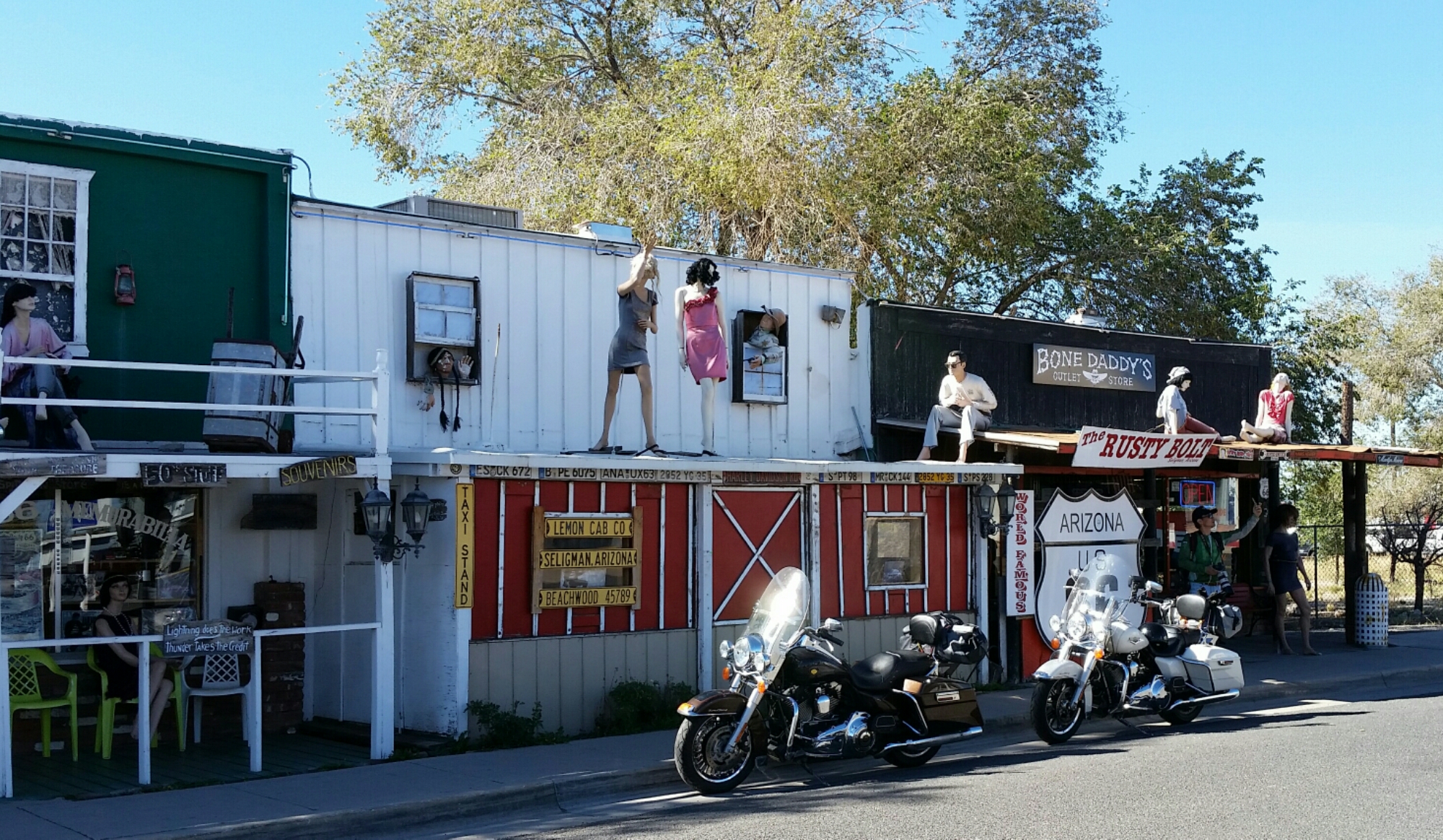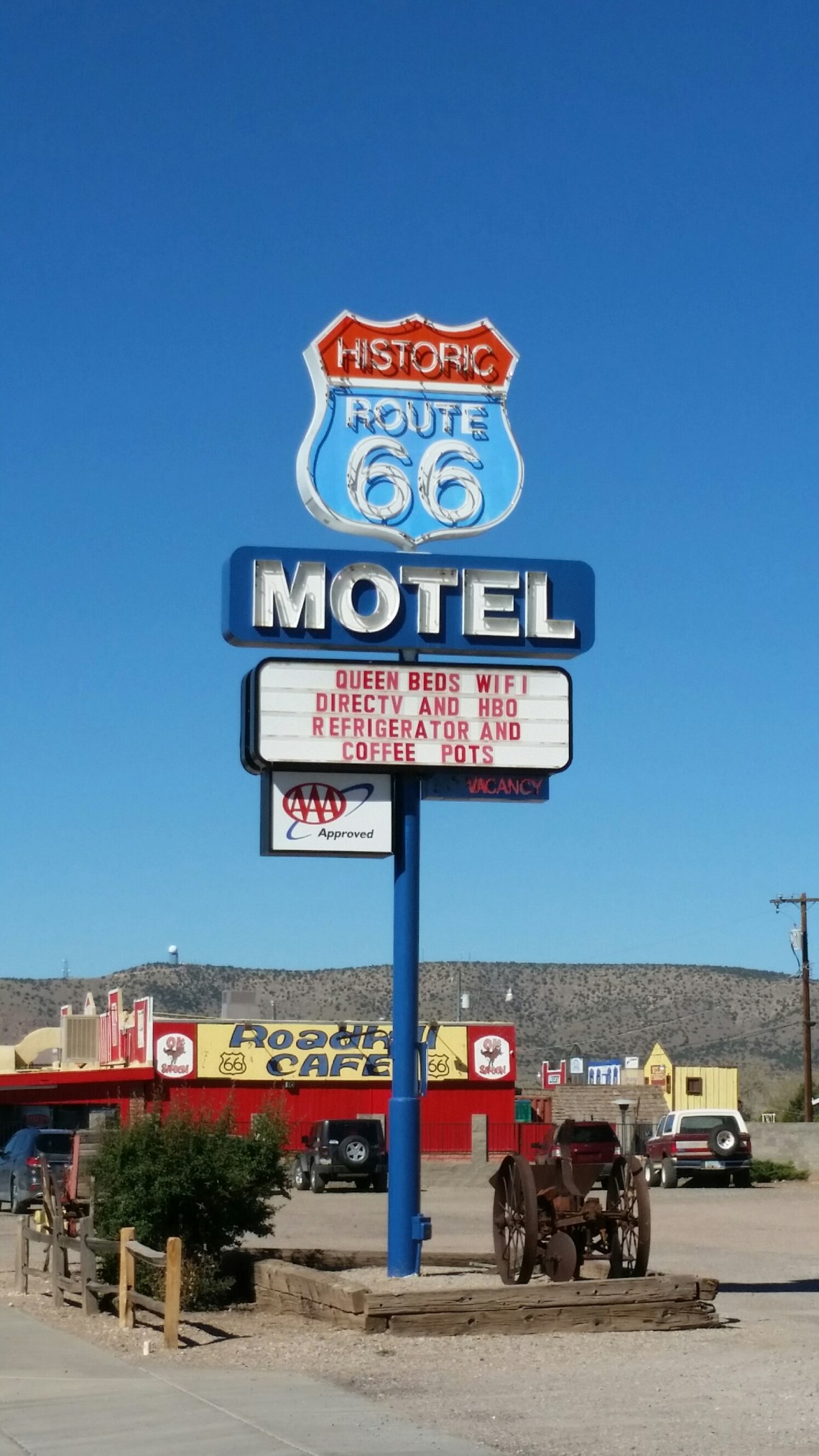 I finally get to drive a long stretch of original Route 66! 86 miles to be exact. The scenery has changed again and I love that it does that! I drove over Crookston Crossing, a pair of old railroad overpasses, then into Seligman AZ. What a hopping place! There was a nostalgic old dairy bar called the Snow Cap and in walking distance a variety of souvenir shops, relics and old cars. There were two vintage motels also, the Route 66 Motel and the Supai Motel. Favorite place by far was the Roadkill Cafe where I had lunch! Thought I would try something different so I ordered the Buffalo Burger, fries and a Pepsi….oh my delish!