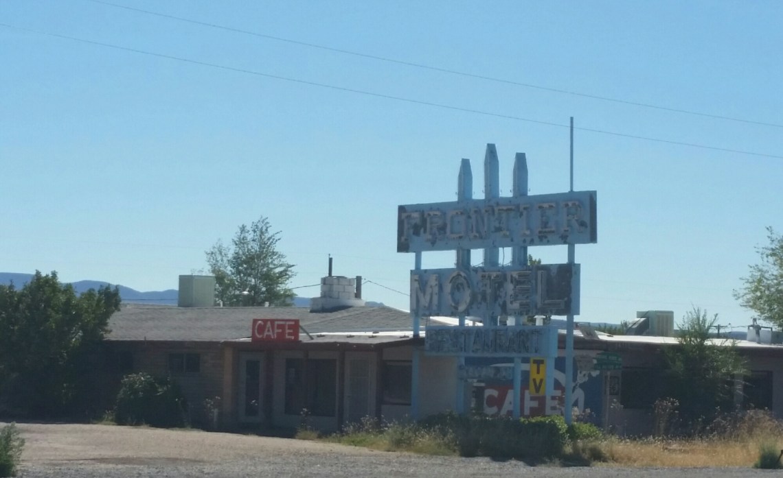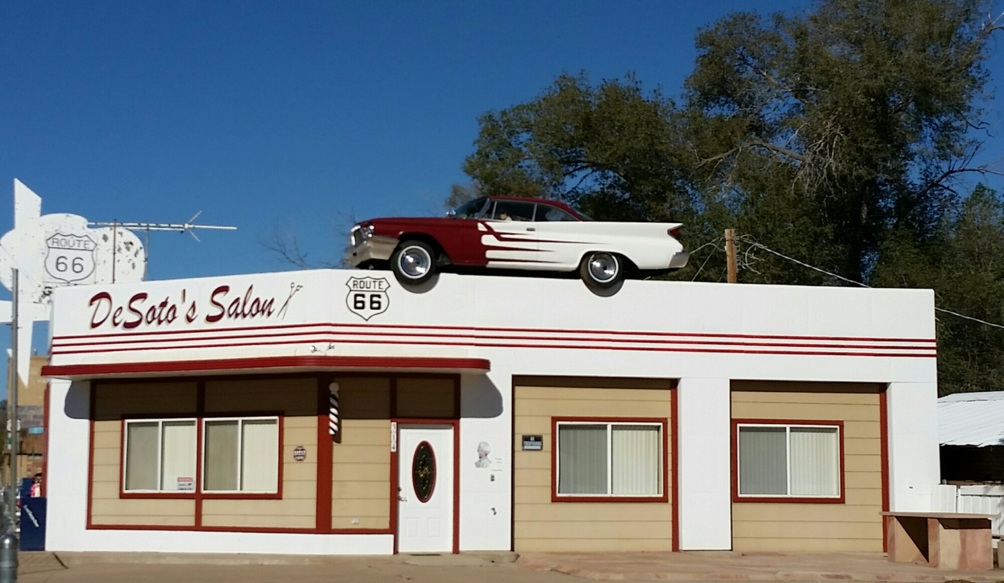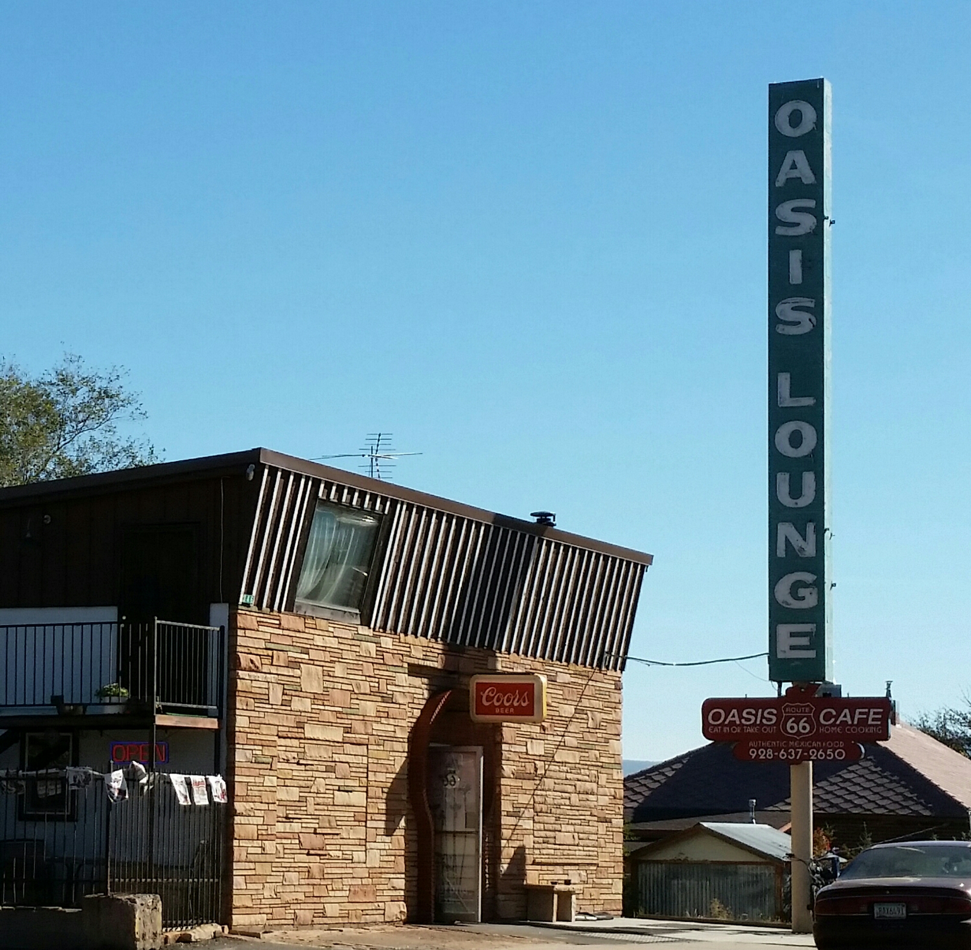 I headed west to the town of Ash Fork. Once famous for flagstones. There was a 1958 (very good year I might add) Desoto on the roof of an old gas station. Down the street there were two cafes, the Oasis Lounge and Route 66 Cafe and the Ranch House Cafe.