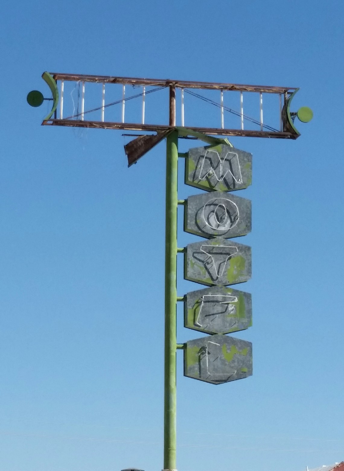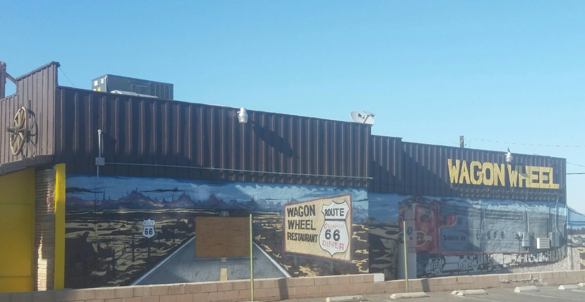 Awwww the Welcome Wagon! El Graces, the huge Harvey House is beautiful as it sits across the street from the train tracks. The building with the three Moroccan-arch doorways dates back to 1929 and use to be a Masonic Temple. There was the old Sage Motel and a structure from an old gas station. Of course, I found murals!