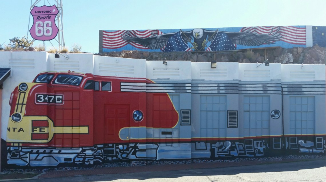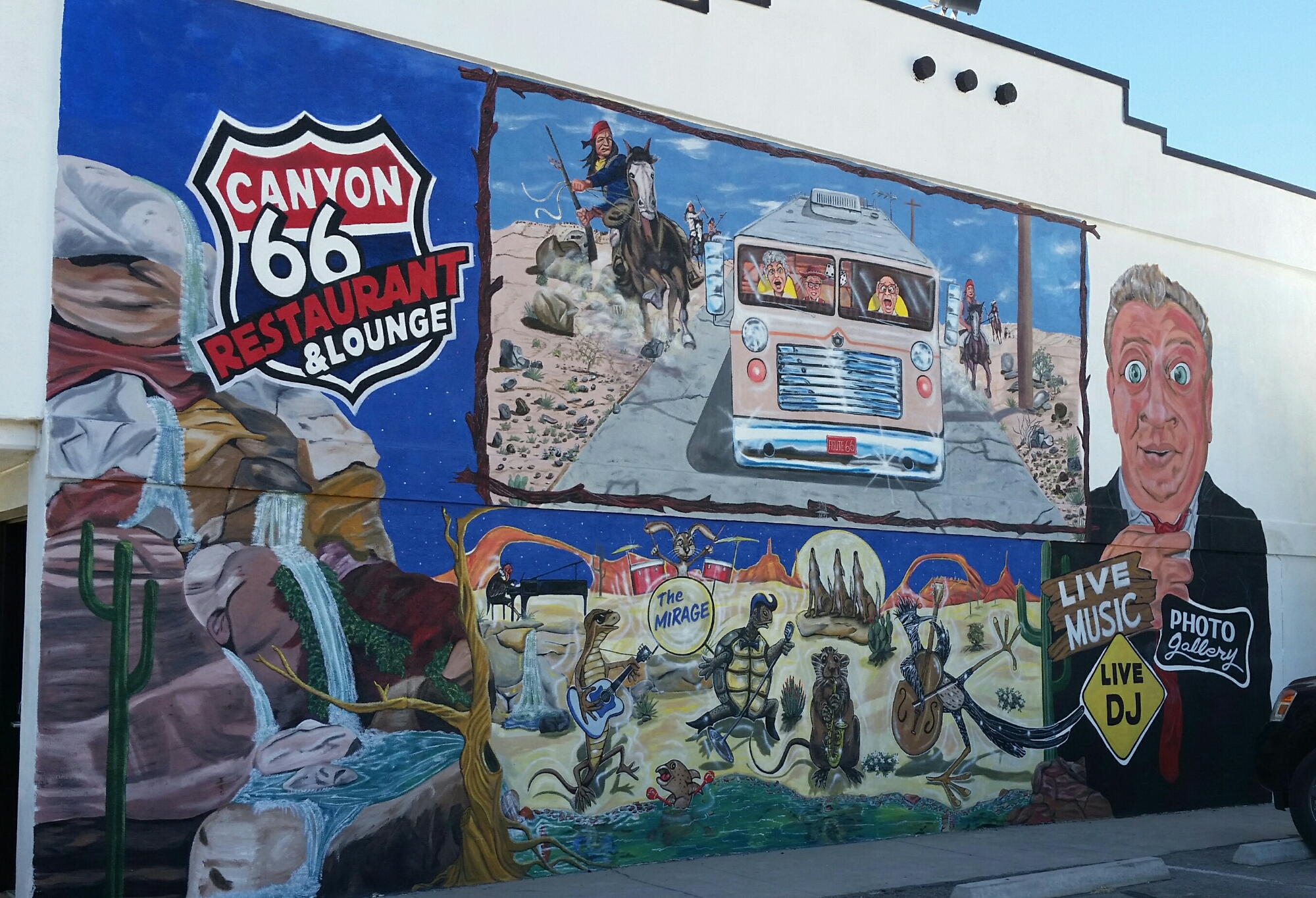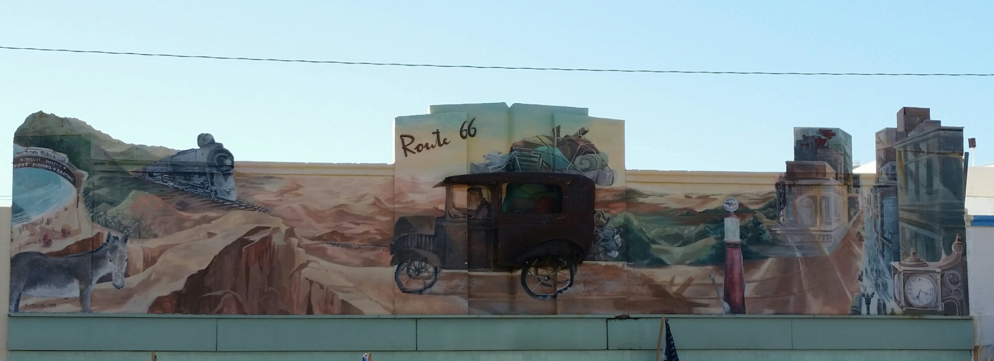 I caught several neat murals while in Kingman. Route 66 is the main drag through town so it was fun to find so much 66 stuff! The El Trovatore had a mural of the entire Route 66 on the front of the Motel as they claim to have the longest Route 66 road map. I didnt get a picture of it, too many obstructions but I did see it. I caught the Hill Top Motel, the Route 66 Motel and the Hotel Beale. There was a very nice visitor center and across the street was Mr D’s Diner and a 1927 Santa Fe steam locomotive. Remember looking for a new or used car with your parents, well “OK”. I even found the one and only Mr Magoo!