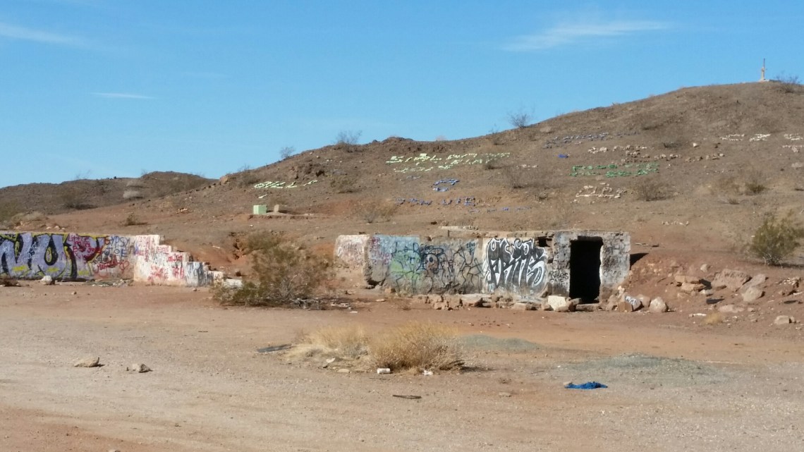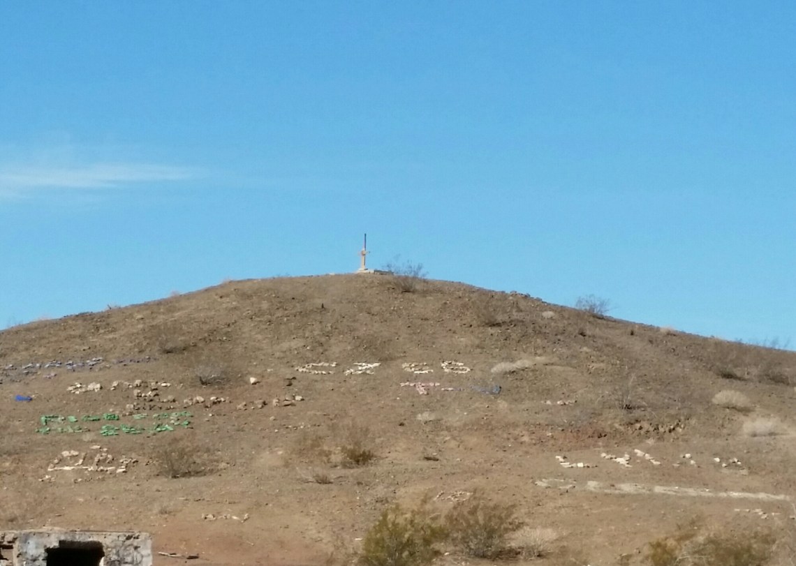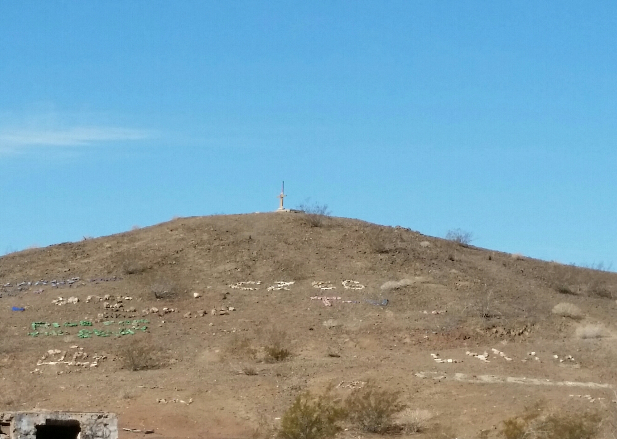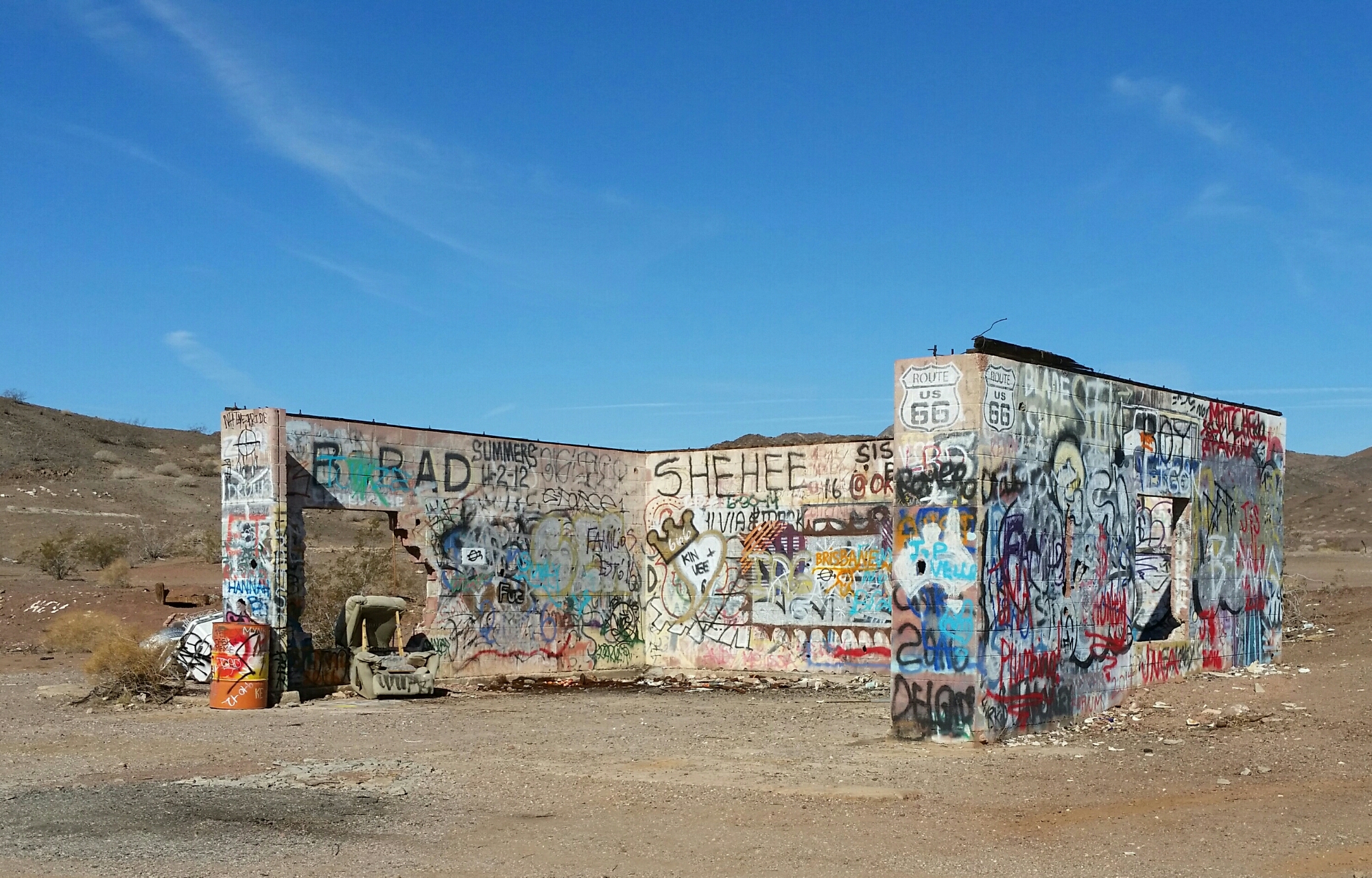 Driving up through Cadiz Summit there were remnants of buildings of long ago, now covered with graffiti. On the hill more rock art and a pink cross at the top. At the bottom of Cadiz Summit was the Chambless Market.