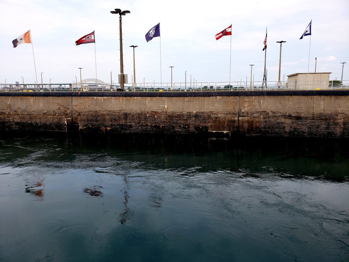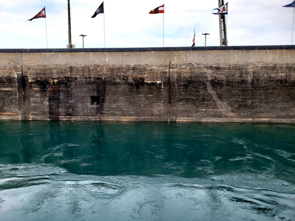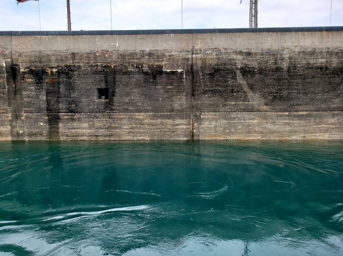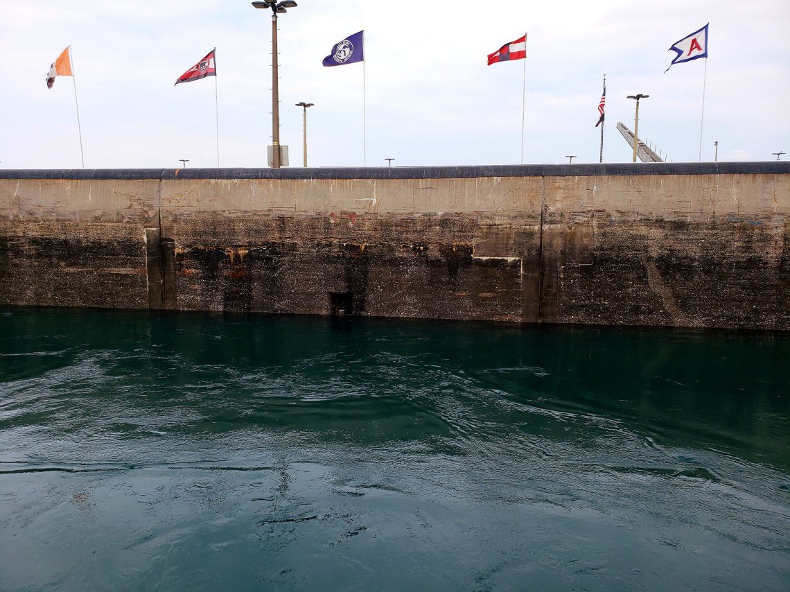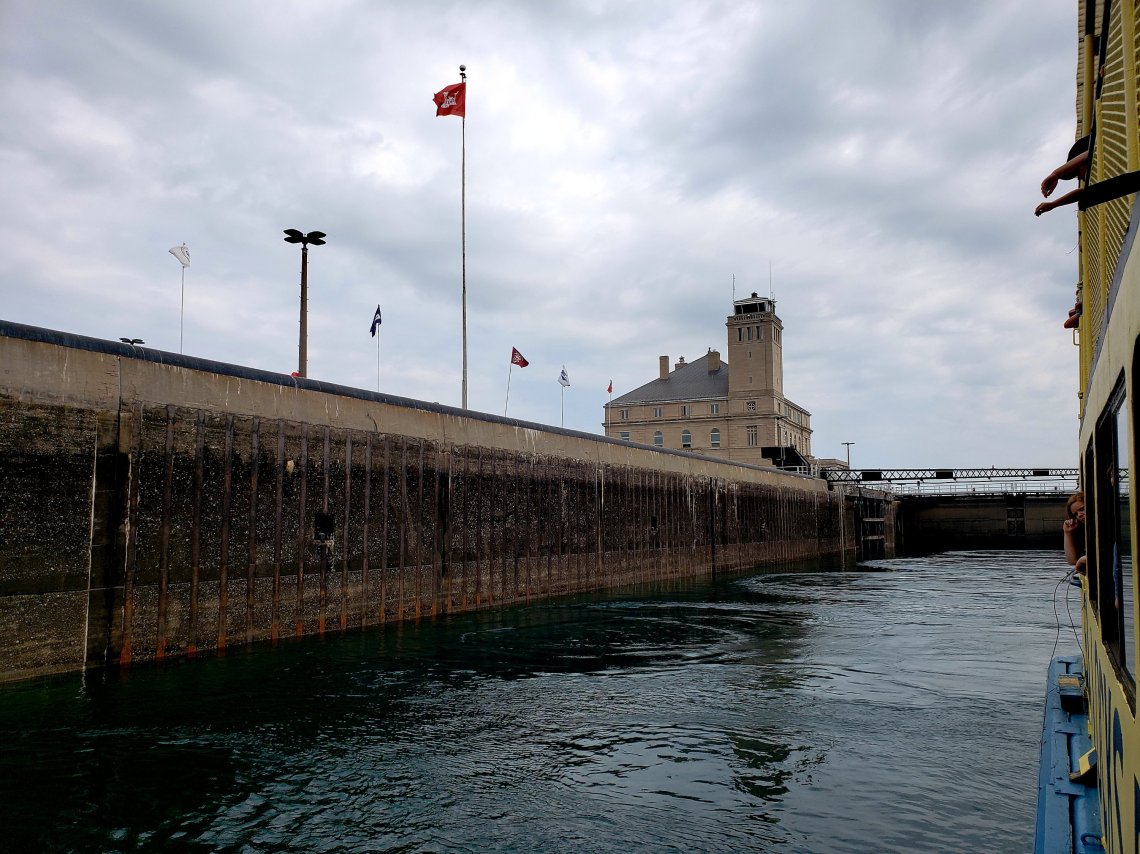 While the Lock in front of us is already closed, the water level starts to rise bringing us to the top of the locks and to the same height of Lake Superior.