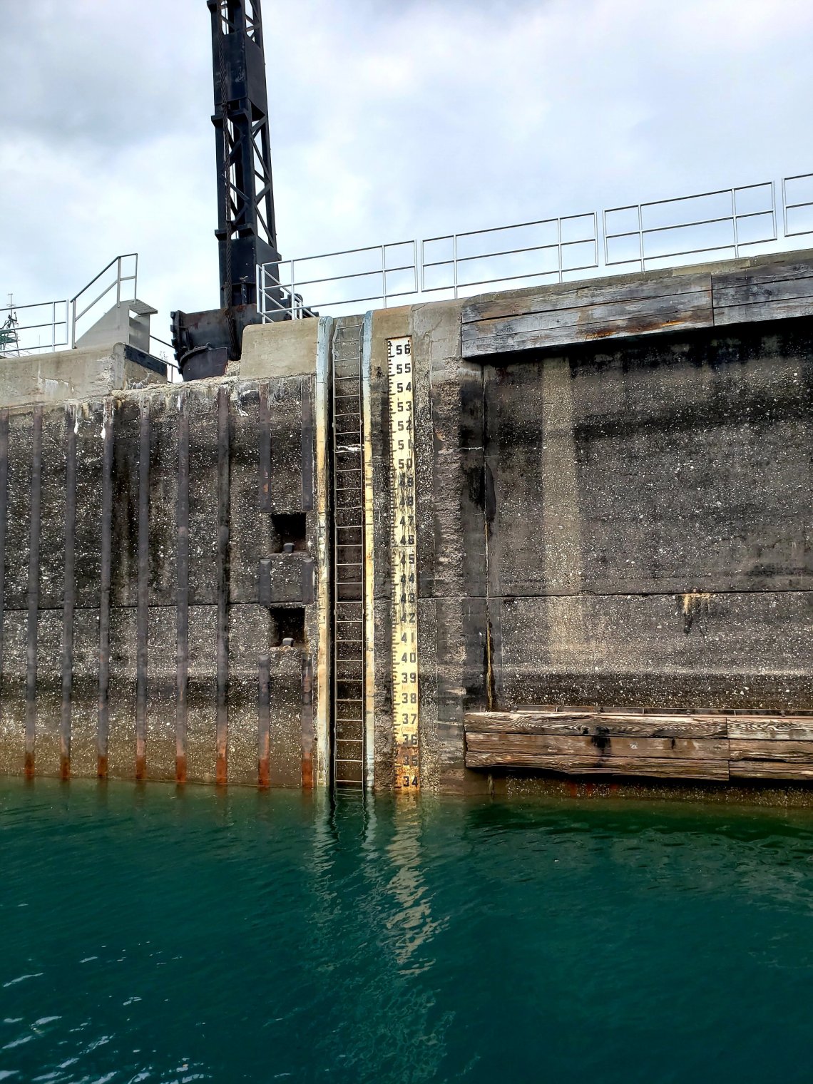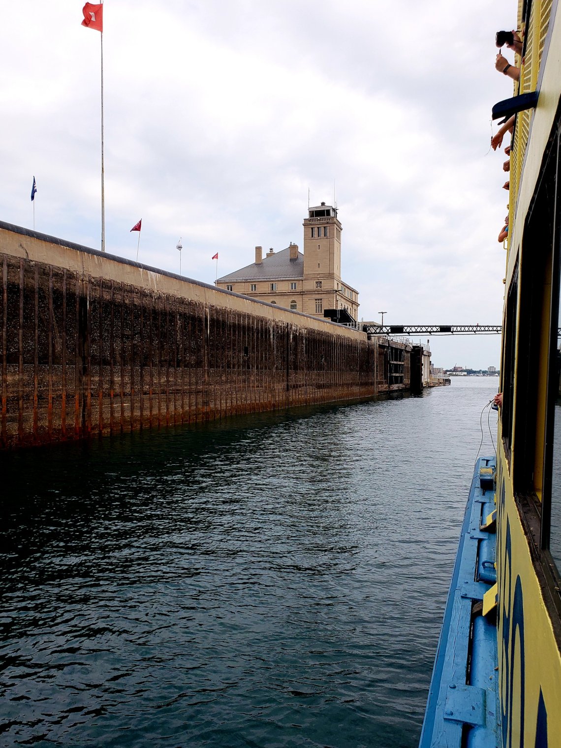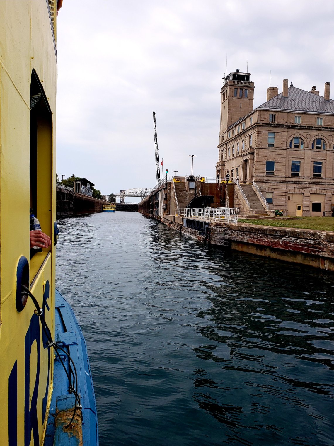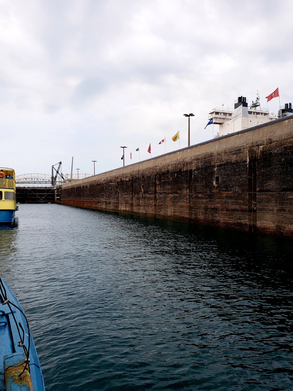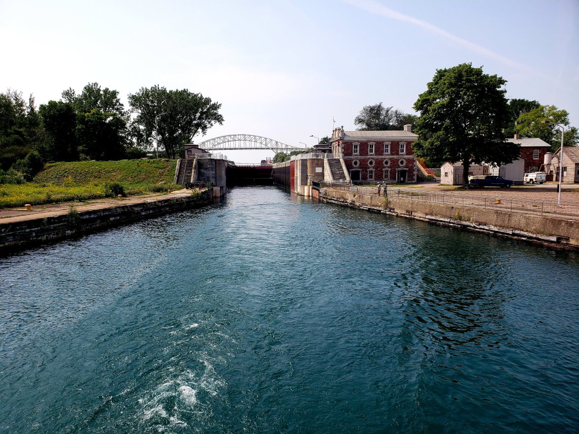 While the Lock in front of us is already closed, the water level starts to rise bringing us to the top of the locks and to the same height of Lake Superior.