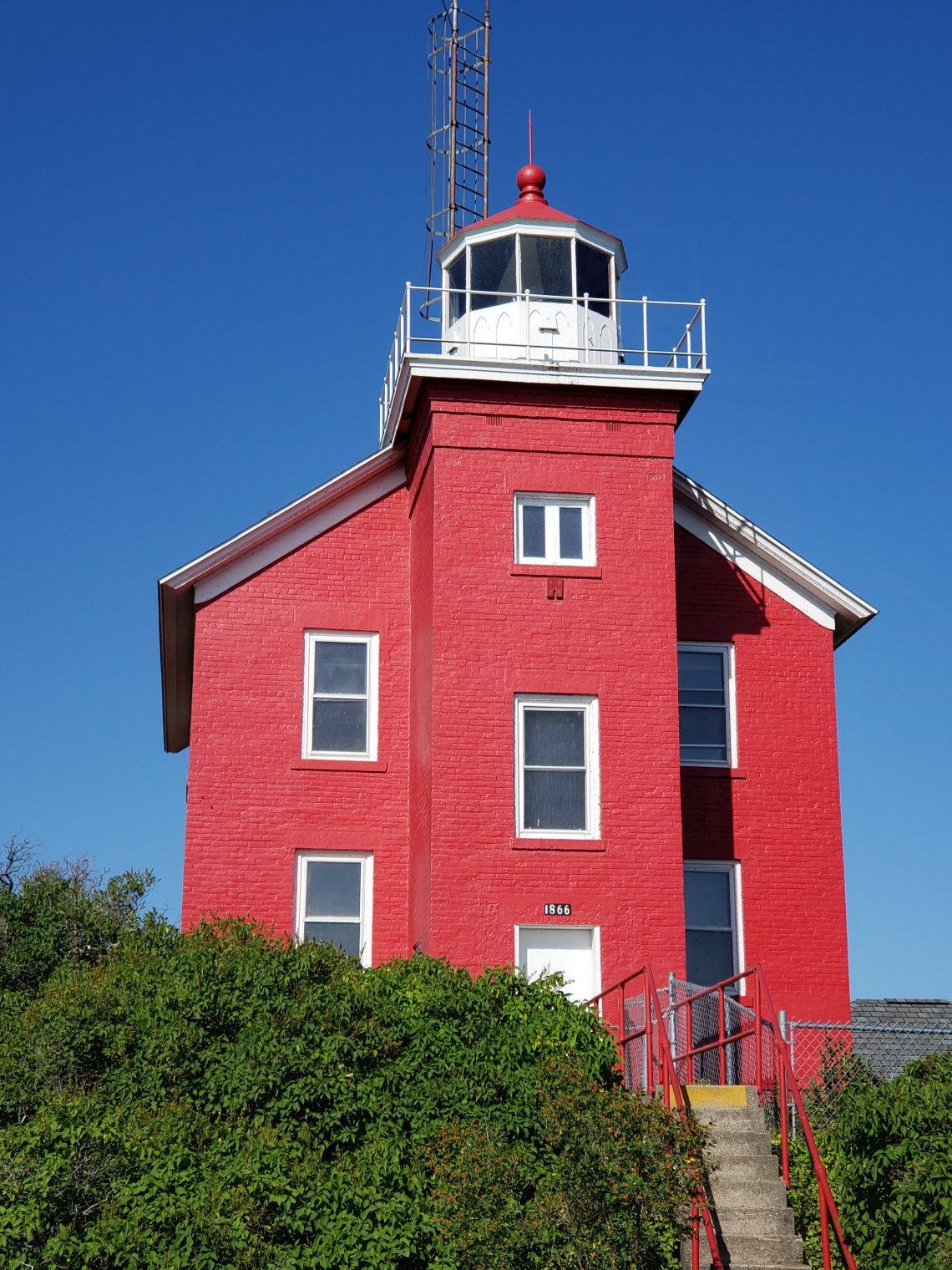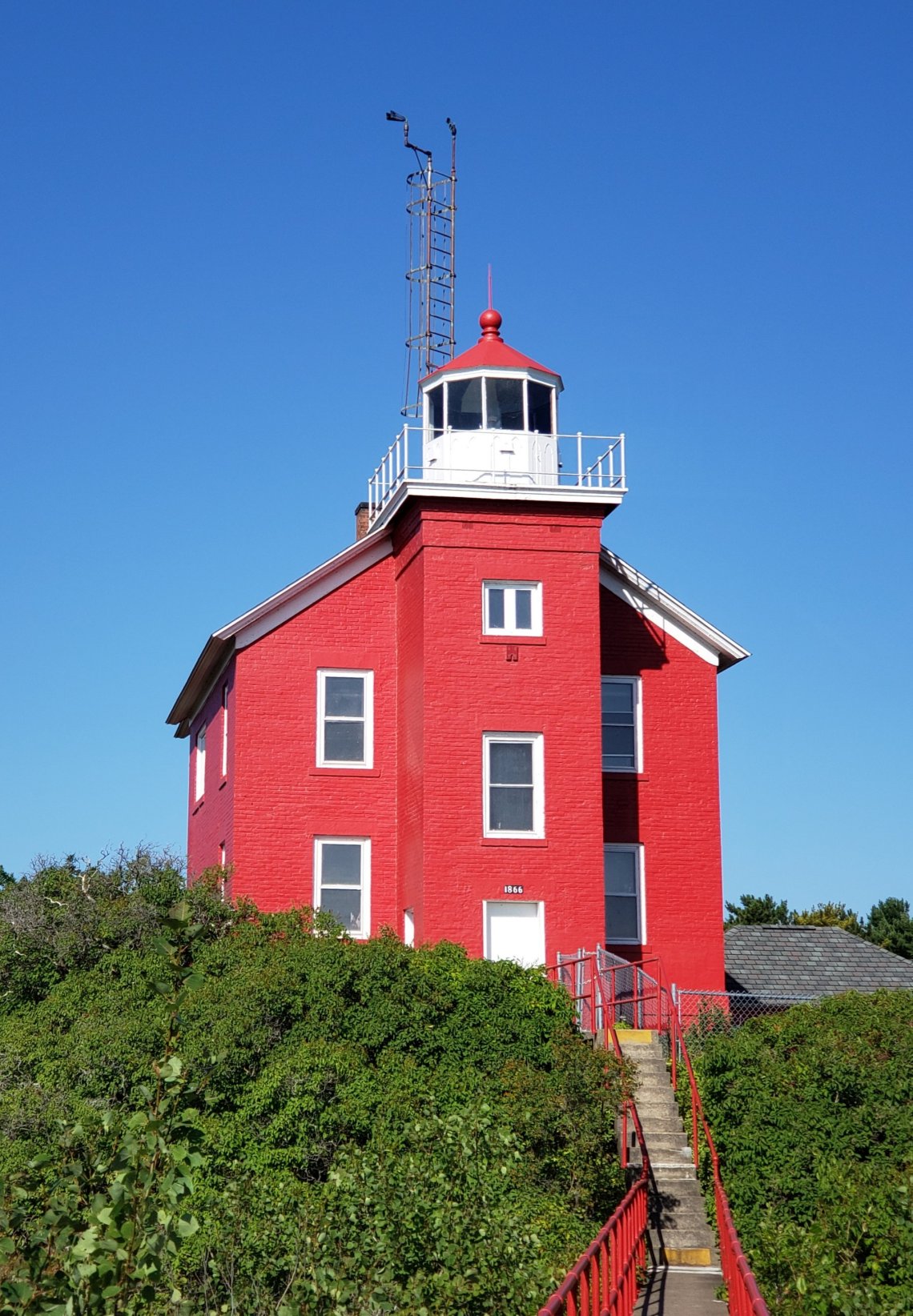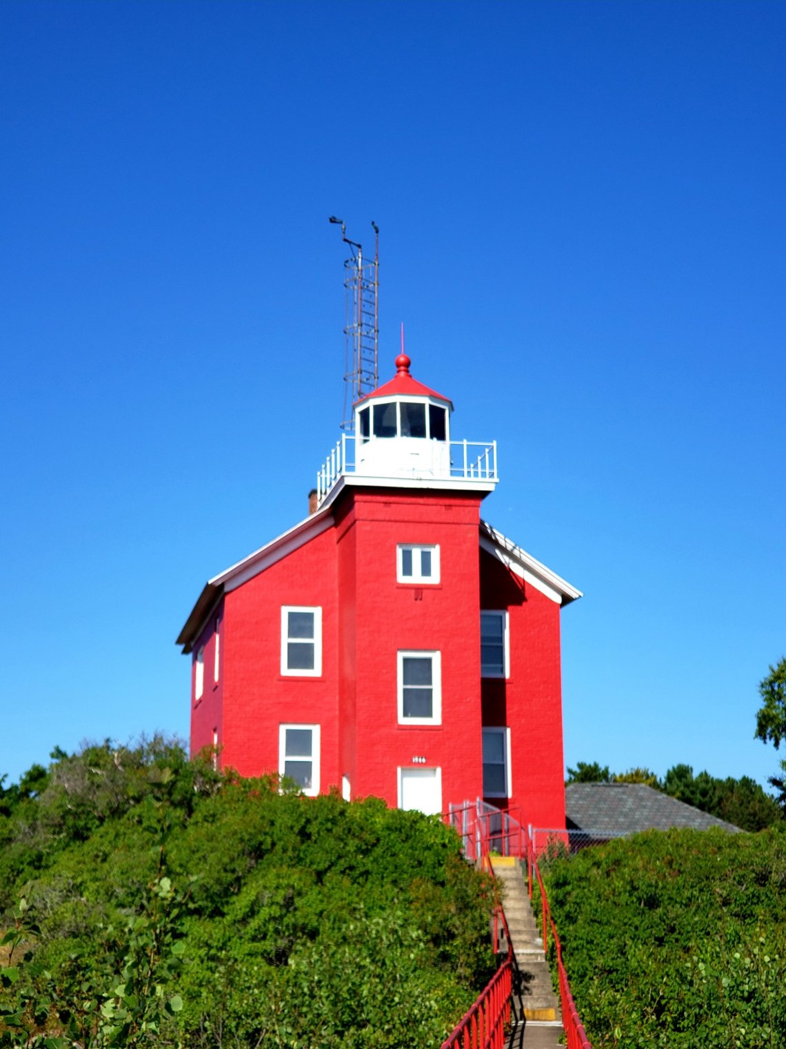 Once I arrived at the Maritime Museum the parking lot was way to small for me to park. So I drove around the corner and parked on a side street and walked. I didn’t have time to view the museum so I set out for the beautiful red lighthouse which sat behind the museum. The Marquette Harbor Lighthouse sits up high with steps on both sides.