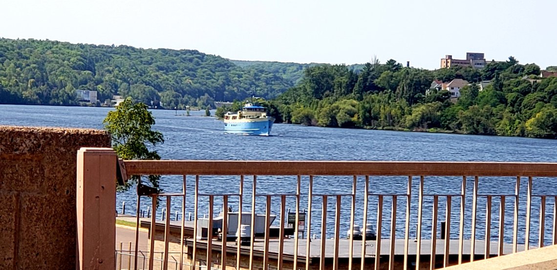 As I told myself “no more stops until camp” we found our way driving up Hwy 41. It was a winding road full of trees starting to show color here and there. We drove through several small towns and as we drove through Houghton we had to wait for the draw bridge to let this boat through.