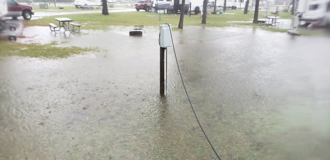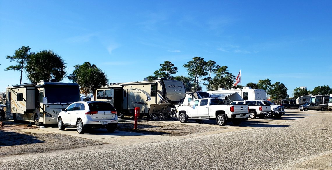 We are staying at the Luxury RV Park off of 59 only a few minutes from the beach. It is a very nice park with all the amenities. Full hookups, cement pads and patios, Cable TV, showers and restrooms, an activity building, pool and a dog walk.