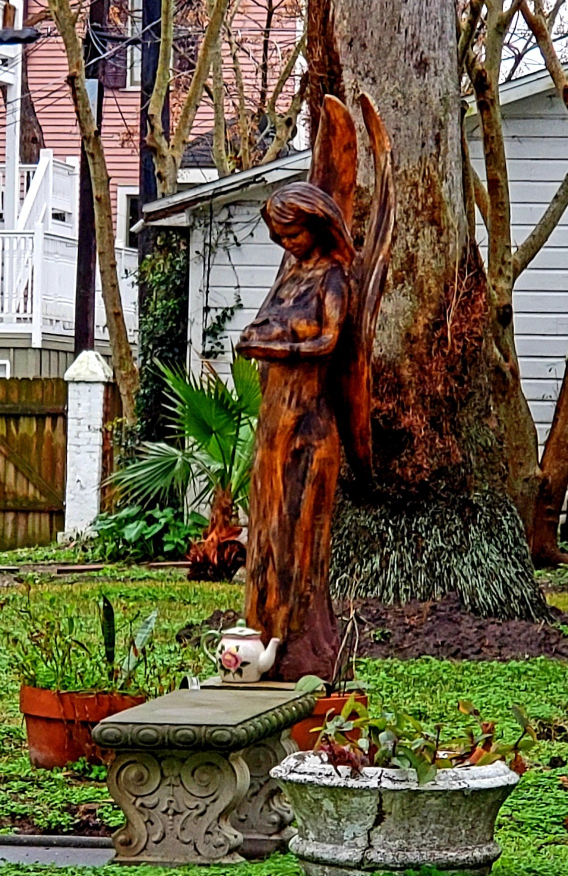 Angel Cradling a Bunny – The sculpture watches over the yard which is a bird and bunny sanctuary.