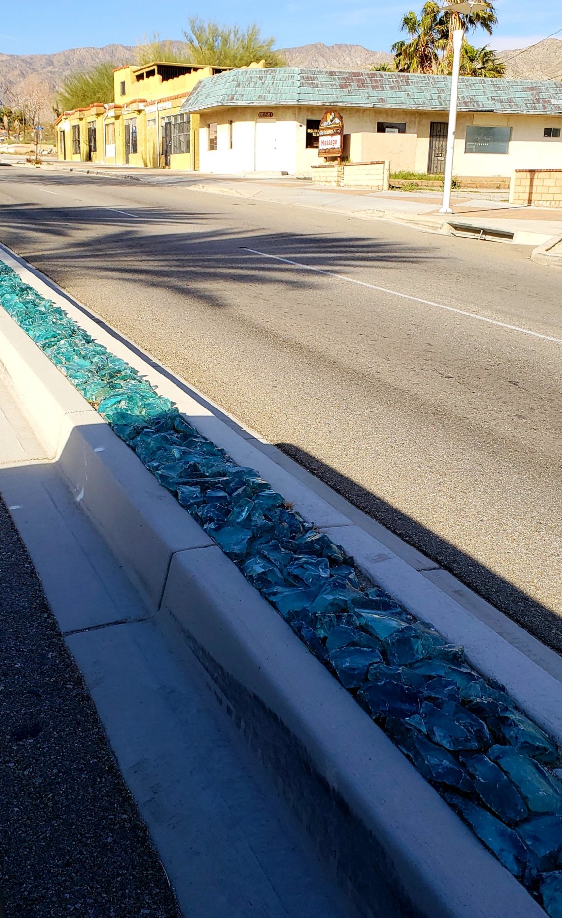 The picture below is in Desert Springs, California. I thought the green glass rock looked very cool in the medians.