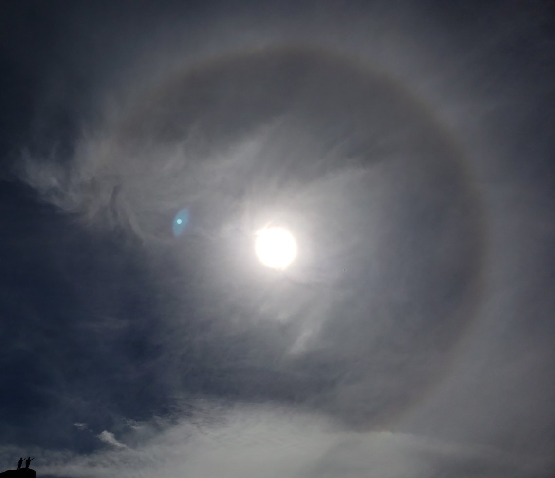 Looking up at the sky there was three quarters of a halo around the sun.