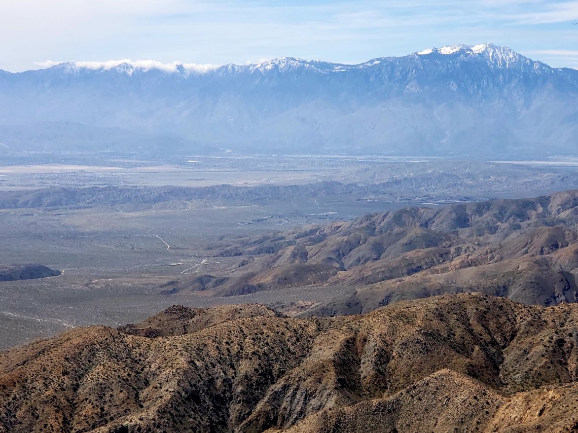 Here we are at the top of Keys View, 5185 feet above sea level with a great view of the snow capped San Bernadino Mountains.