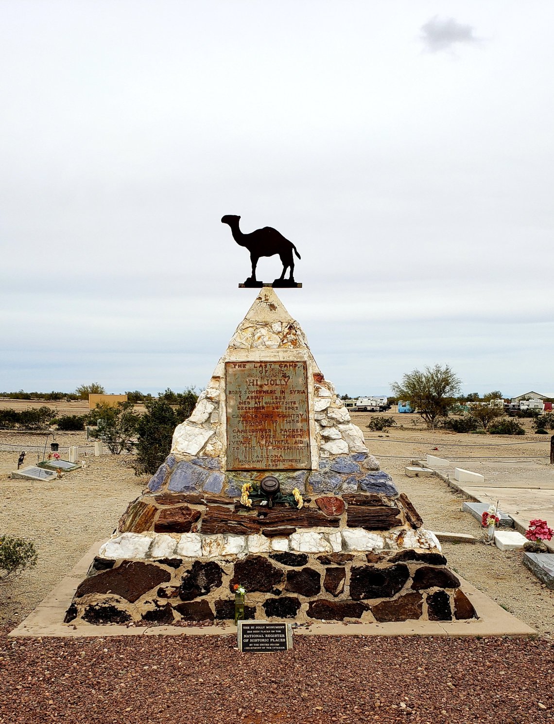 While in Quartzsite we visited the Hi Jolly Tomb. Hi Jolly, a Greek man, was hired in 1857 as a camel herder for the Army’s short-lived Camel Corps. When the Civil War started the Camel Corps ended and the 70 camels were set free in the desert to fend for themselves. Hi Jolly returned to Quartzsite and dabbled in mining, packing, scouting, selling water to travelers and even delivering the “Jackass Mail”.
