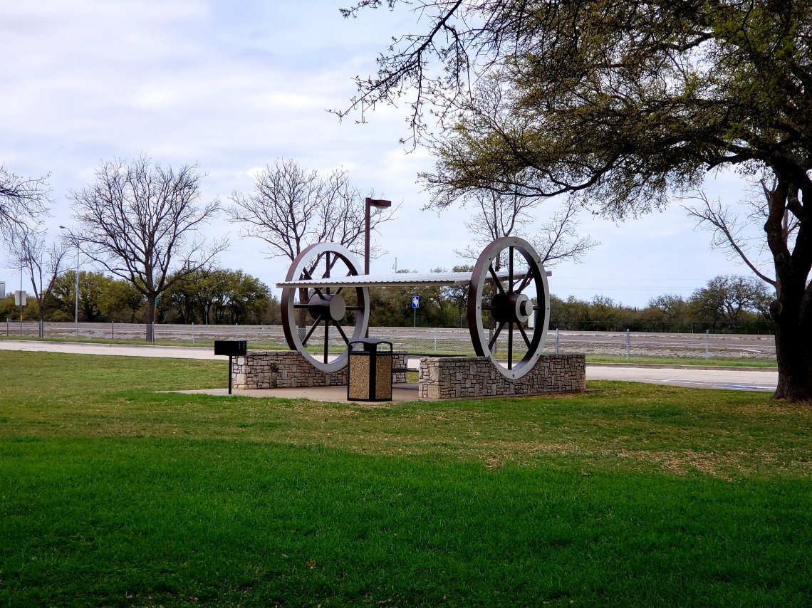 Here, just west on Sonora, Texas you can sit in the shade and enjoy the breeze in a wagon wheel picnic area.