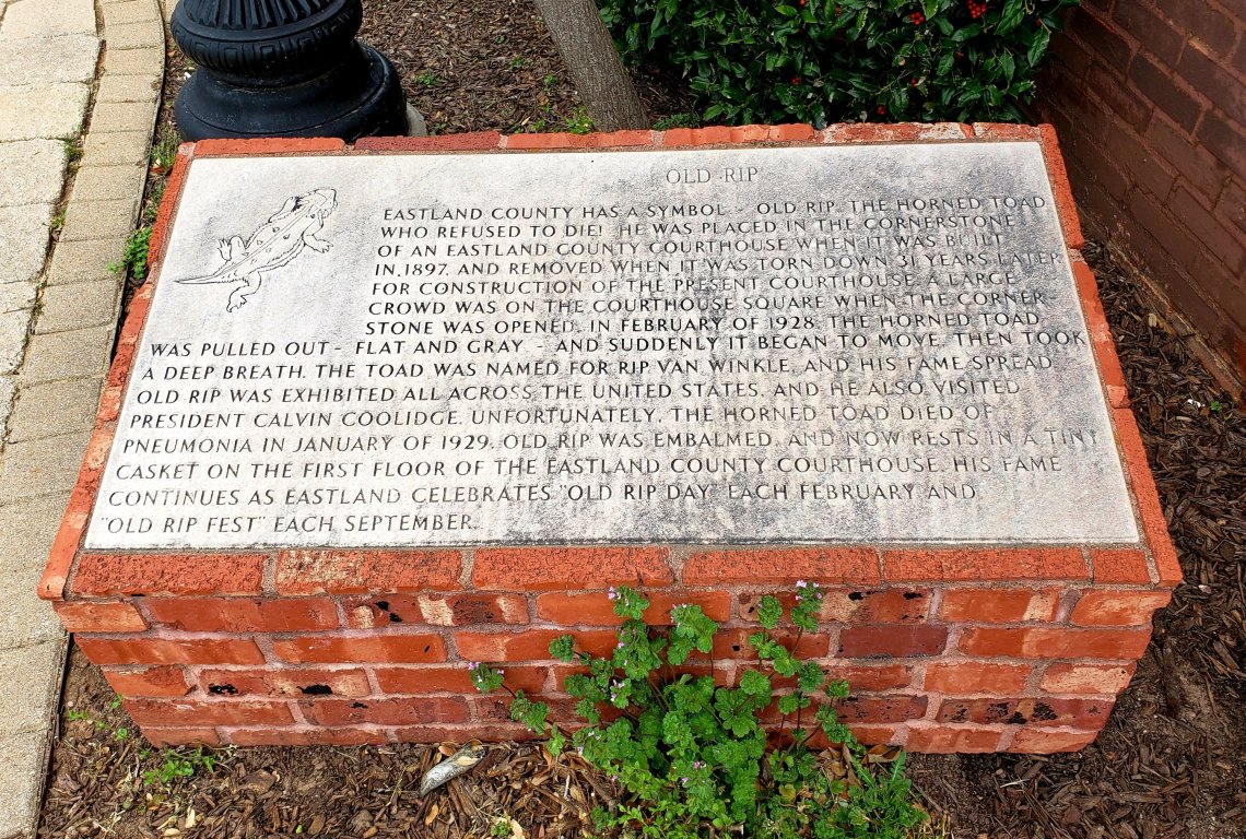 The town became famous for “Old Rip” the horned toad. Old Rip was buried alive in the cornerstone of the courthouse in 1897. 31 years later the cornerstone was removed and Old Rip was alive. He passed away one year later.