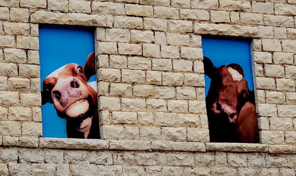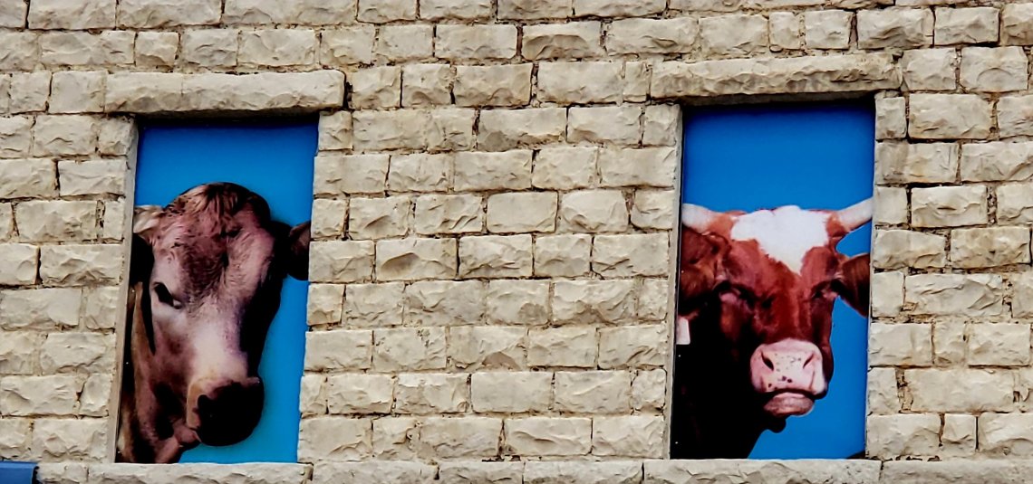 These second story windows all have portraits of cows in them sponsered by local ranchers.