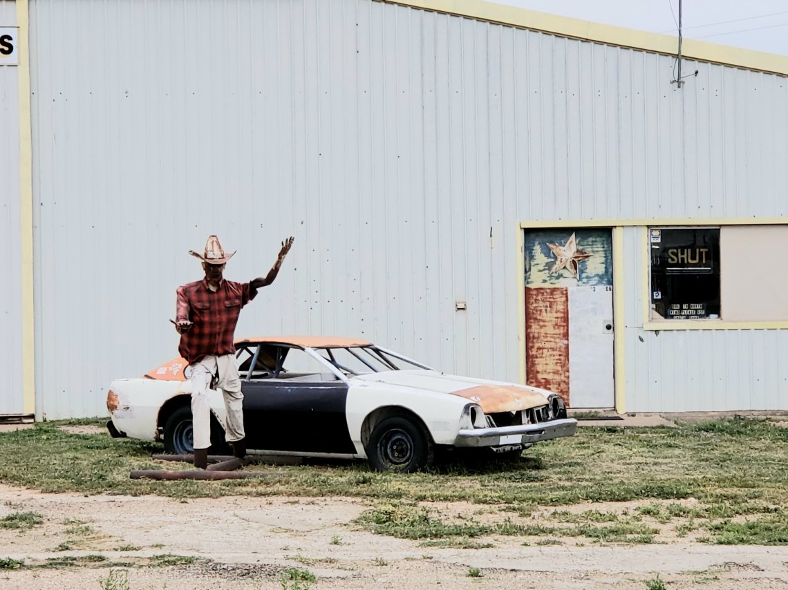 As I drive through Miles, Texas there was this! You might be a redneck if you make a guy out of metal then put ripped drawers on him, sit him by a rusted out car and hang a sign in your window that says SHUT instead of closed.
