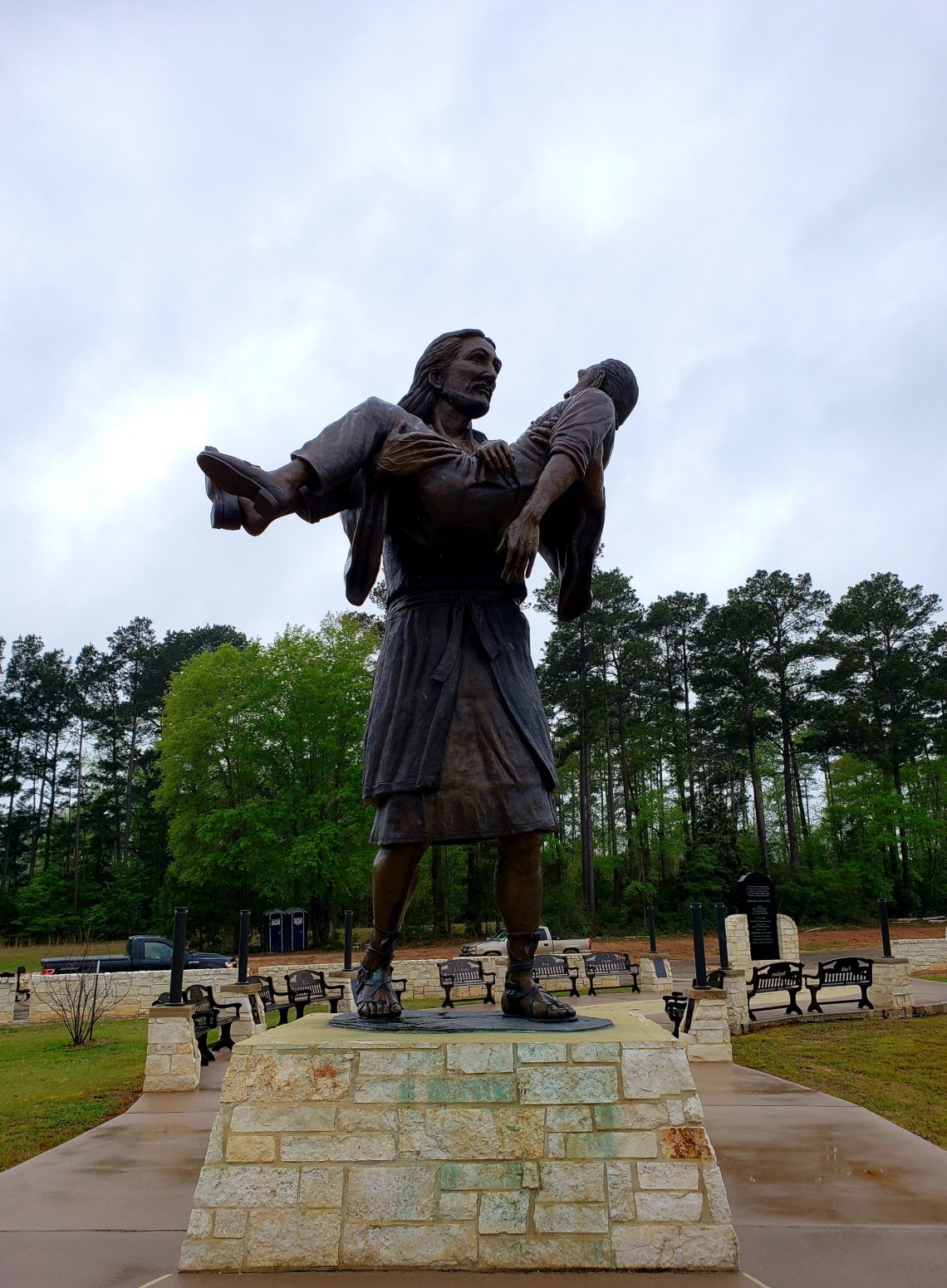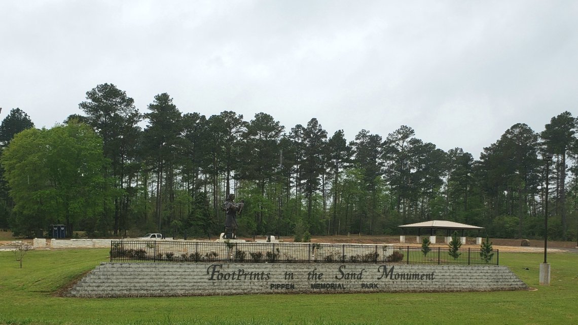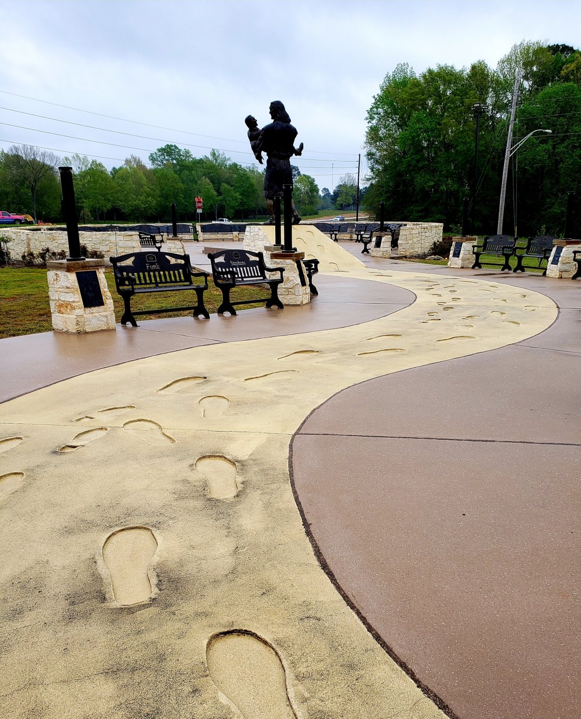 The “Footprints in the Sand Monument” can be found on the southwest side if Carthage, Texas.