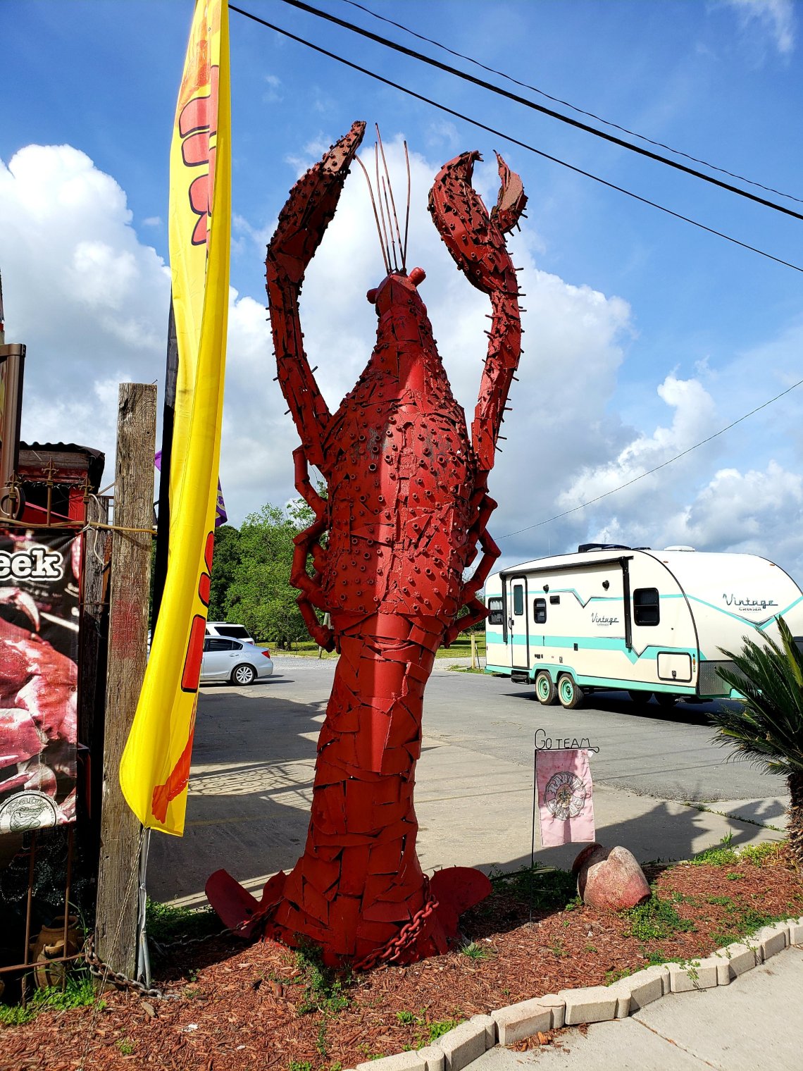 Down the road in Beaux Bridge, Louisiana, I stopped for coffee, no I did not find a Starbucks but I did find this big metal sculpture of a crawfish!