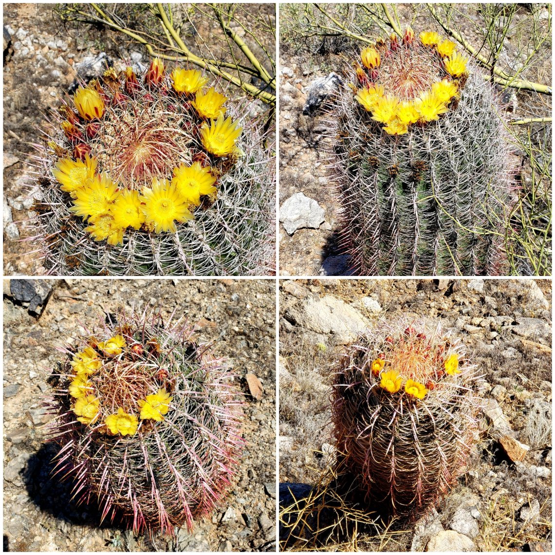The Compass Barrel can grow up to 5 feet high and have up to 30 ribs with very rigid spines.The Compass Barrel was the most common barrel cactus that I encountered. Beautiful yellow flowers that bloom like a halo or wreath are found around the top.Many times when I came upon a Compass Barrel they had yellow fruit where the flowers would blossom and these had been eaten by critters.