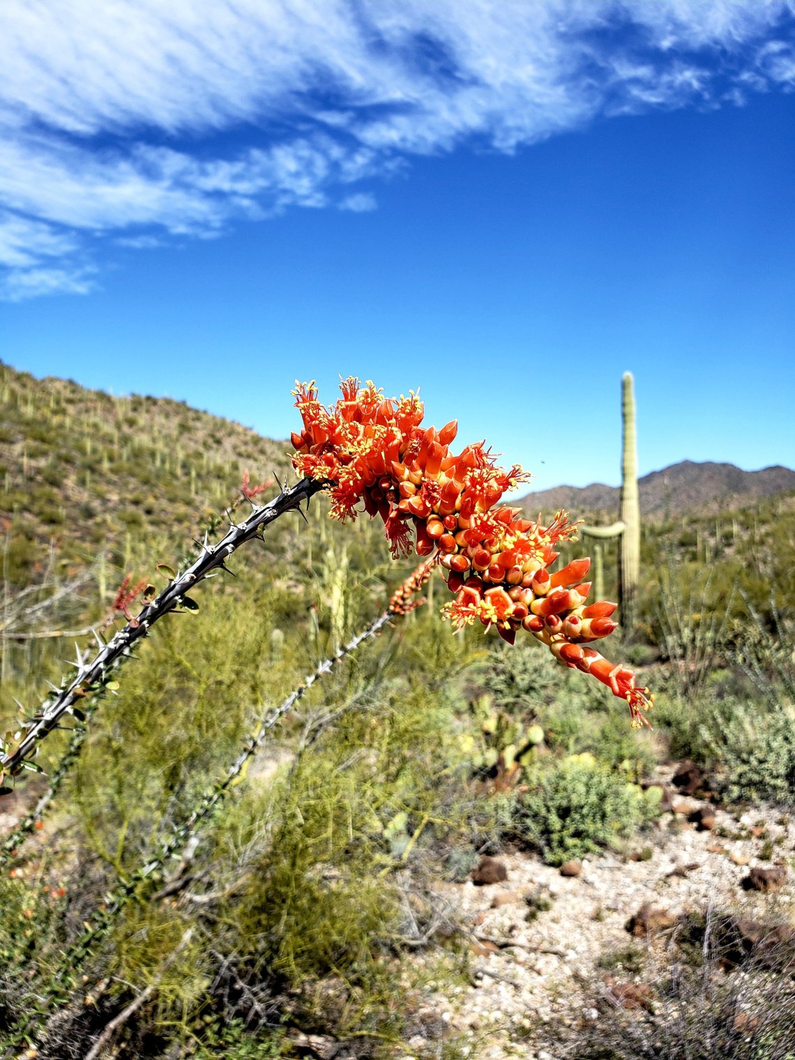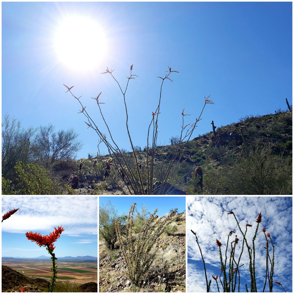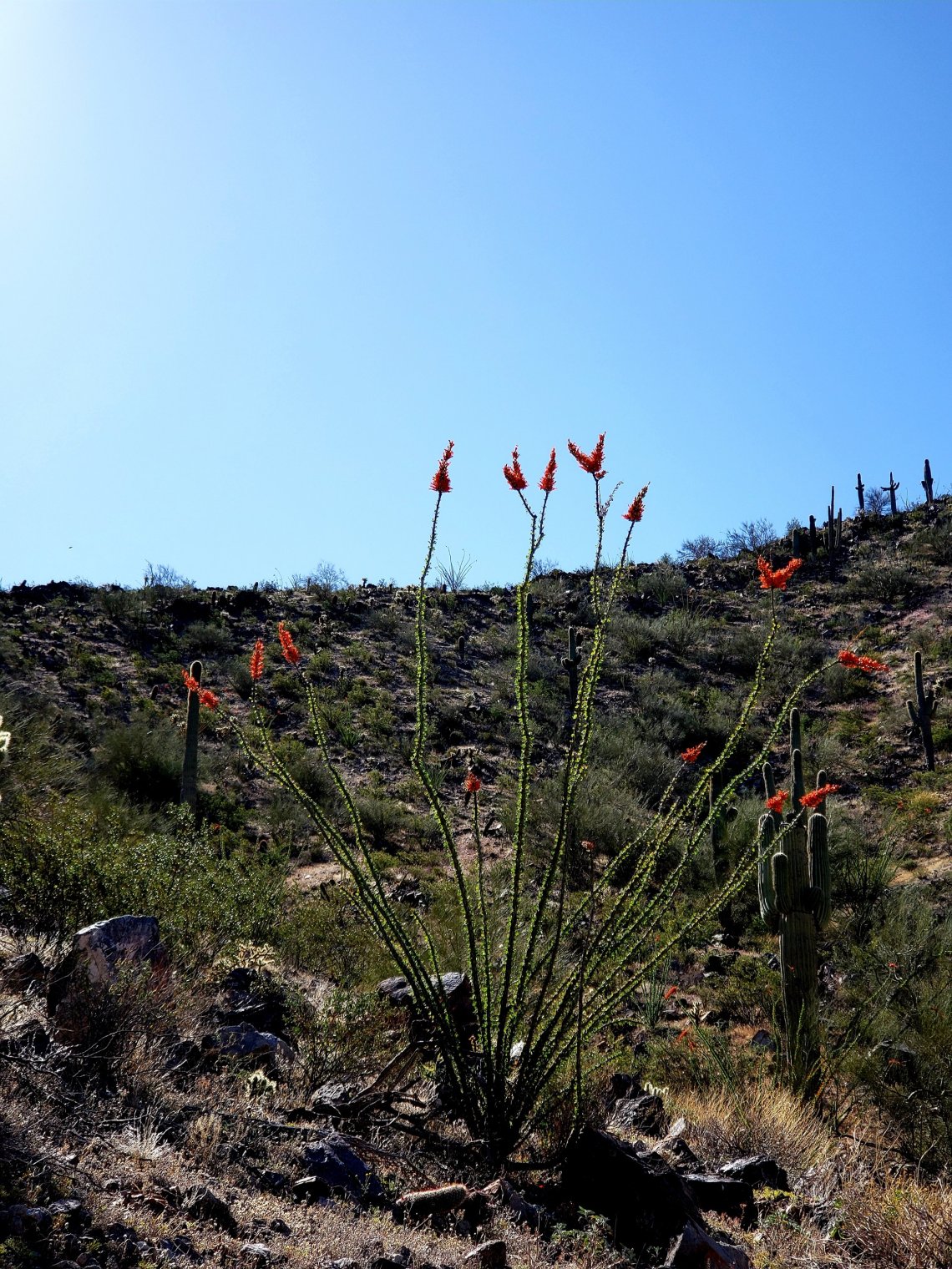 The flower of the Ocotillo was one of the first to bloom here. It is a flame-shaped orange-red cluster of flowers that blossomed at the end of each long stem.