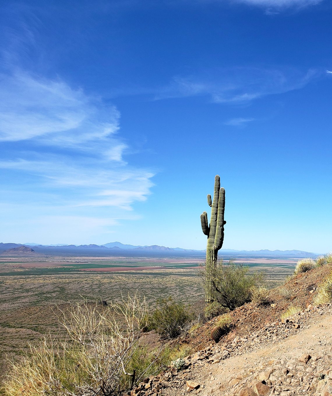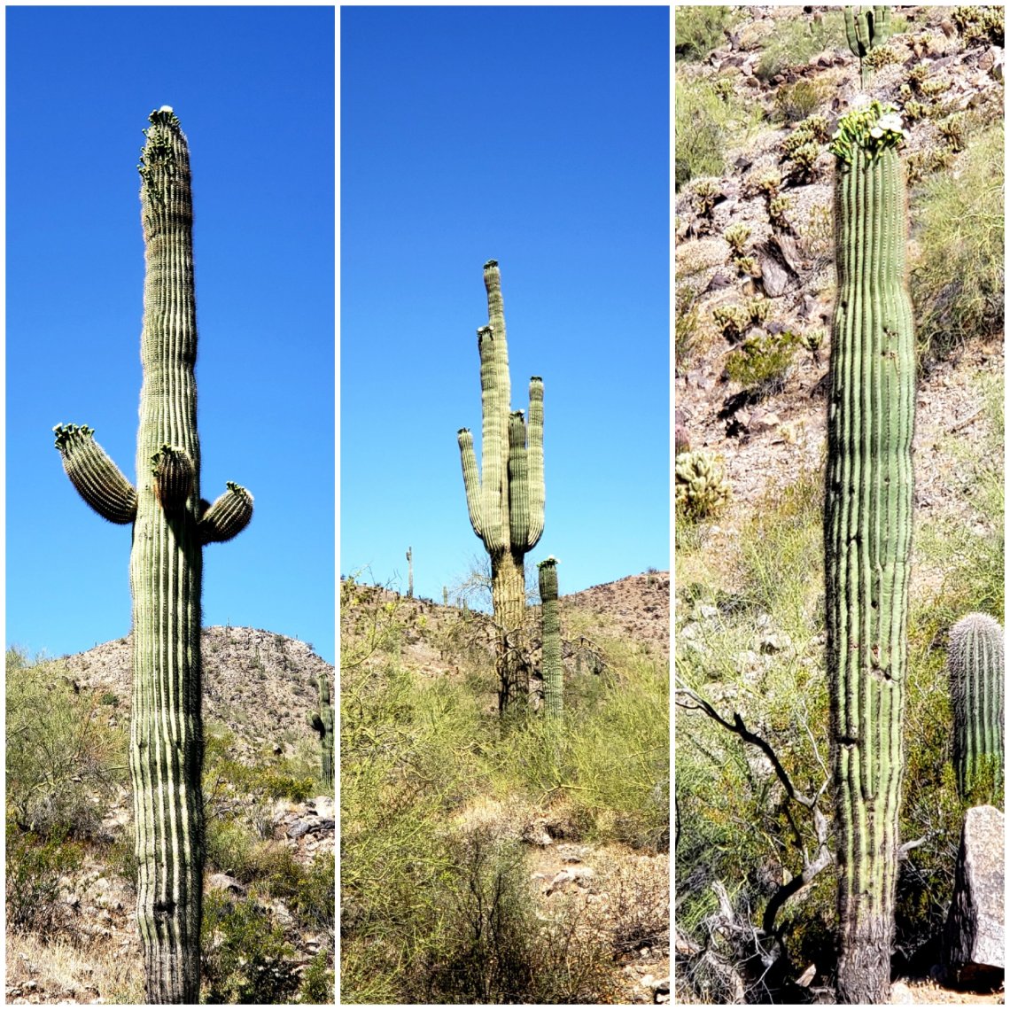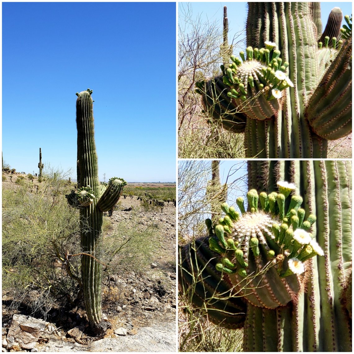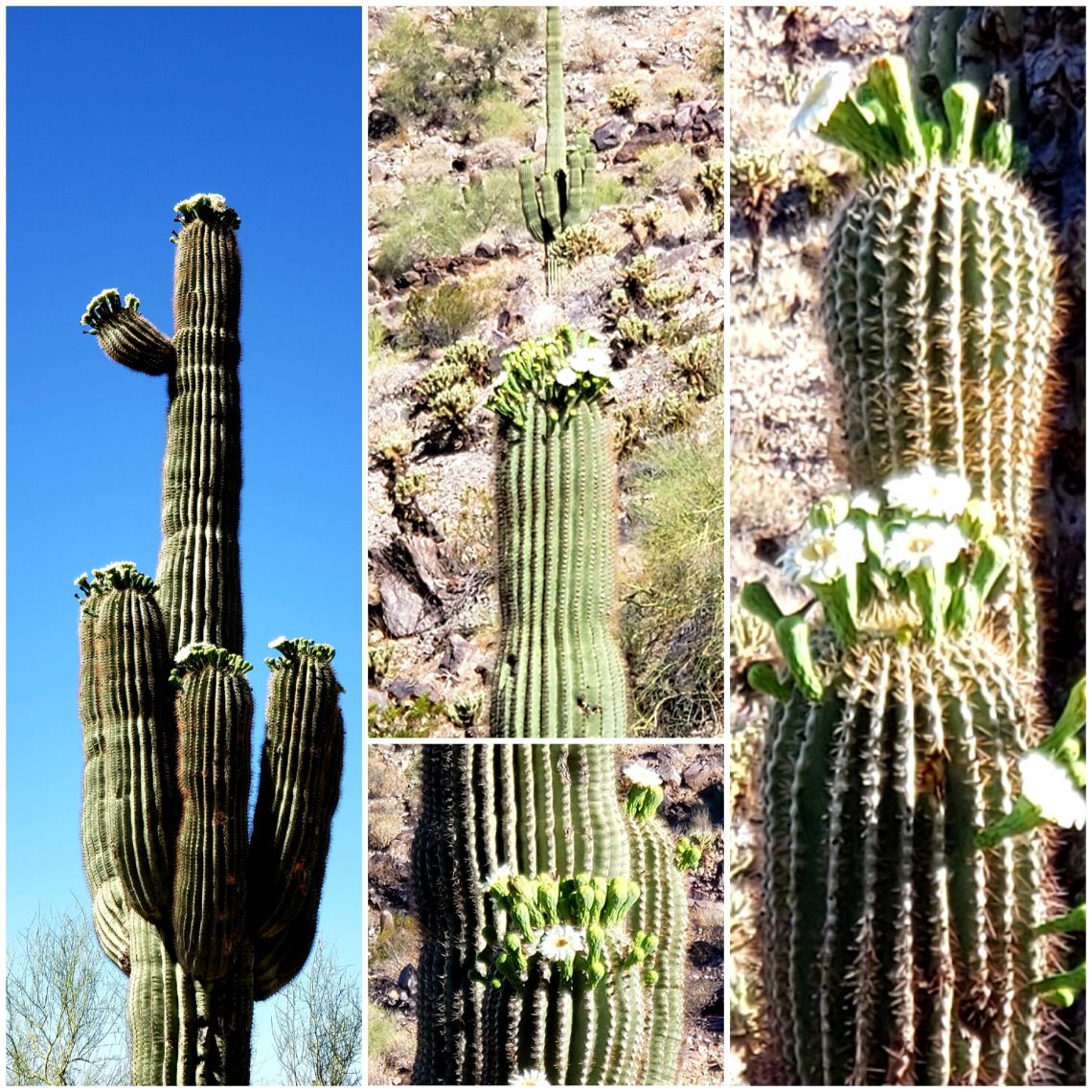 Hello and greetings from Arizona! It has been a while since I last blogged. I have been staying put as we all have for the past few months due to the Coronavirus outbreak and stay at home orders, with the exception of hiking that is.I am currently in Casa Grande, Arizona. This is also where I spent February of 2019. This year I arrived in February 2020 and decided to stay until the cacti bloom. I am so glad that I did.Upon purchasing my Cactus of Arizona Field Guide, I soon found out there are many species of cactus. Each with it’s own unique features. I am excited to share with you some of the cactus I have followed for the past few months.It’s amazing to me that a plant that is covered with those big thorns (spines) can survive and endure the conditions of the Arizona desert.If you look beyond the outside of any cactus, you will be able to find the beauty in the them.Before I begin I would like to share with you some specifics about the cactus itself so you may better understand the meanings of the words I use to describe them.Spines – These are the actual sharp pointed outgrowth on a cactus, sort of like a thorn.Branch or Stem – A supporting part of the plant growing from the trunk of the cactus.Trunk or Taproot – Some cactus are supported by a trunk and others that grow close to the ground are supported by taproot which is the primary vertical descending root of a plant.Flowers – To bloom or produce a flower or flowers is a means of reproduction for the cactus.Fruit – Like a pod, a ripened ovary or reproductive structure that contains one or more seeds.**** The Saguaro (suh-waa-row)This is the mightiest of all the cactus. It ranges from 10 to 50 feet in height and can live to be 250 years old. This cactus is the one that you would most associate with in an old western or John Wayne movie.