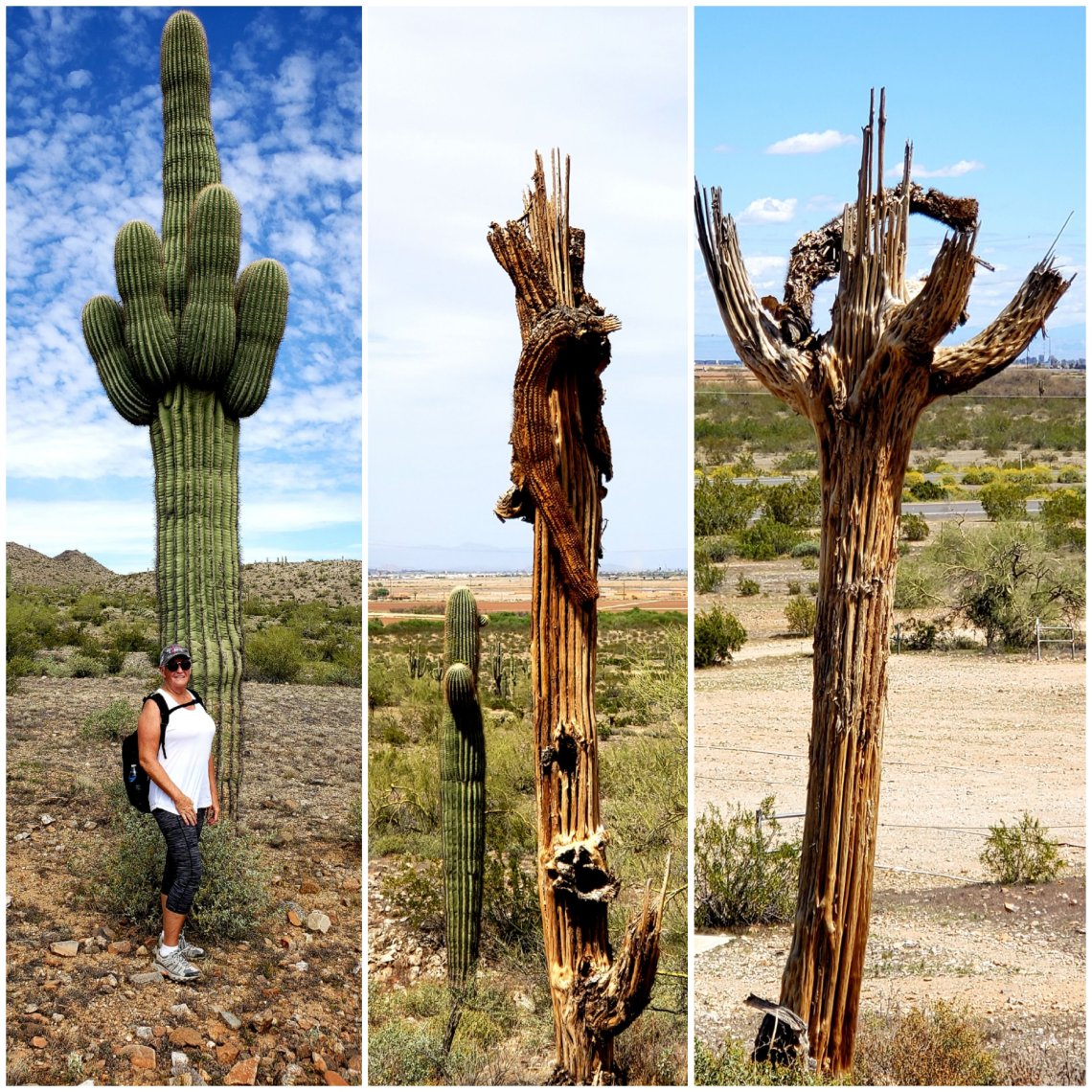The picture on the left is a healthy Saguaro and the other two on the right are of a Saguaro that has died and all that is left are the ribs of the cactus. These ribs are often used in Native American furniture.