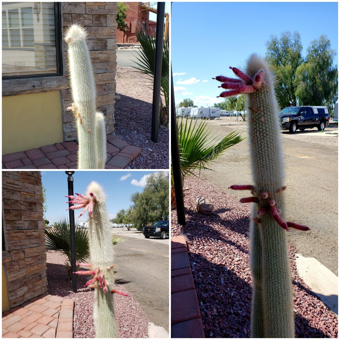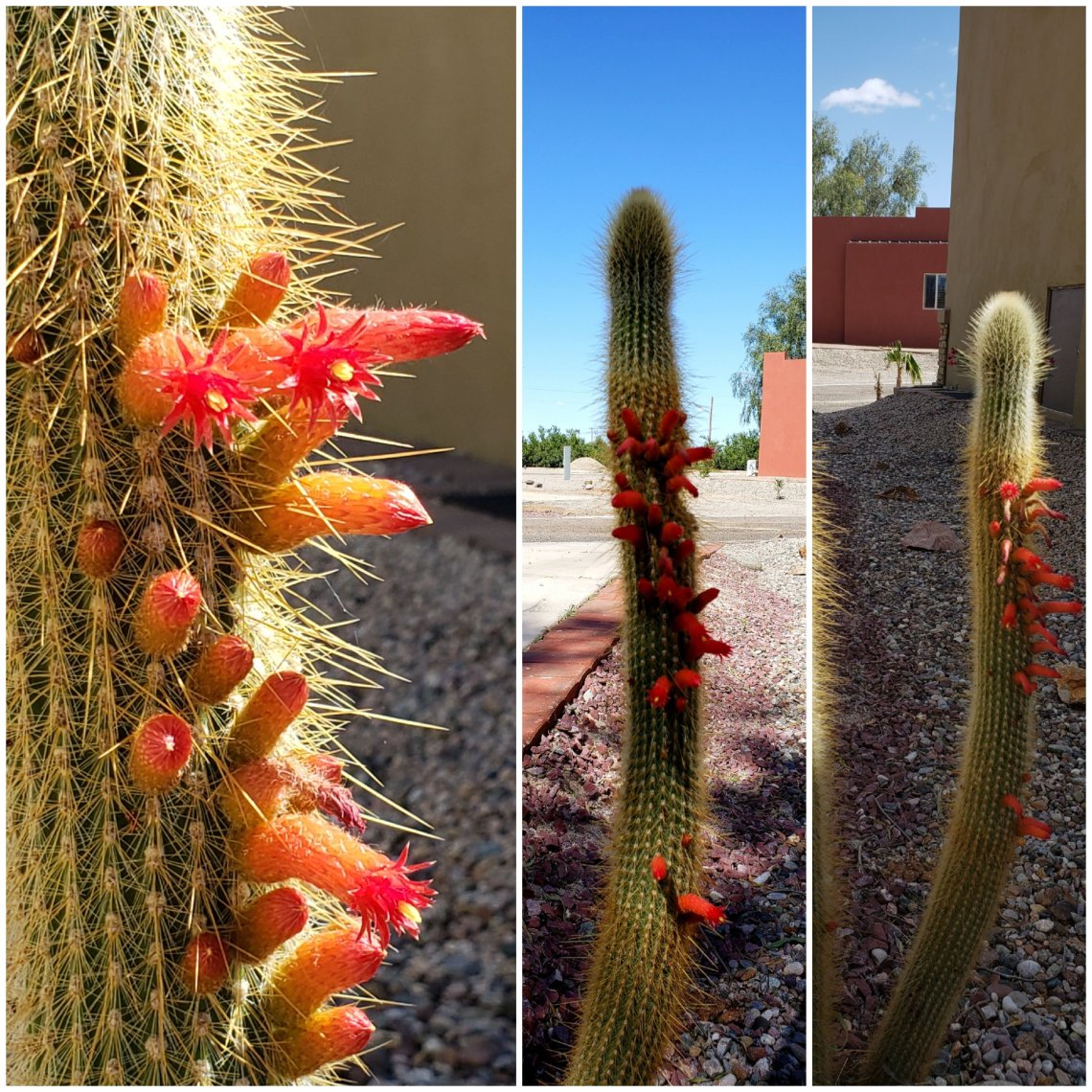 There are two of these Old Man Cactus here at the Ranch.The flowers, are very unique and are 1 to 2 inch long narrow flowers that usually bloom at night. As you can see, one old man is more pink than the other which is a red color.