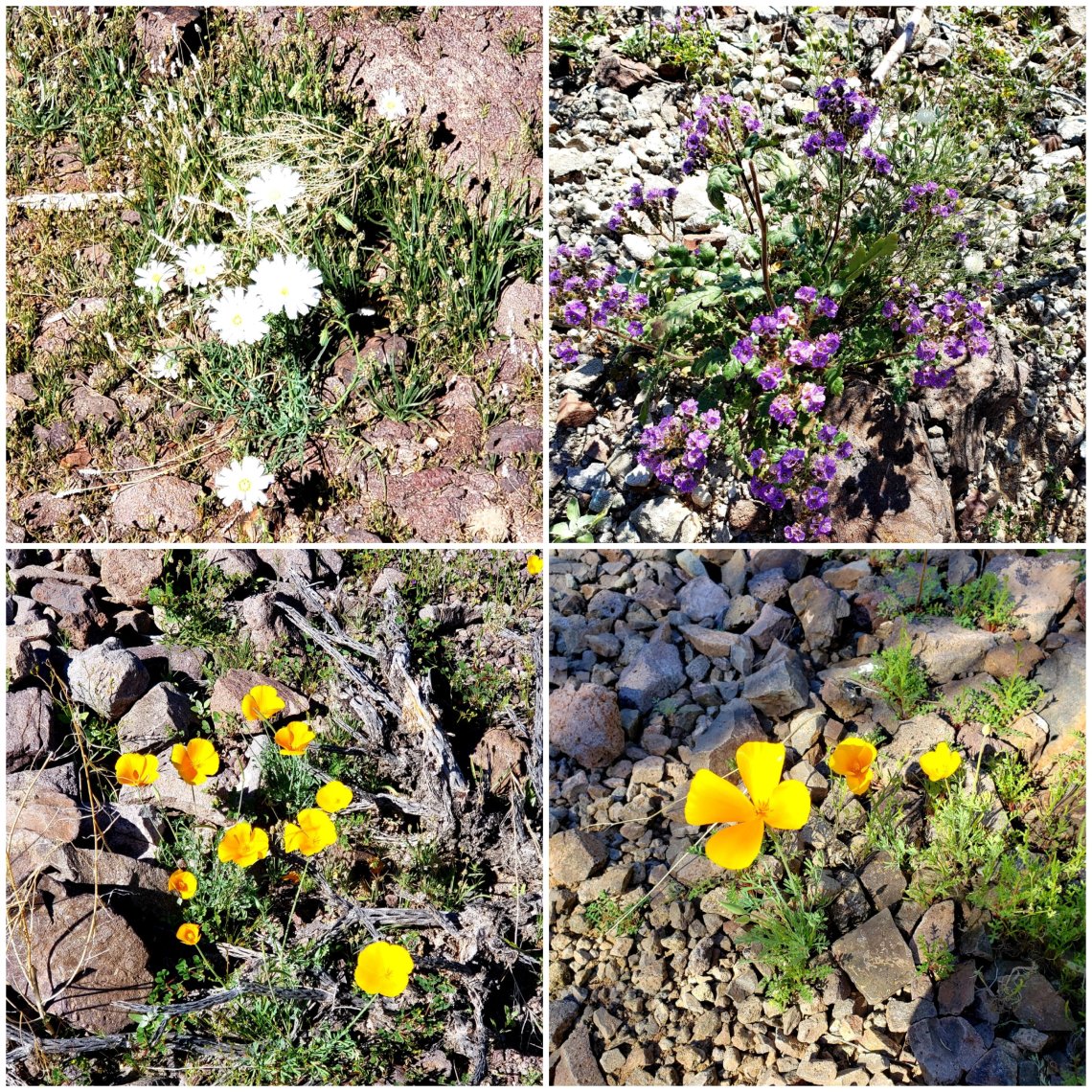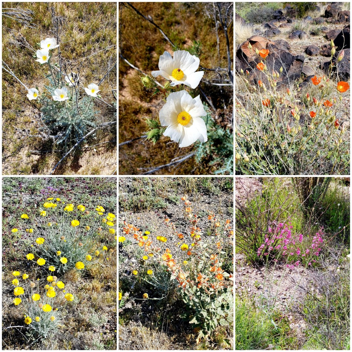 **** WildflowersSpring in Arizona brings so much color with all the varieties of wildflowers.Whether you are driving or hiking they were in abundance and beautiful to see.I do not know all of the names of the flowers that grow wild in Arizona but I do know they are amazing to see.This is what I researched and came up with:The white are Flatbud Prickly Poppies, Arizona Orange Poppy, Dainty Dogwood, Indian Mallow and a Parry’s Penstemon