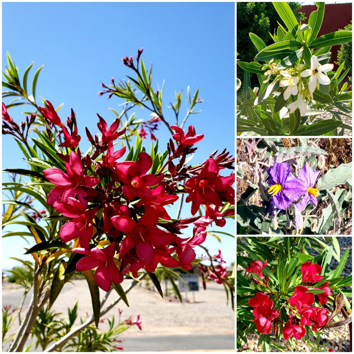 Oleanders are the red and white flowers shown below and the purple I believe is Silver-leafed Nightshade.