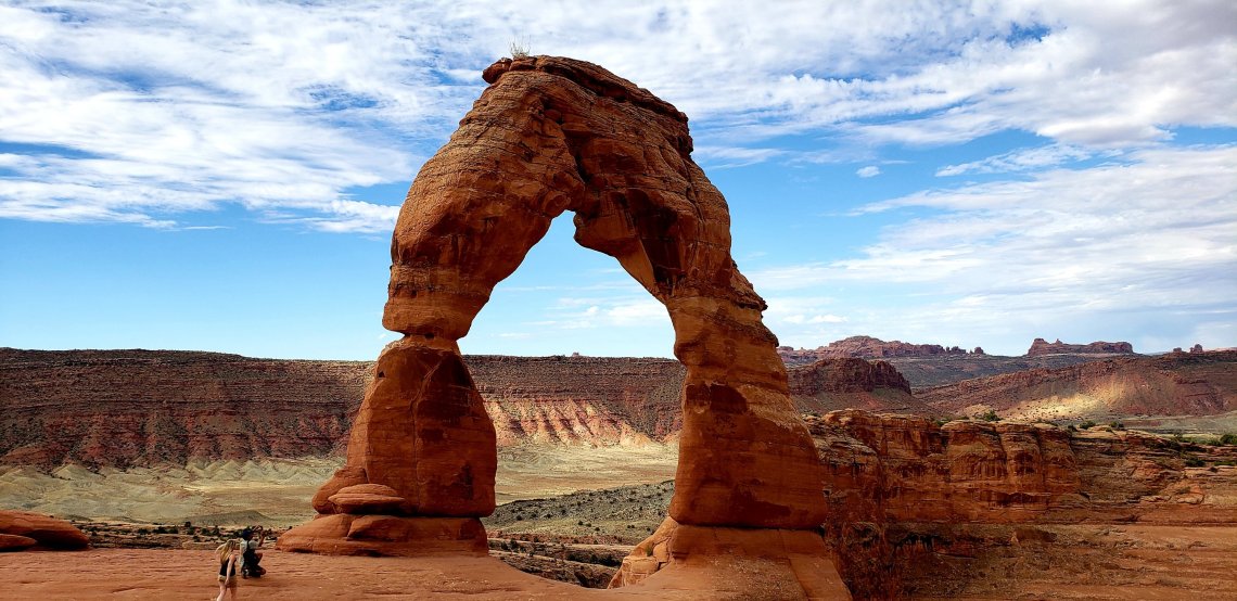 Delicate Arch is a freestanding natural arch that stands 52 feet tall.