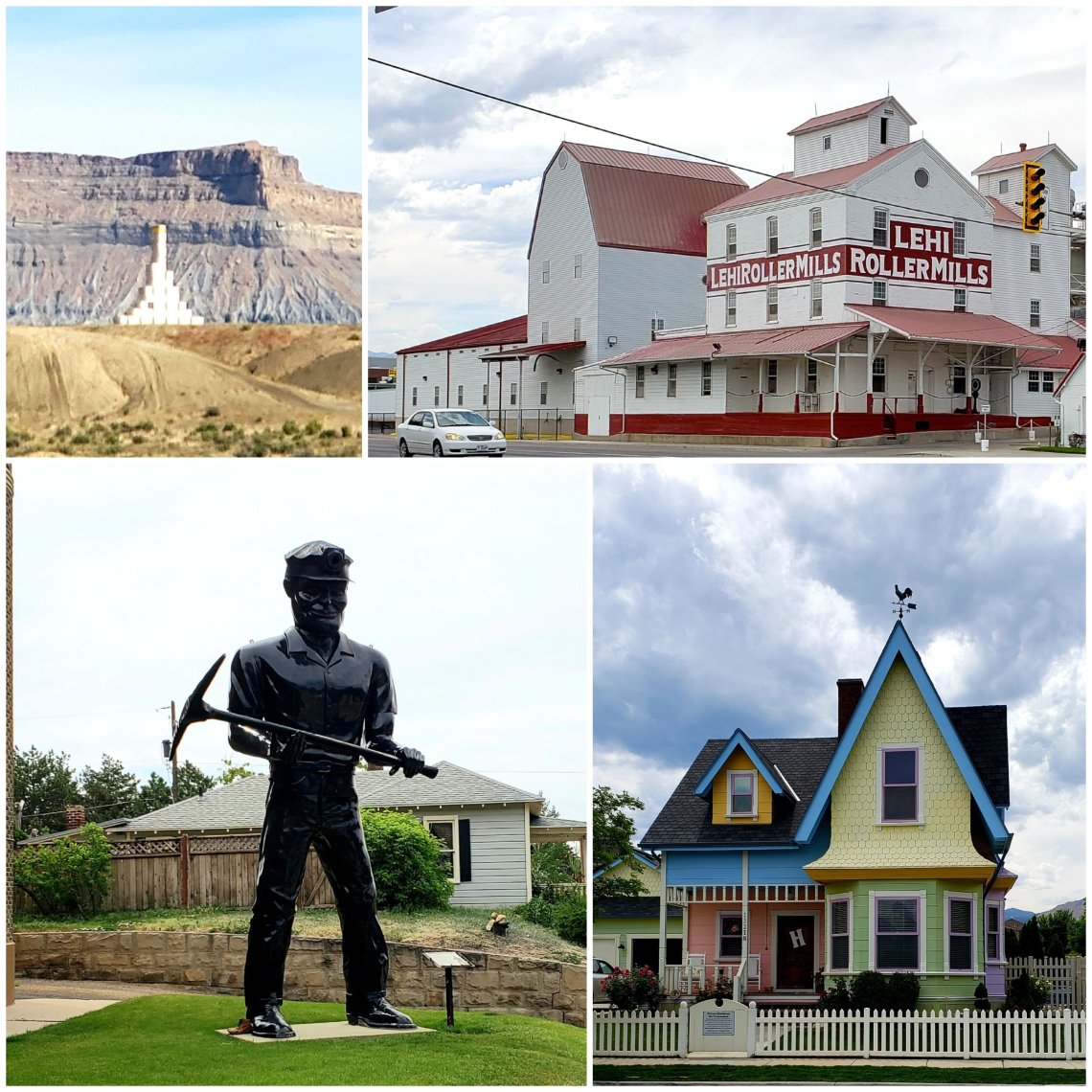 As most know, I like to seek out the oddities found on Roadside America.Top left: A 44 foot tall pile of blocks in Green River, Utah. Top right: Roller Mills from the movie “Footloose” in Lehi, Utah. Bottom left: “Big John” a glossy black 1964 coal mining Muffler Man and Bottom right: A full-size rendition of the house in Pixars UP in Herrimen, Utah.