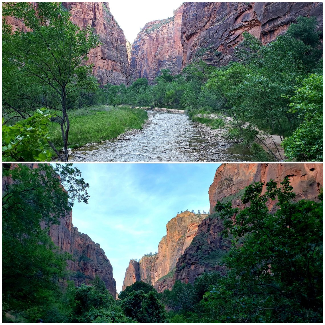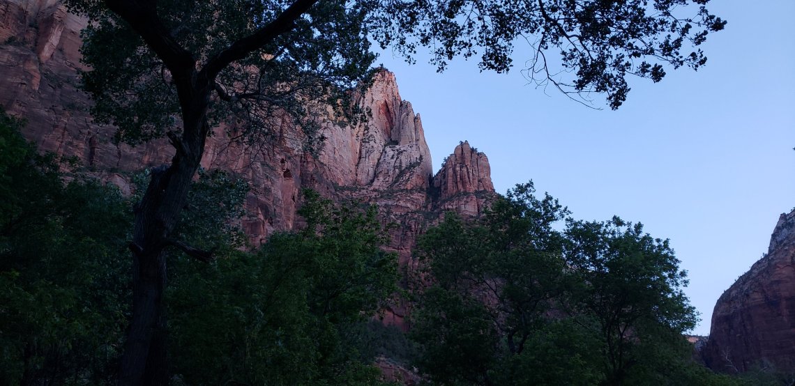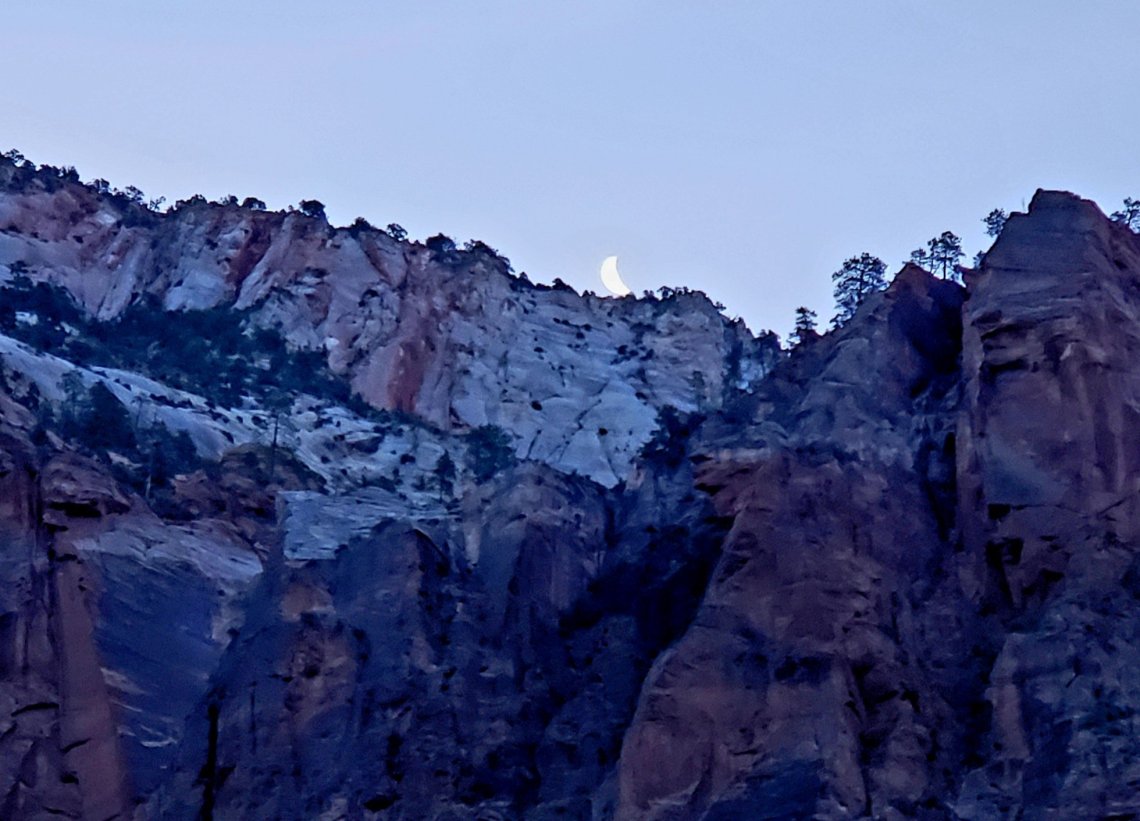 Zion is not the easiest park to get into right now. The shuttle buses are not running and if you don’t want to walk 8 miles just to take your first hike in the Narrows you better get there early!So this morning I was up at 3:30 a.m. and at 4:35 a.m. I was waiting in line to get into the park with the other 399 cars allowed in at 6 a.m.It was worth it!A crescent moon peeking over a mountain top as I wait.