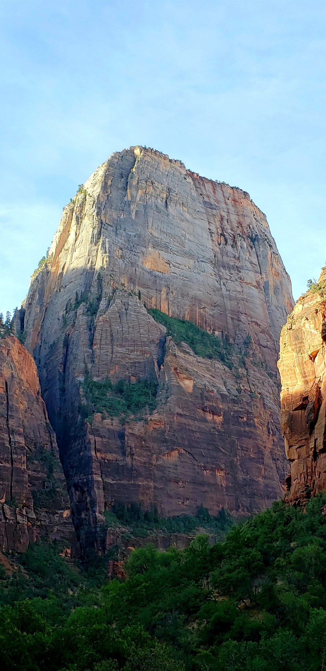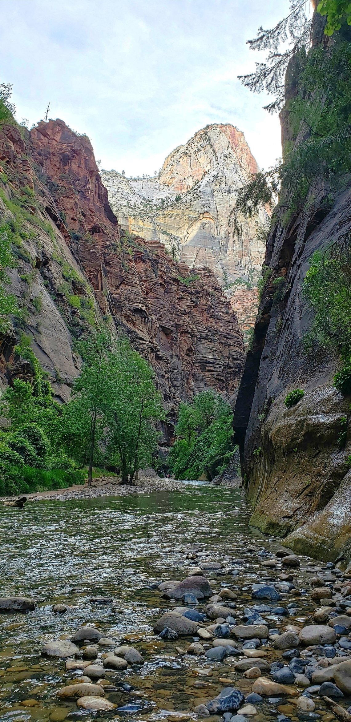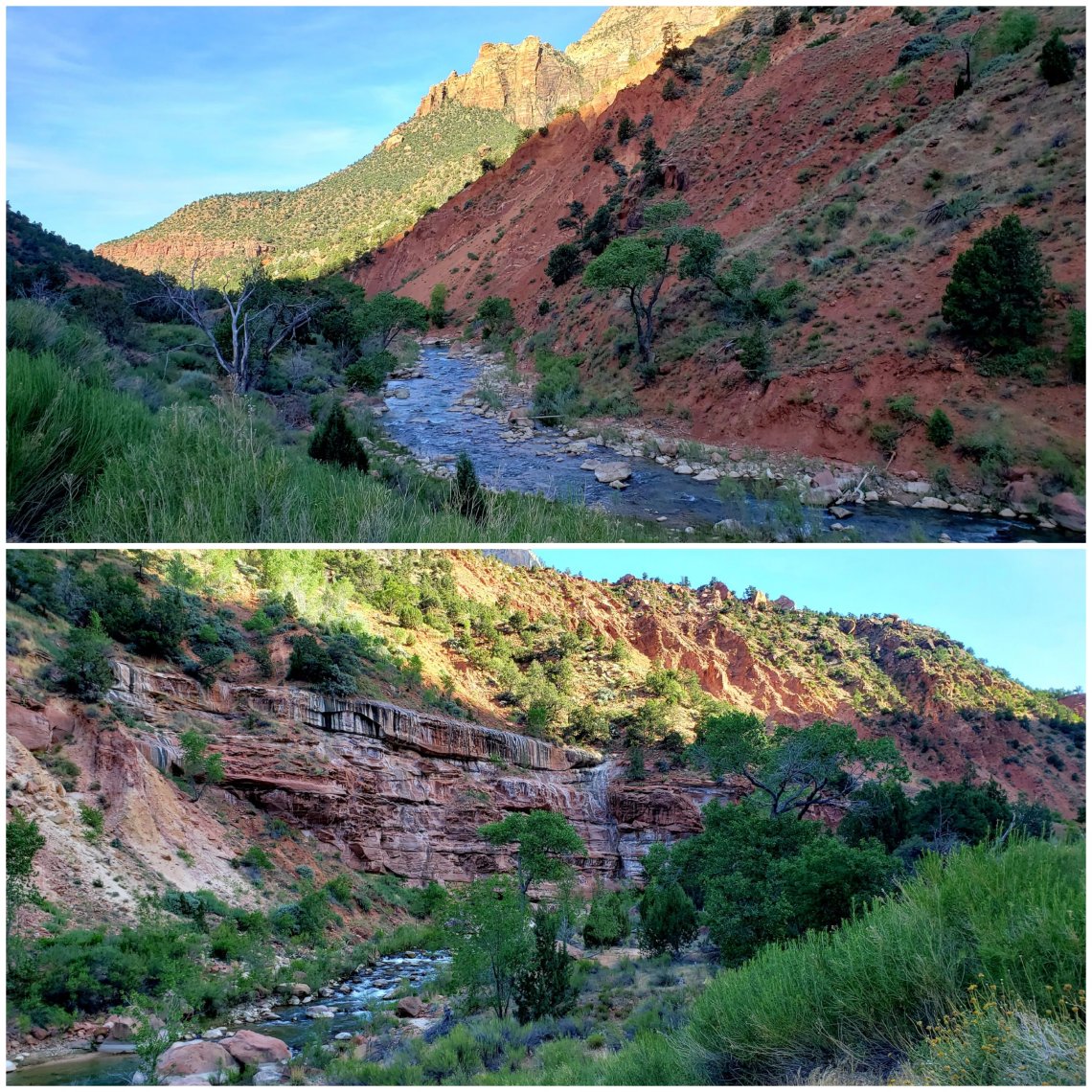 Zion is not the easiest park to get into right now. The shuttle buses are not running and if you don’t want to walk 8 miles just to take your first hike in the Narrows you better get there early!So this morning I was up at 3:30 a.m. and at 4:35 a.m. I was waiting in line to get into the park with the other 399 cars allowed in at 6 a.m.It was worth it!A crescent moon peeking over a mountain top as I wait.