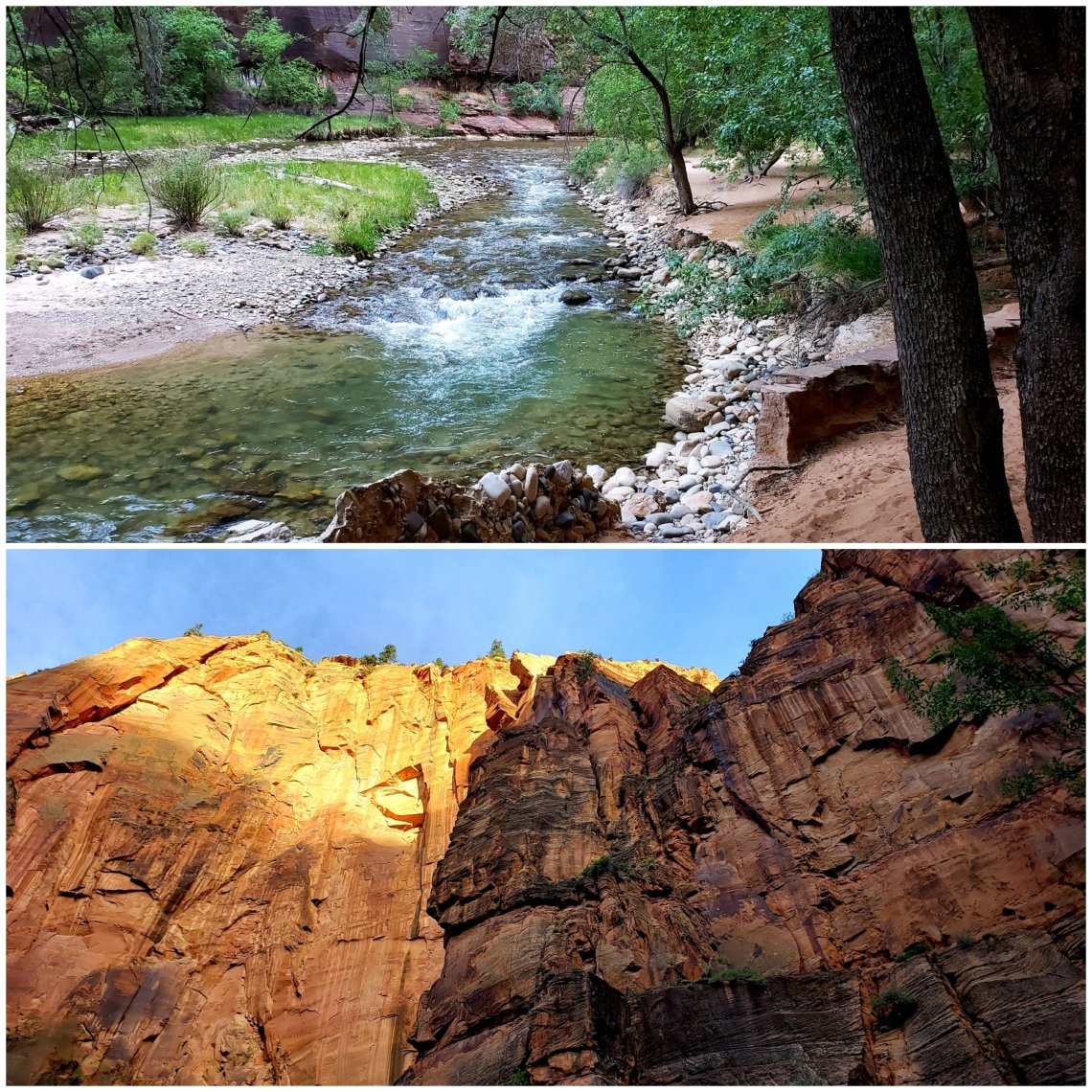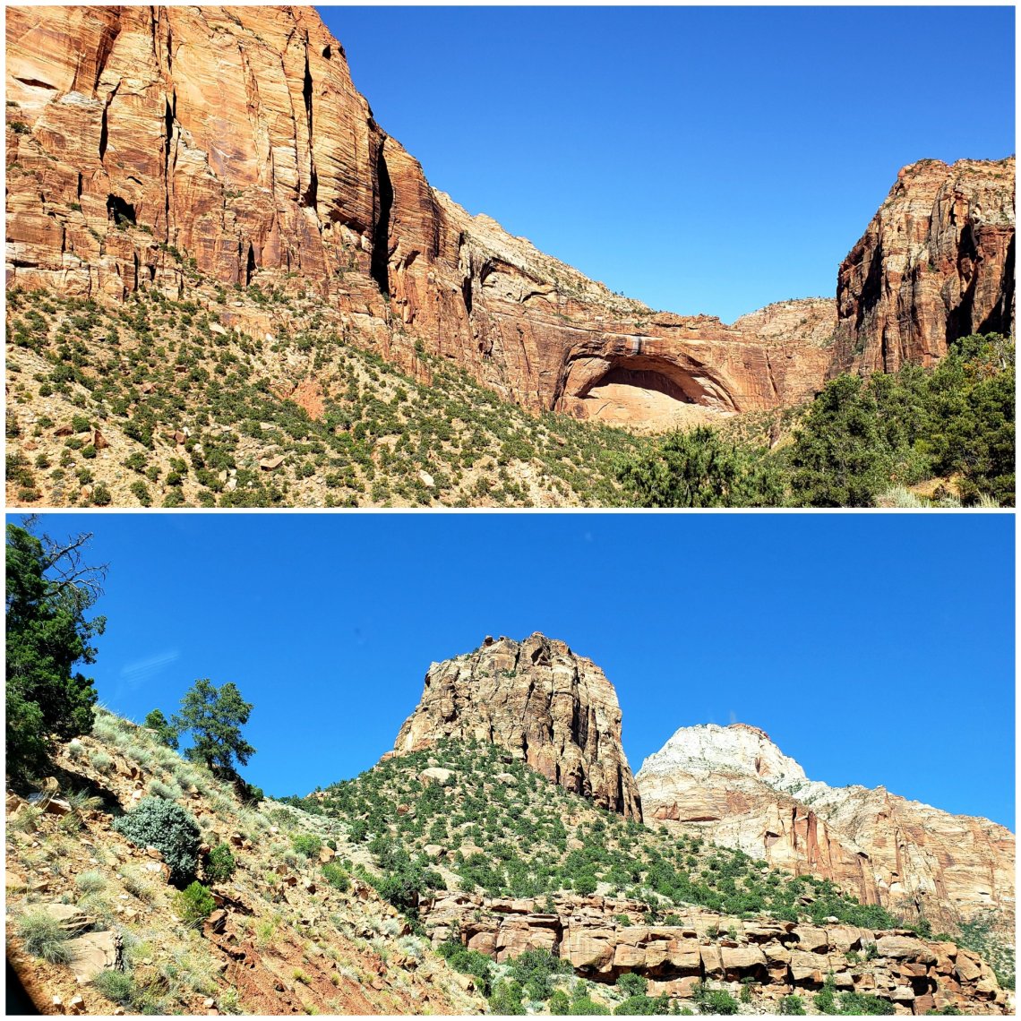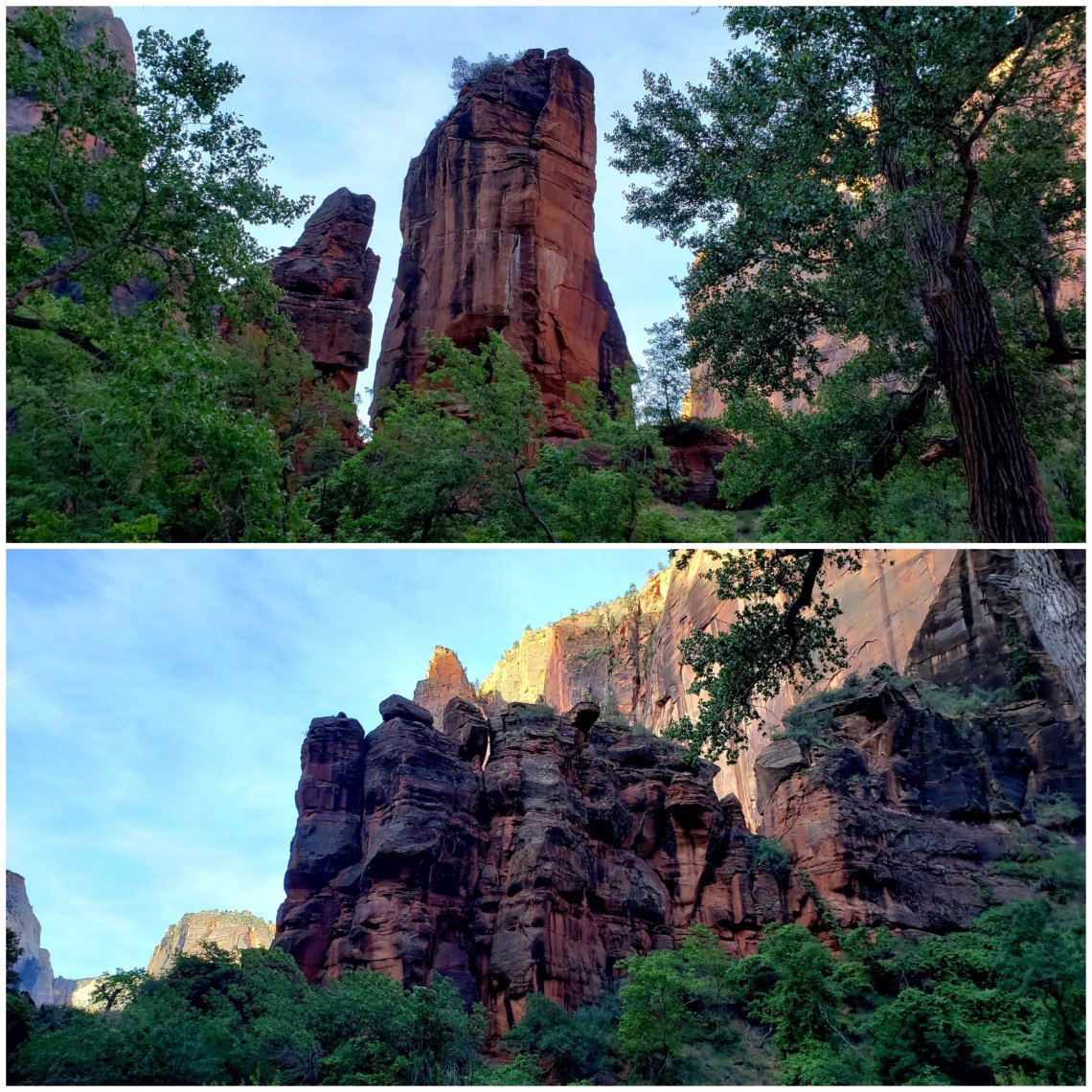 The Temple of Sinawava is the huge amphitheatre to the entrance of the Riverside Walk and the Narrows as shown above.Below are two interesting rock formations, also with “desert varnish”.