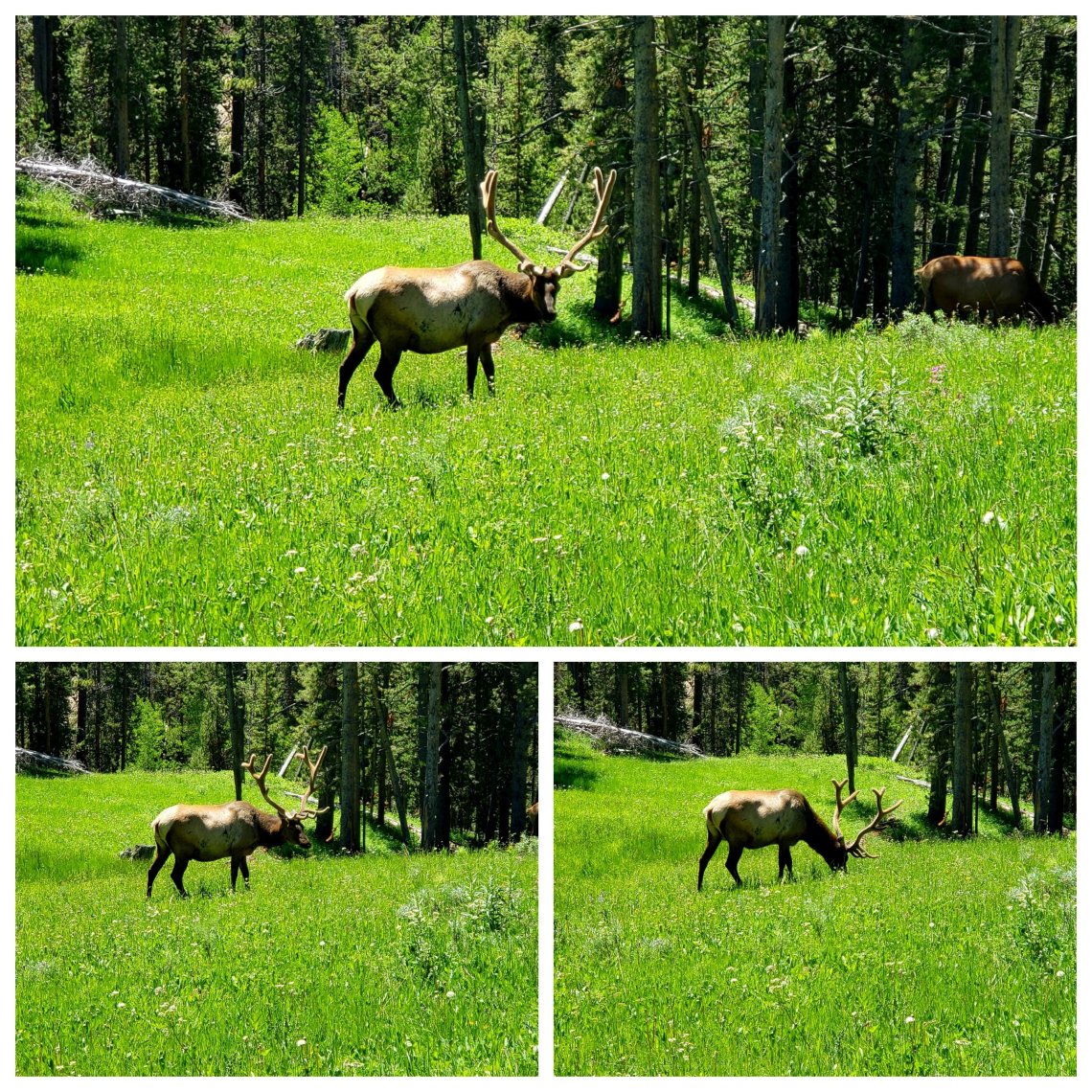 Elk along the roadside. This bull still had fuzz on his antlers.