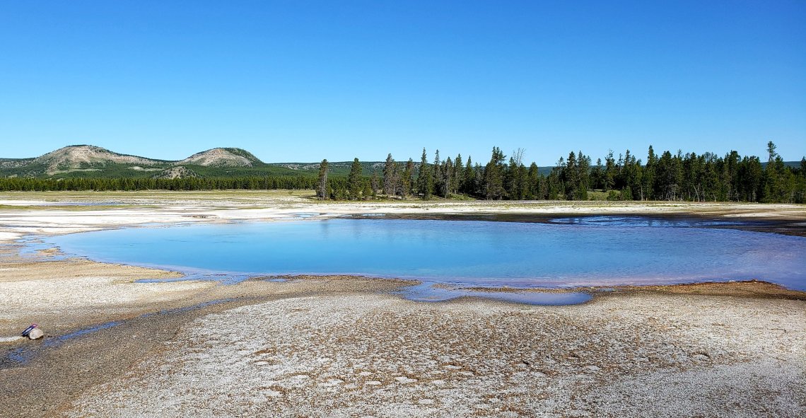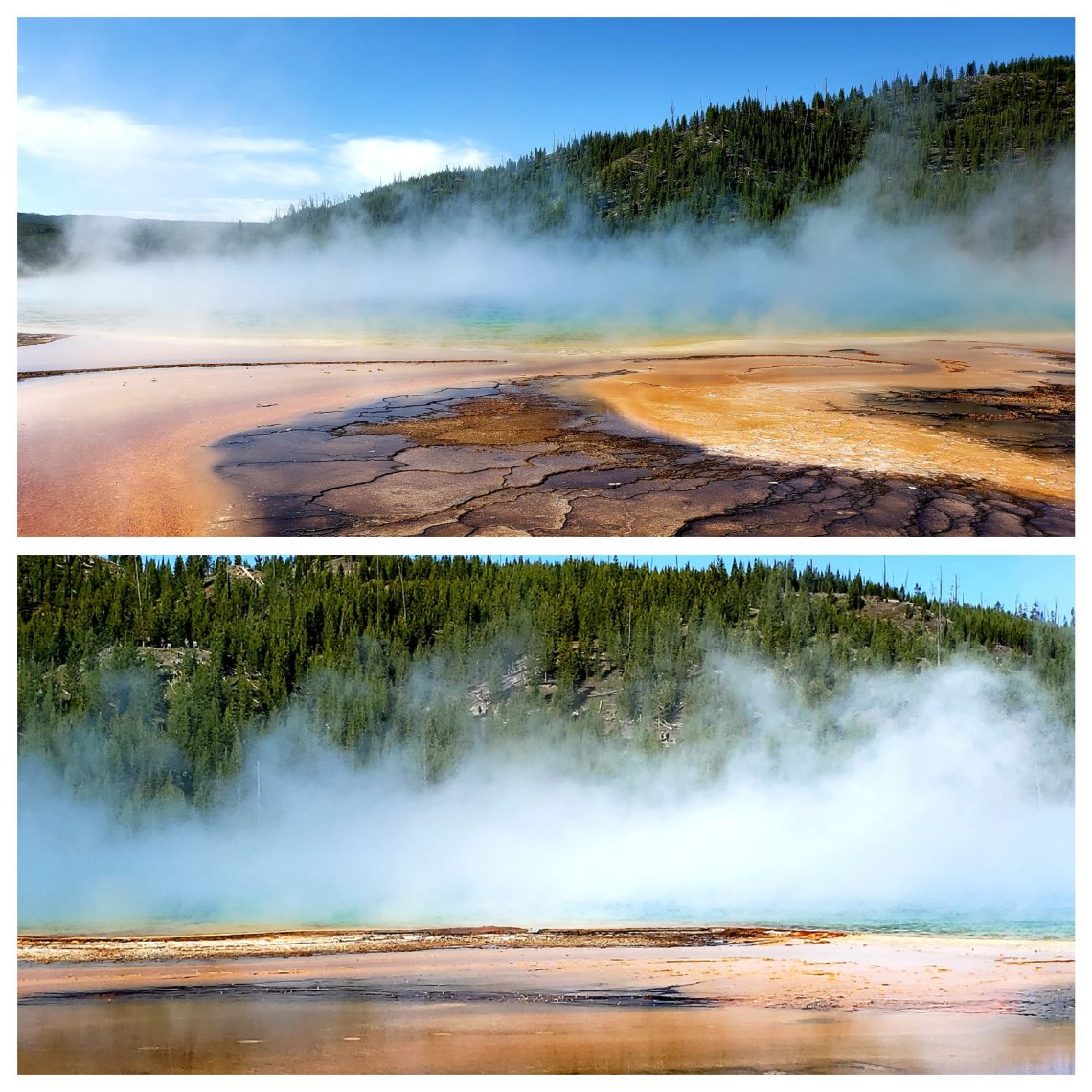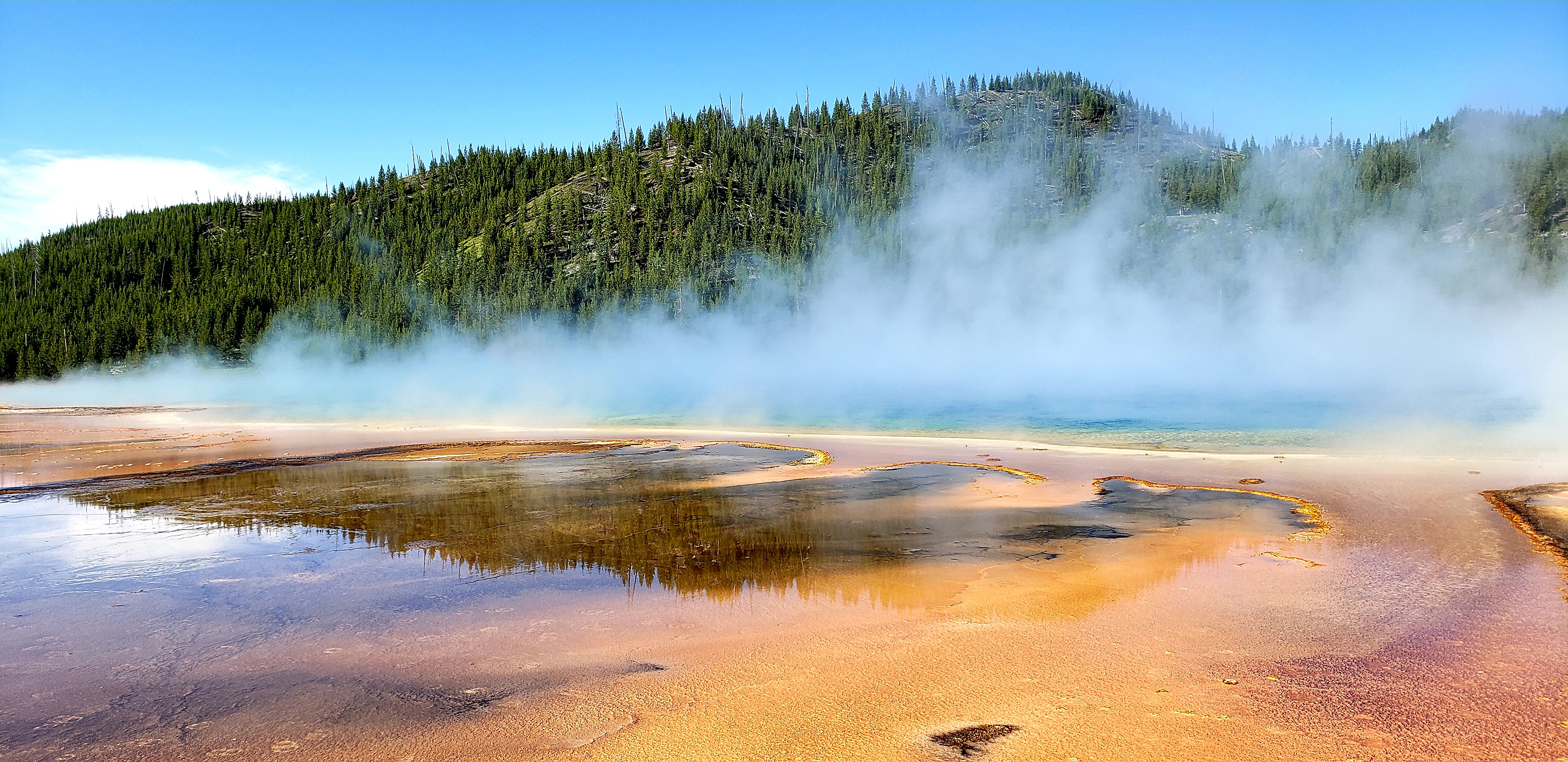 Grand Prismatic Pool is the largest of Yellowstone’s hot springs. It is 370 feet in diameter and when there is no steam due to the cool air, the pool is deep blue with yellow and orange colored thermophiles surrounding it.