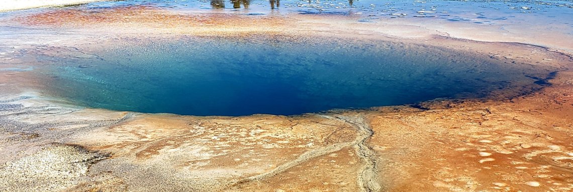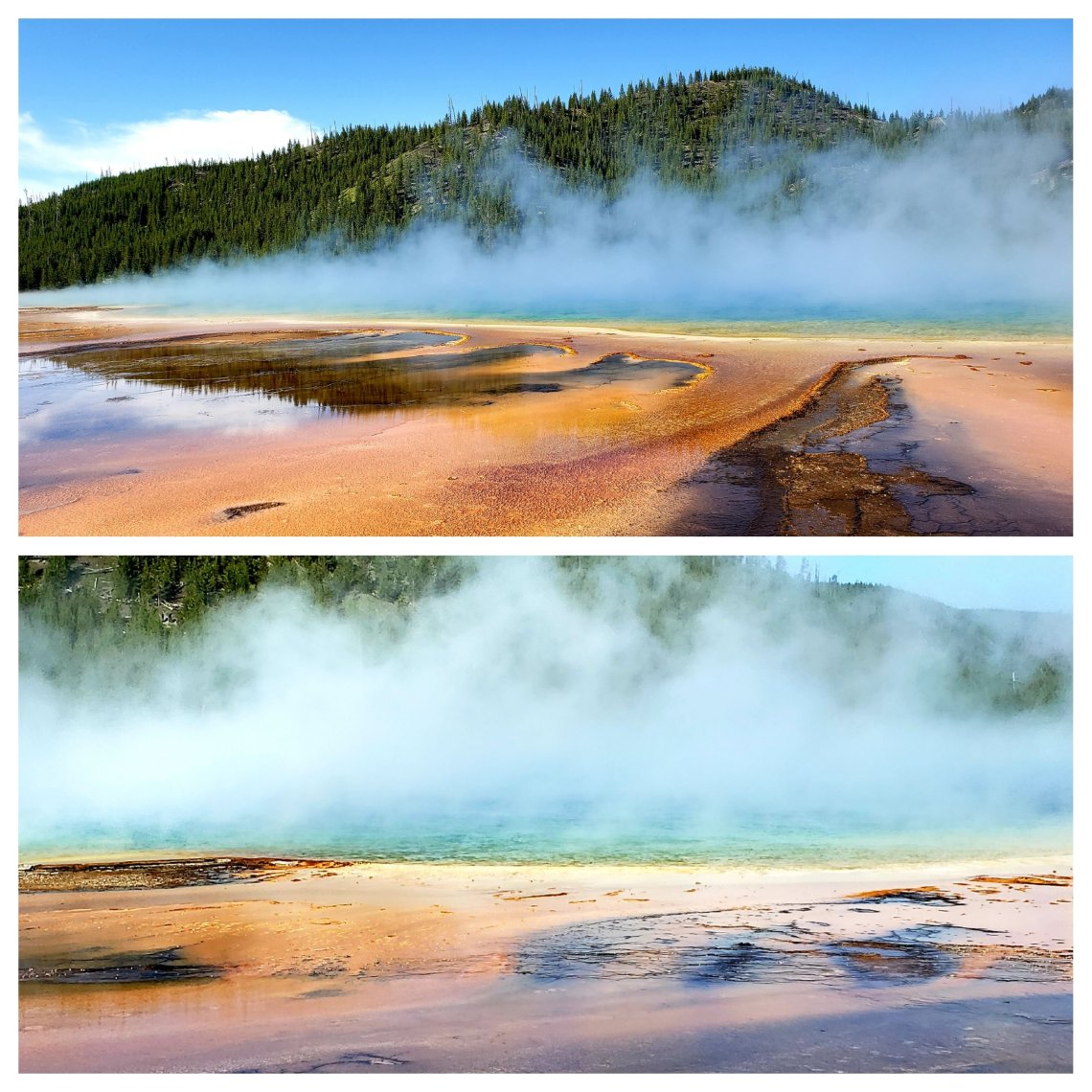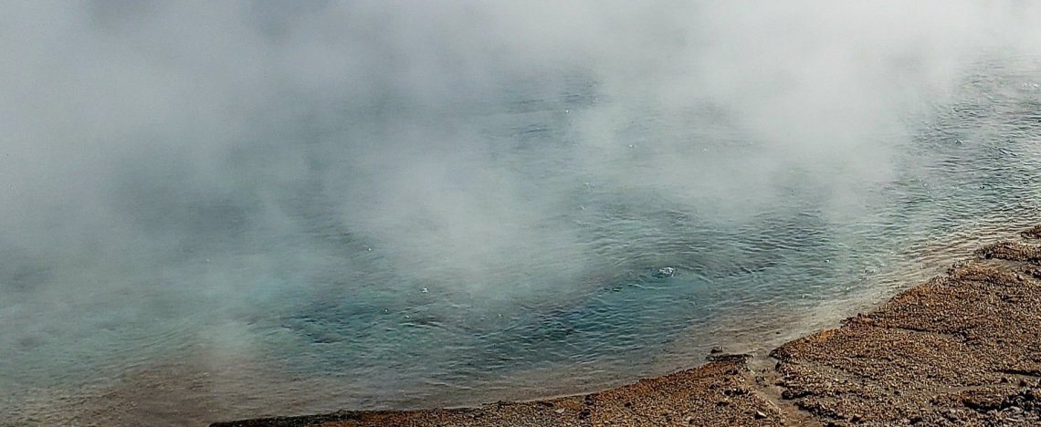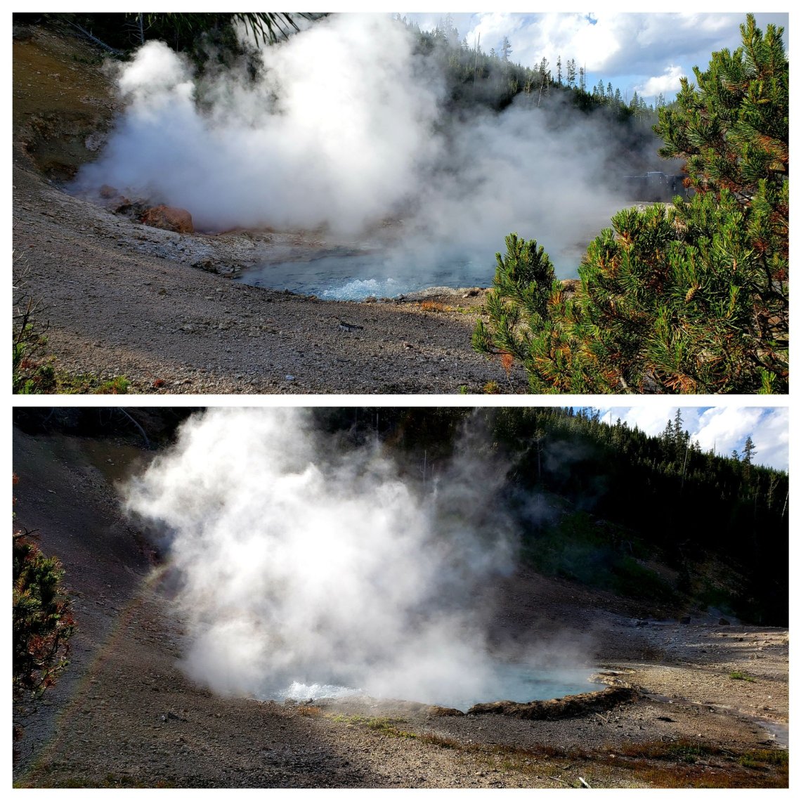 Excelsior Geyser Crater is a bright blue hot spring, can you see it boiling?