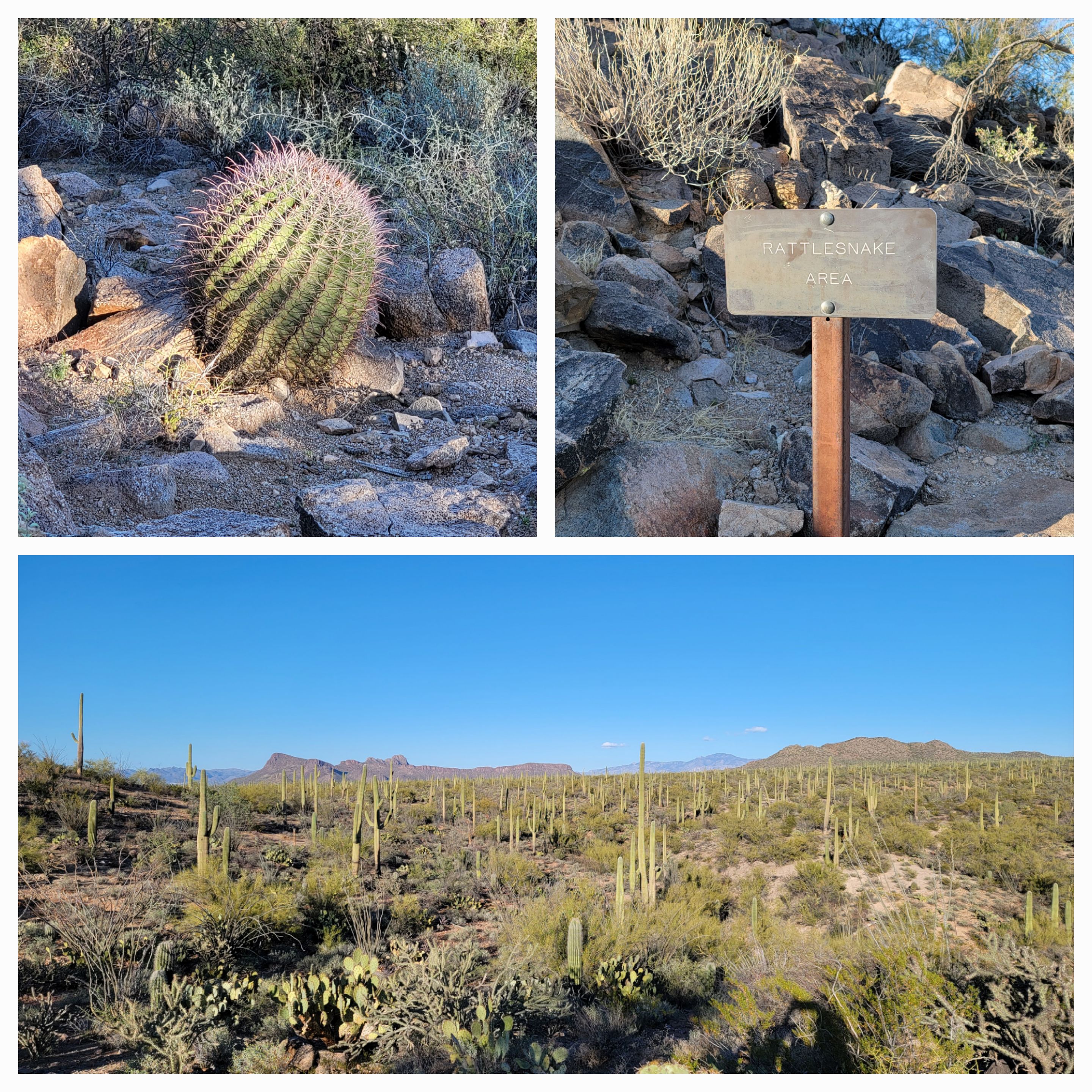 A Barrel Cactus, a warning sign and the beautiful desert floor covered in Cactus